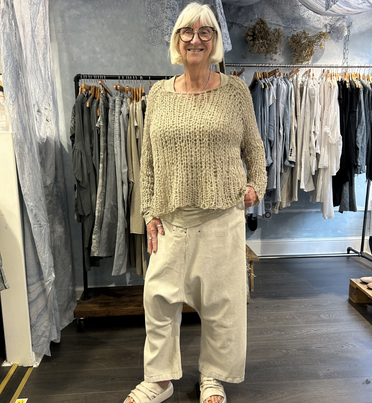 OUTFIT 2 - PAULA STYLES THE NEW ARRIVALS BLACK LABEL PULLOVER, STYLED WITH THE STRAIGHT LEG TROUSER & THE SWINGY TOP.