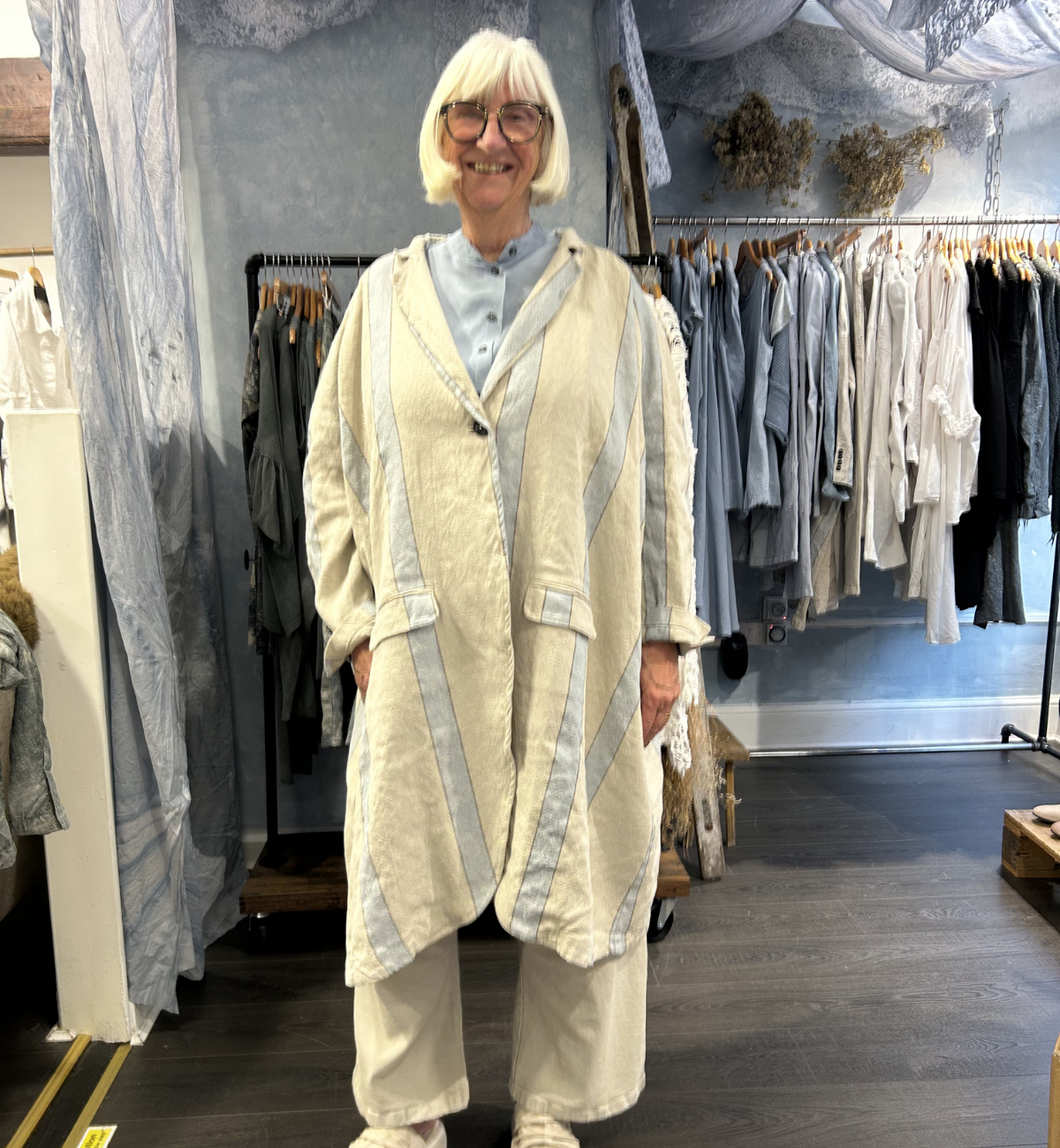 OUTFIT 1 - JILL STYLES THE RUNDHOLZ DIP JEAN IN THE LINEN FOG COLOURWAY, FINISHED WITH THE OVERSIZED COAT.