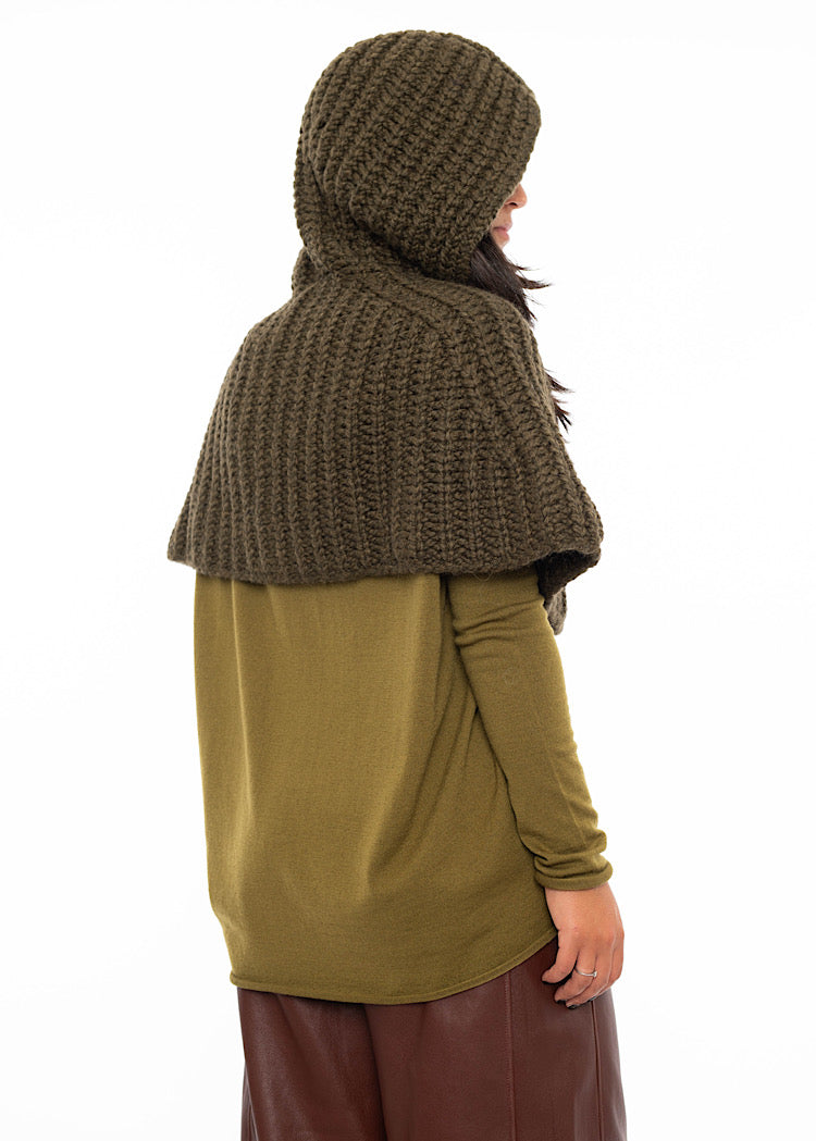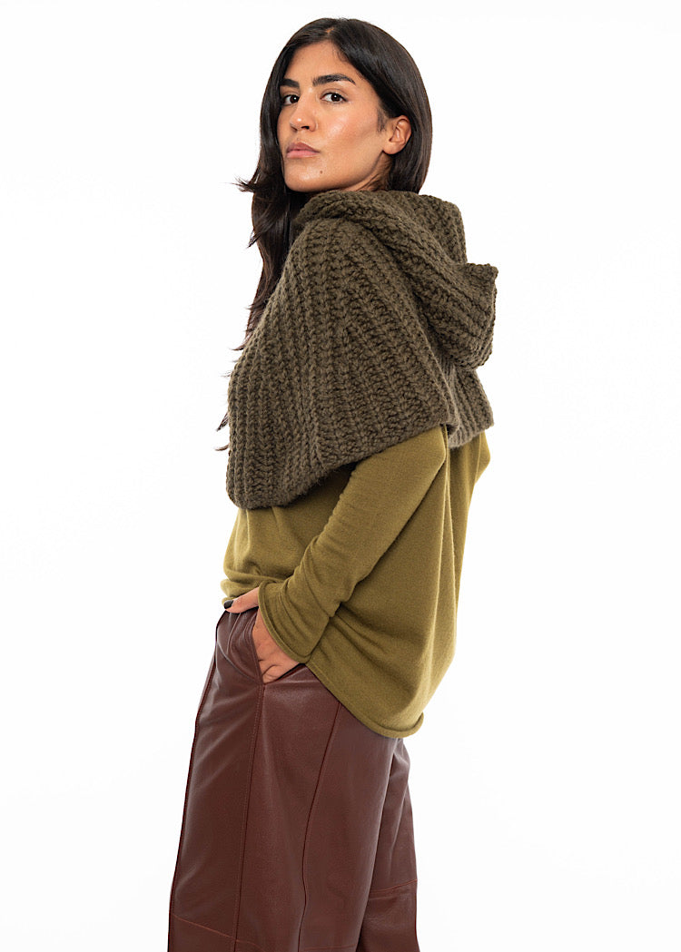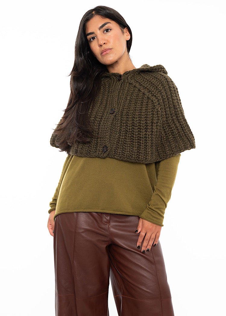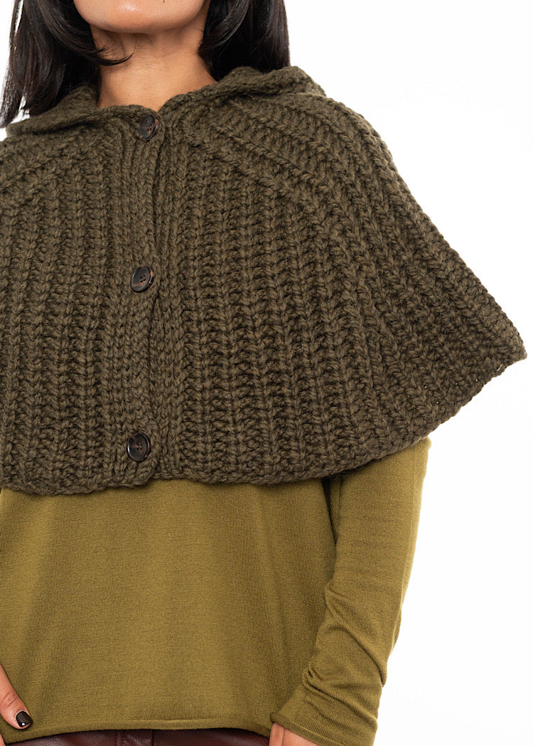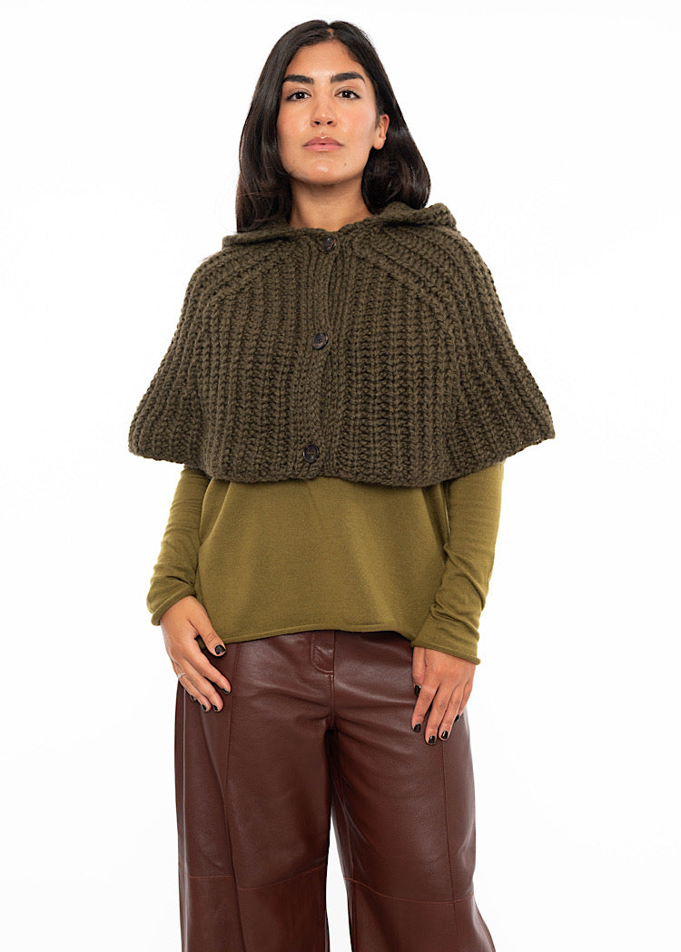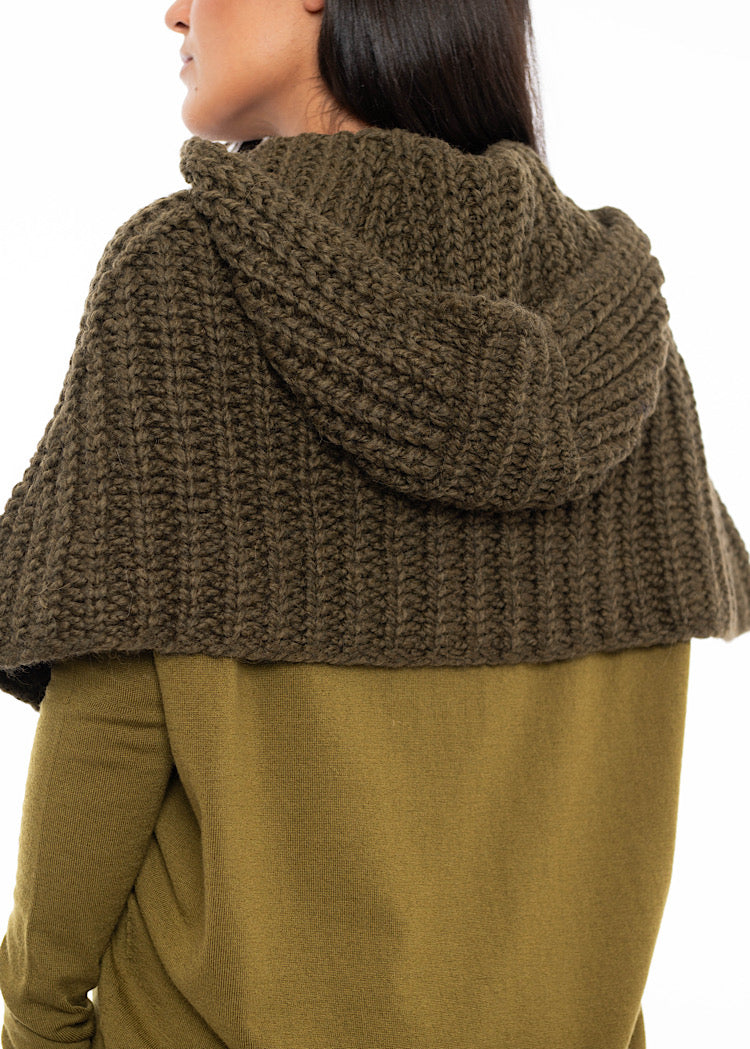 A chunky knit Wool-Alpaca mix snood from ANNETTE GÖRTZ AW25. Featuring a hood and tortoise shell buttons to fasten.