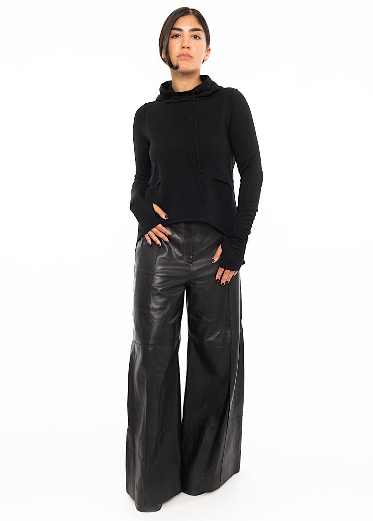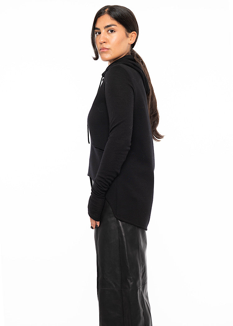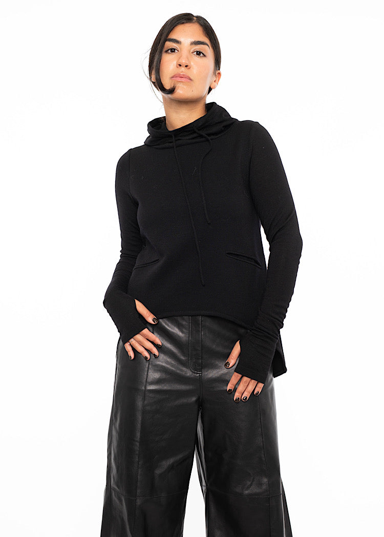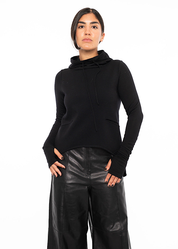 A fine knit Merino Wool pullover from ANNETTE GÖRTZ AW25. Featuring a drawstring neckline with a hood, front facing pockets and a high-low hemline. Finished in a heavy weight fabric on the body with lighter weight arms.