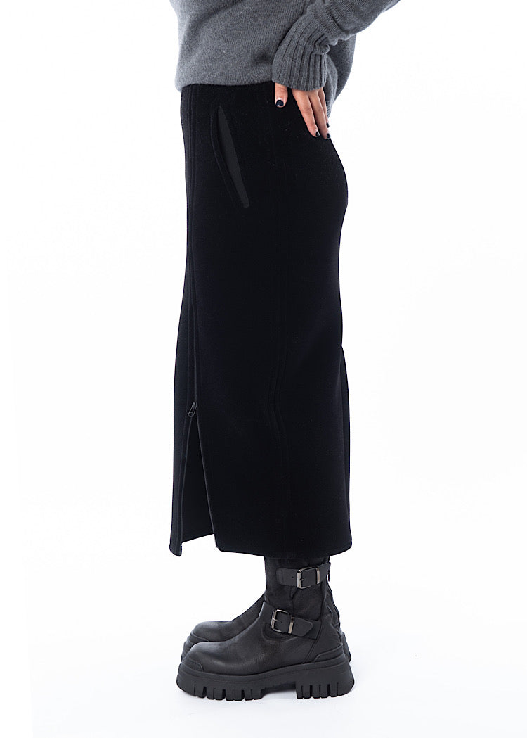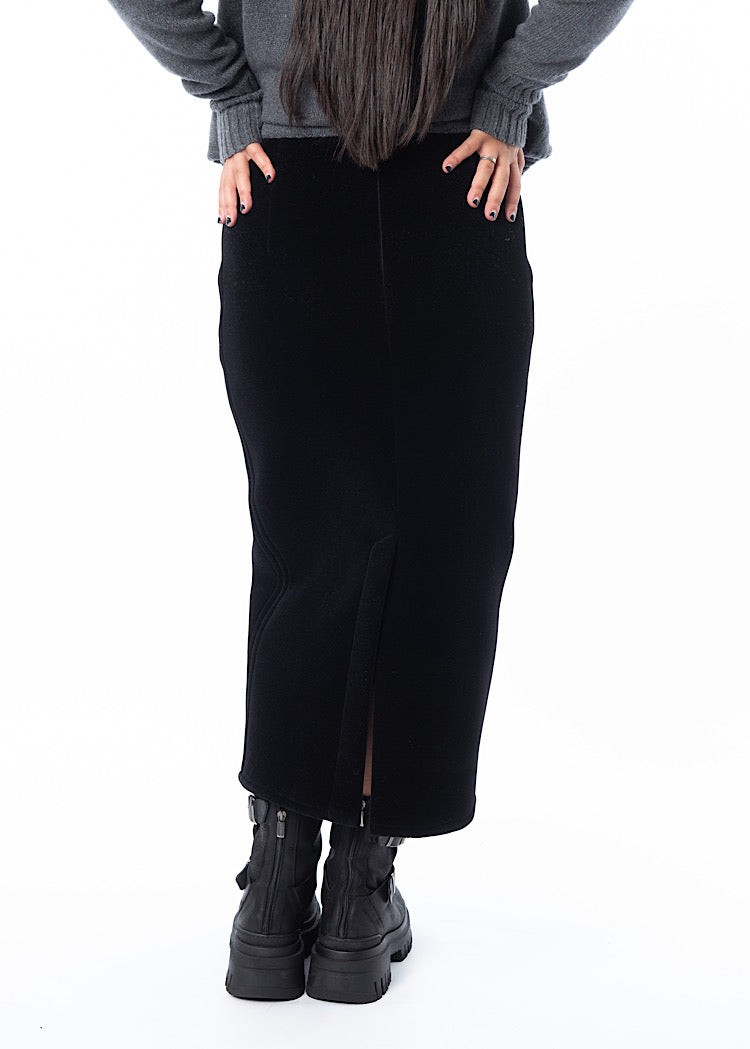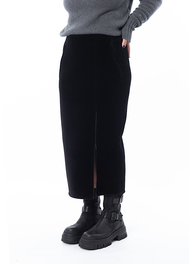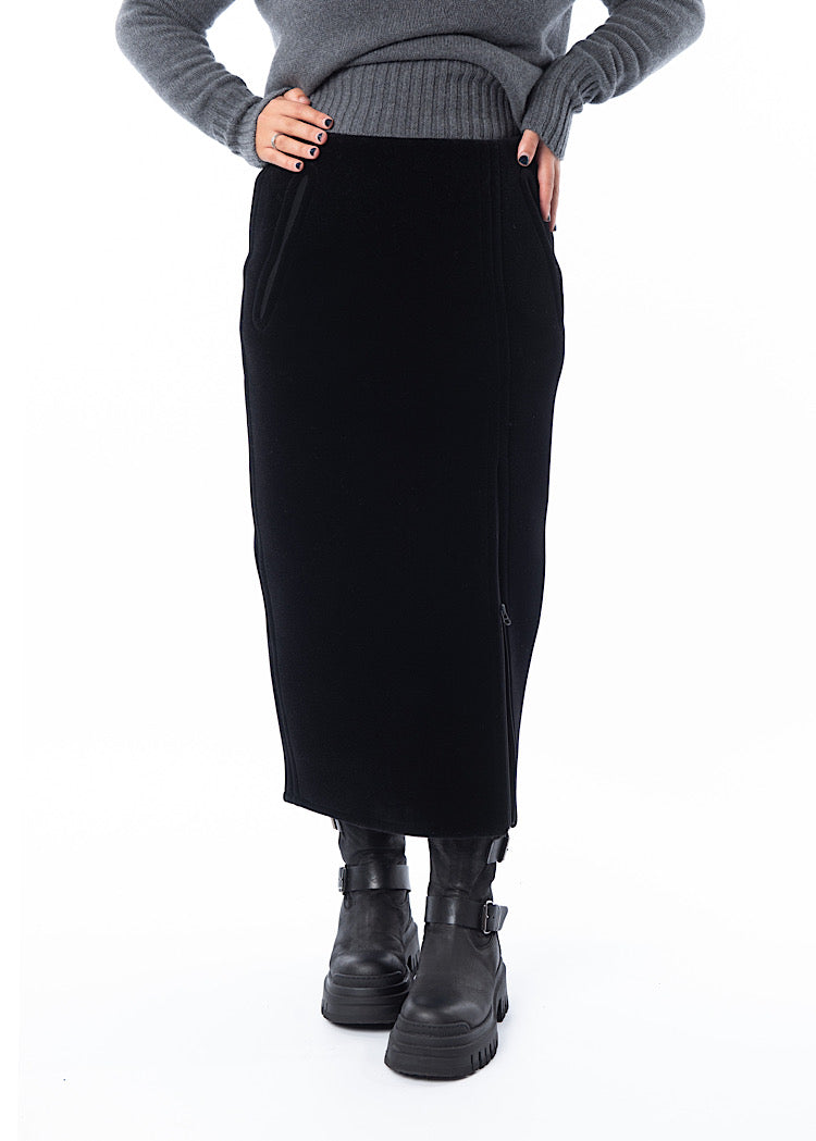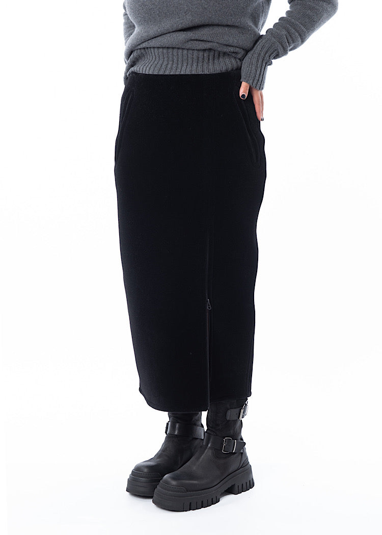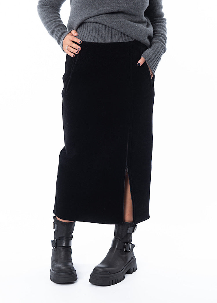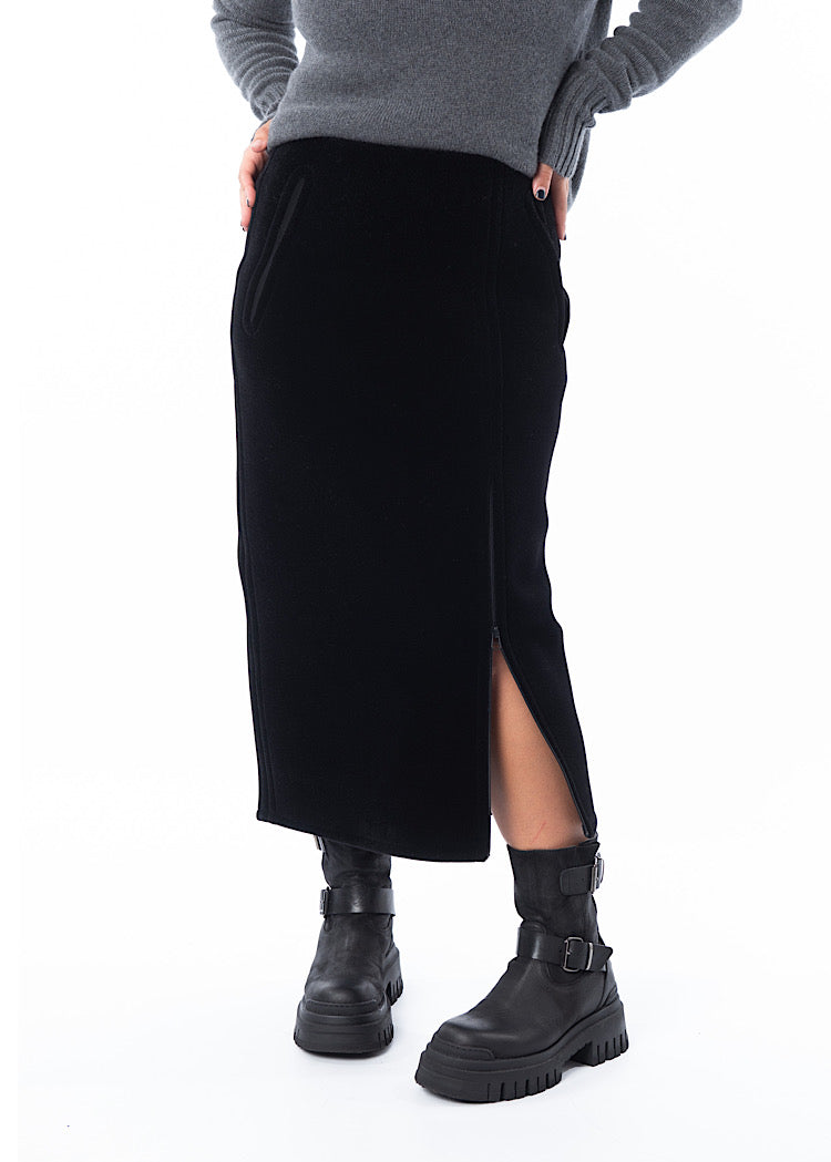 A fitted pencil style skirt from ANNETTE GÖRTZ. Featuring a mid length zip to adjust the side slit to the wearers desire, two side pockets and a fixed waistband. Finished in a heavy weight velvet fabric and a vent detail to the reverse.