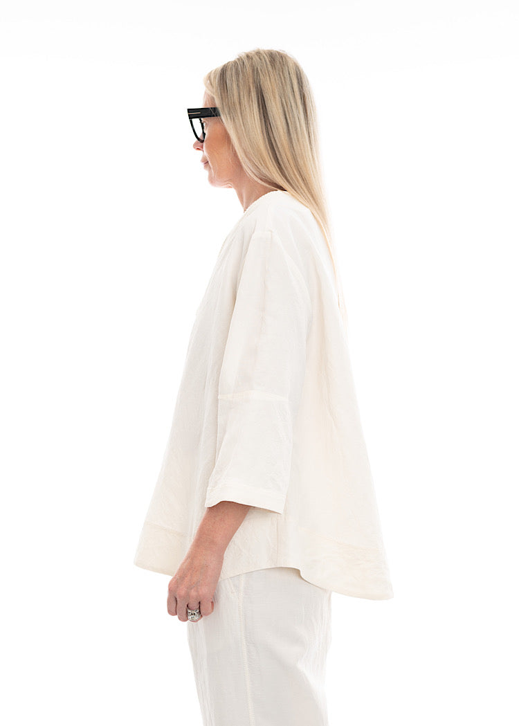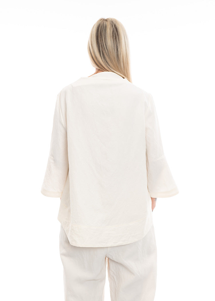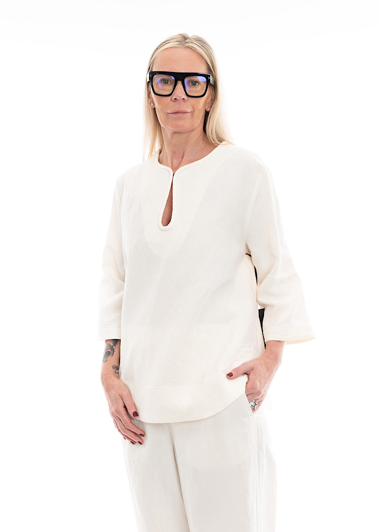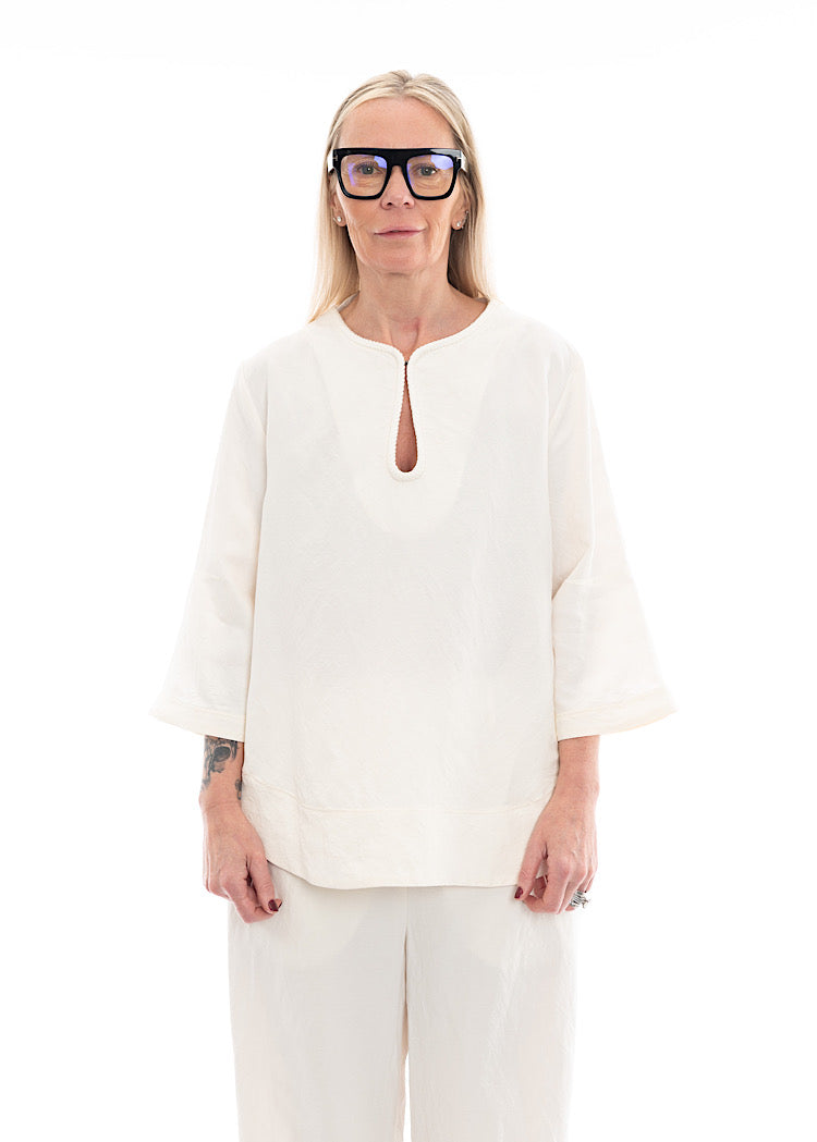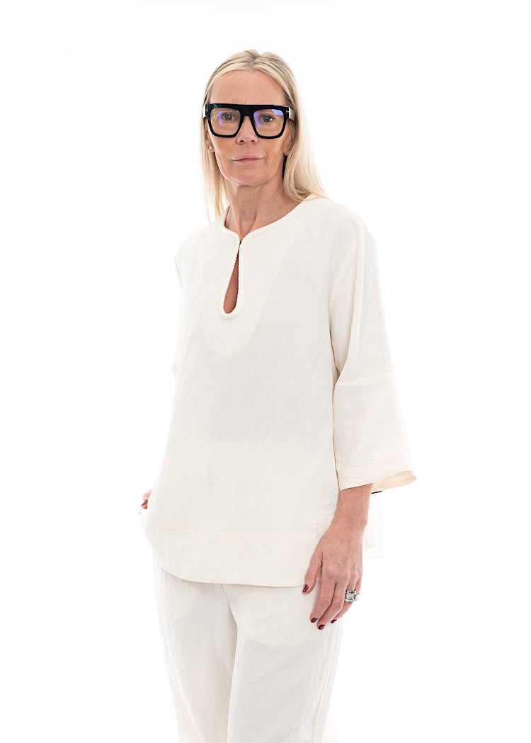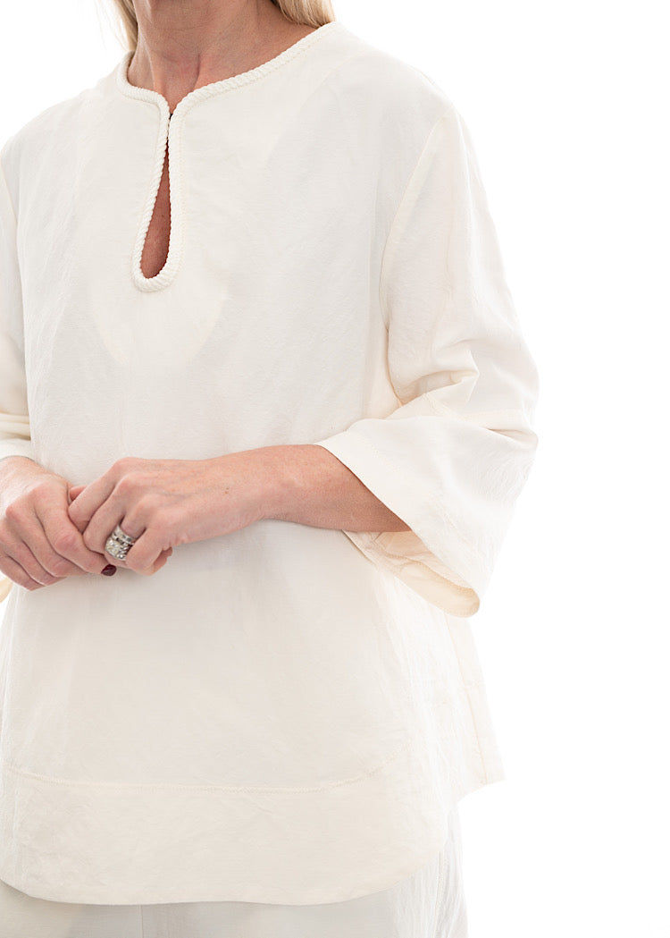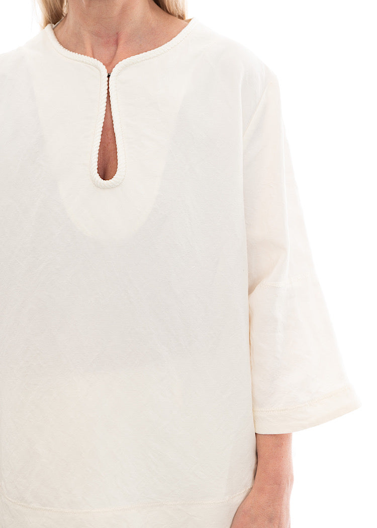 A Linen-Mix top from ANNETTE GÖRTZ Spring/Summer '25. This boxy-fit top features mid-length fluted sleeves, a scooped hemline and a keyhole neckline, detailed with a nautical-inspired rope finish and fastened at the neckline with a metal clasp.
