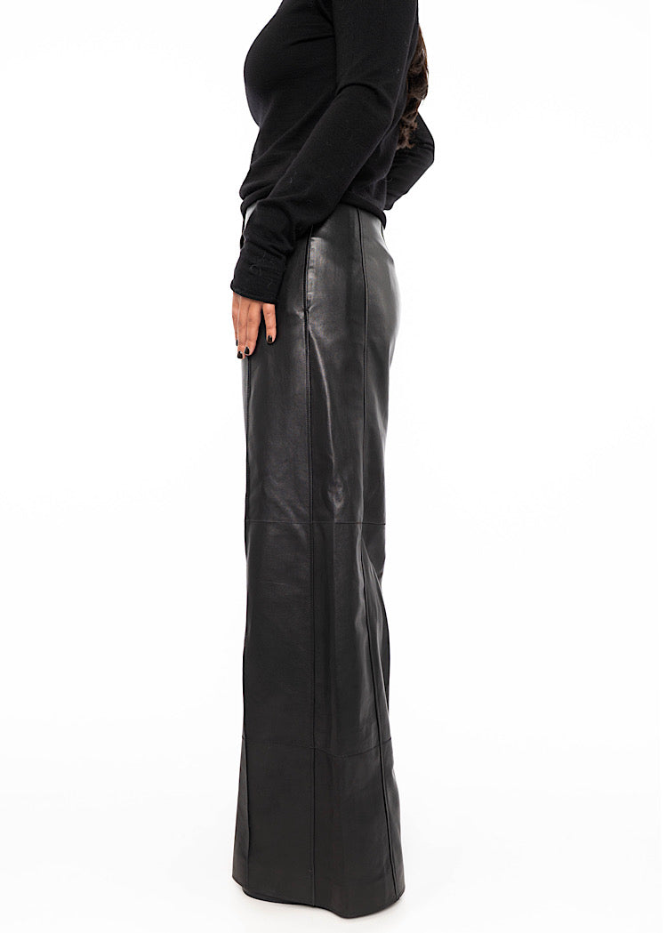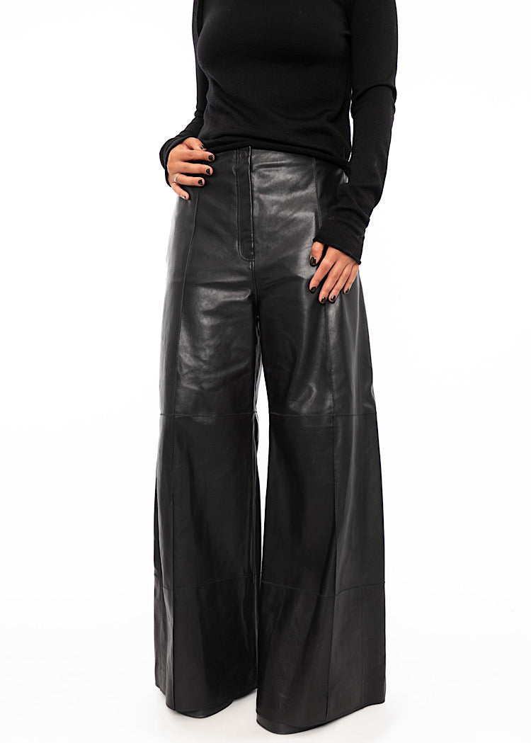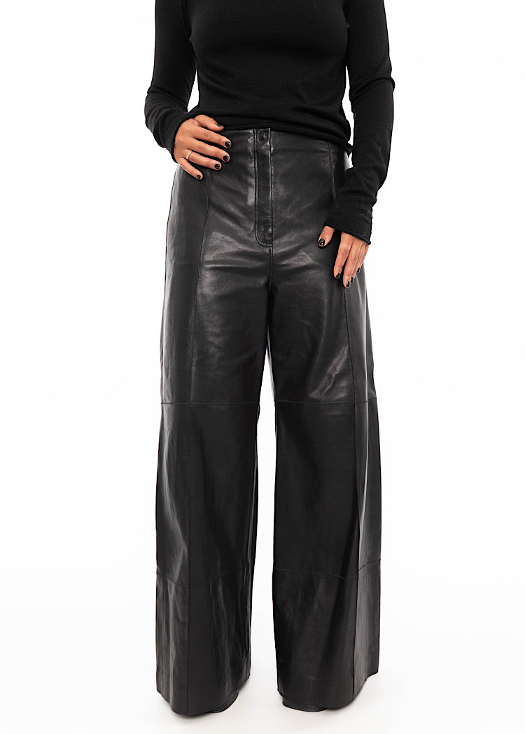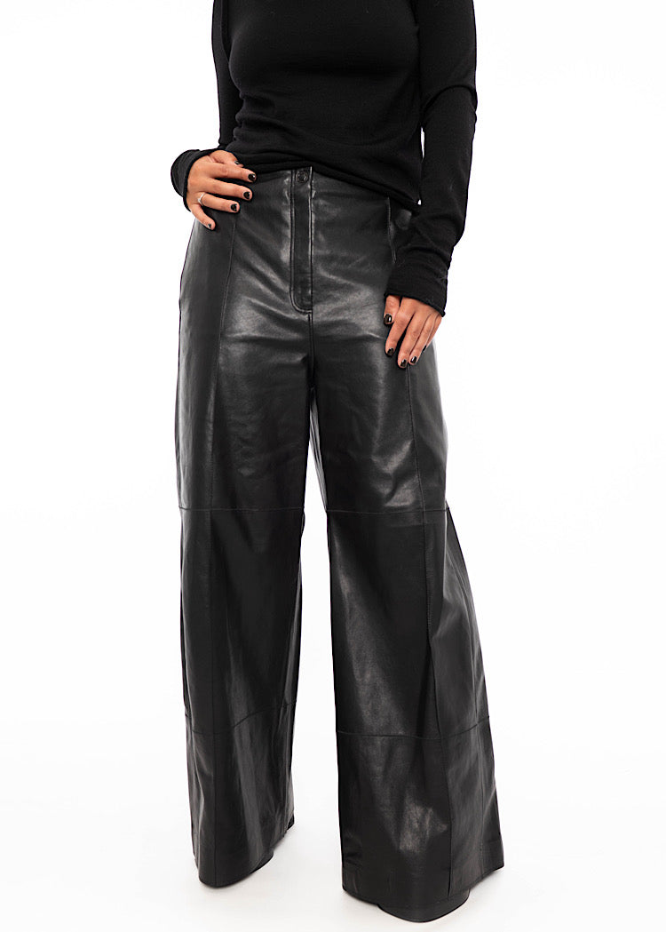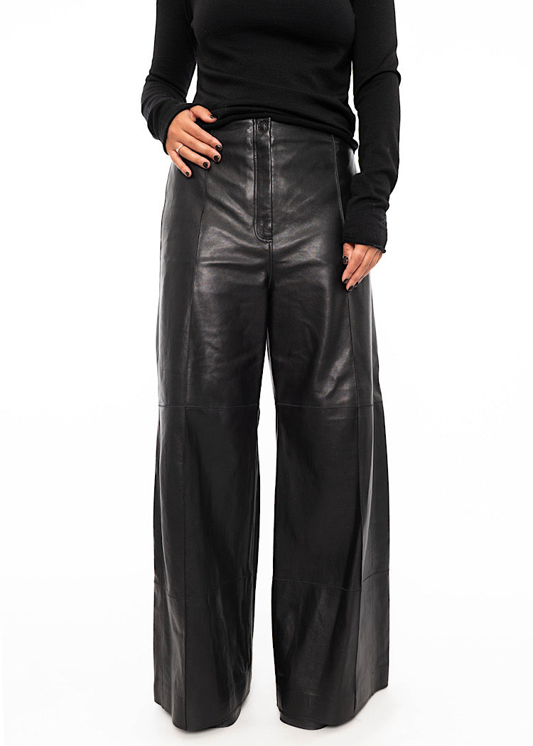 A straight leg Leather trouser from ANNETTE GÖRTZ. Featuring a fixed waistband, a popper and zip to fasten and side seam pockets. Finished with Seam darts running throughout.