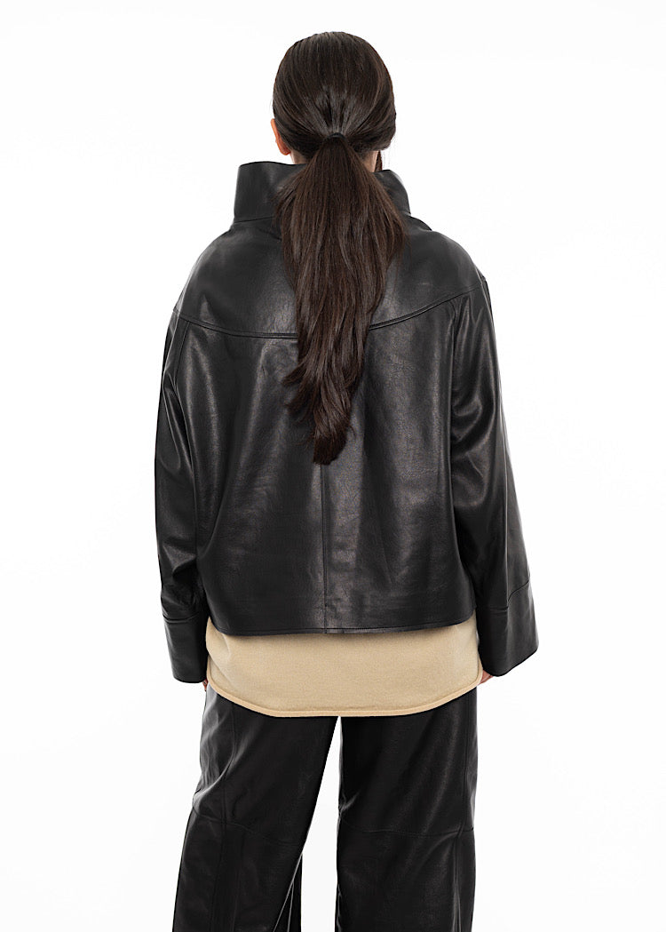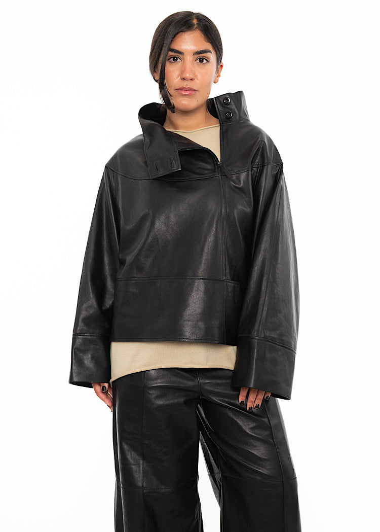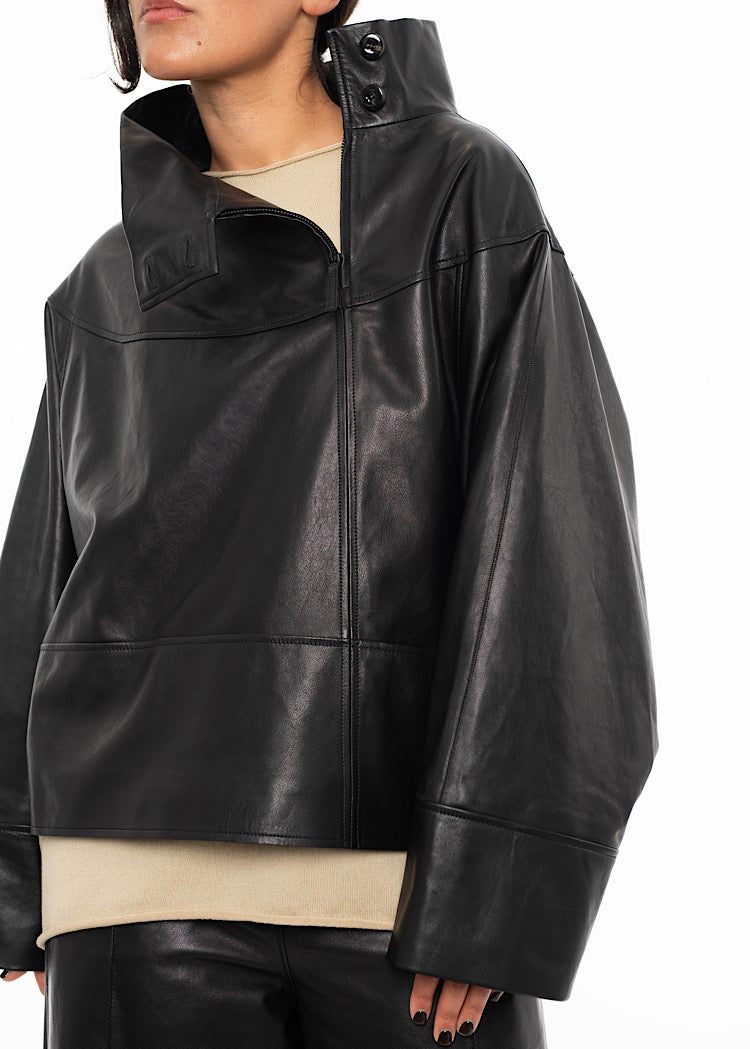 A relaxed fit Leather Pullover from ANNETTE GÖRTZ AW25. Featuring a high neckline with buttons to fasten, a 1/4 side zip and front facing seam pockets. Finished in a soft touch Leather with seam detailing throughout.