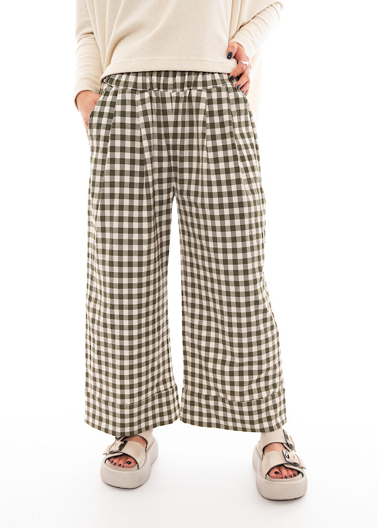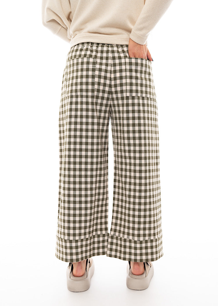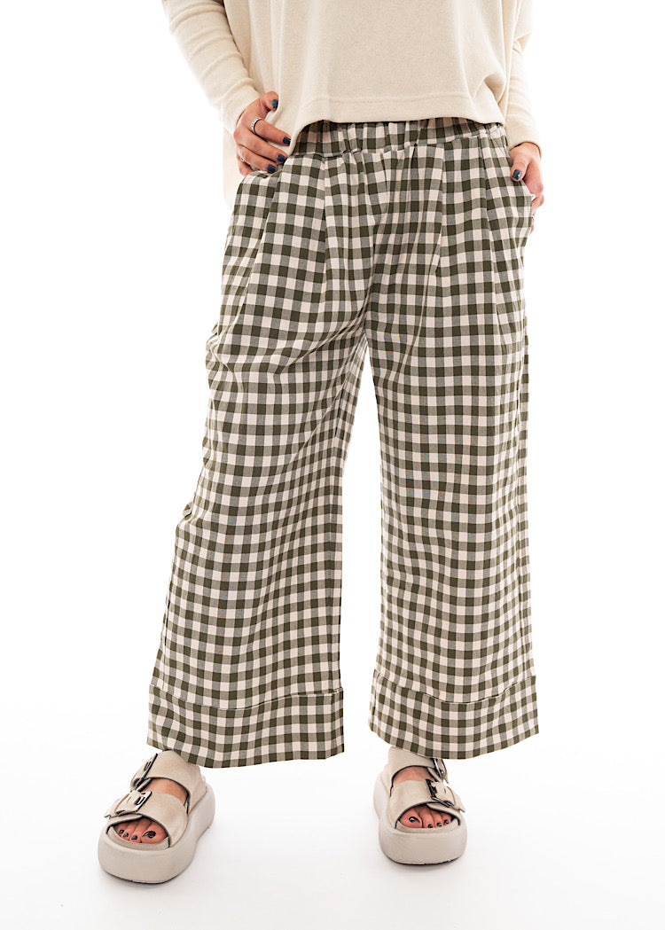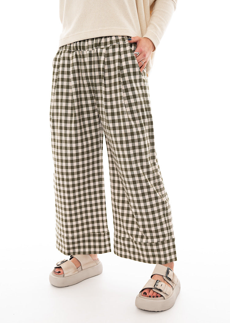 A cropped, wide-leg trouser from MAMA B in a gingham check. Features an elasticated waistband, side pockets and back pockets. Finished with a cuffed hemline and dart details at the top of the leg for a flattering shape.