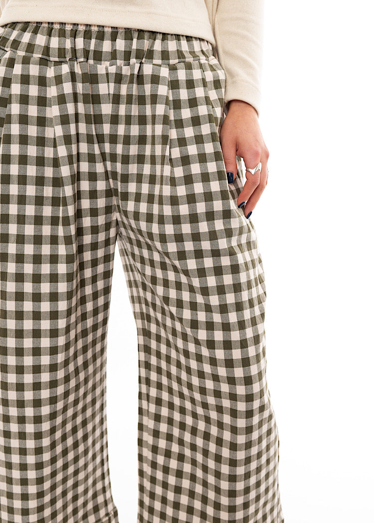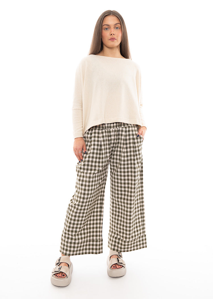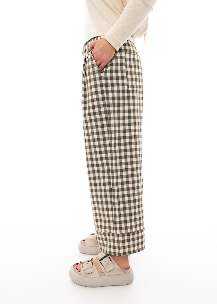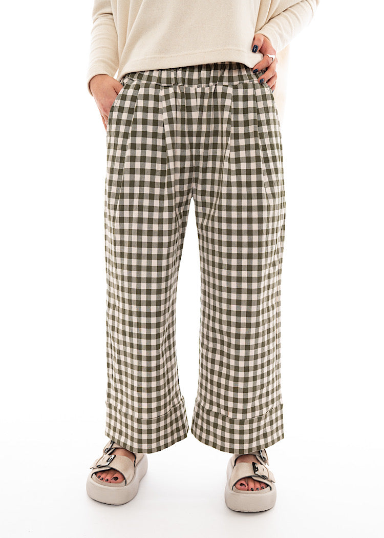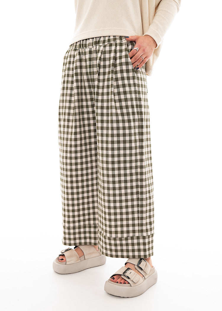 A cropped, wide-leg trouser from MAMA B in a gingham check. Features an elasticated waistband, side pockets and back pockets. Finished with a cuffed hemline and dart details at the top of the leg for a flattering shape.