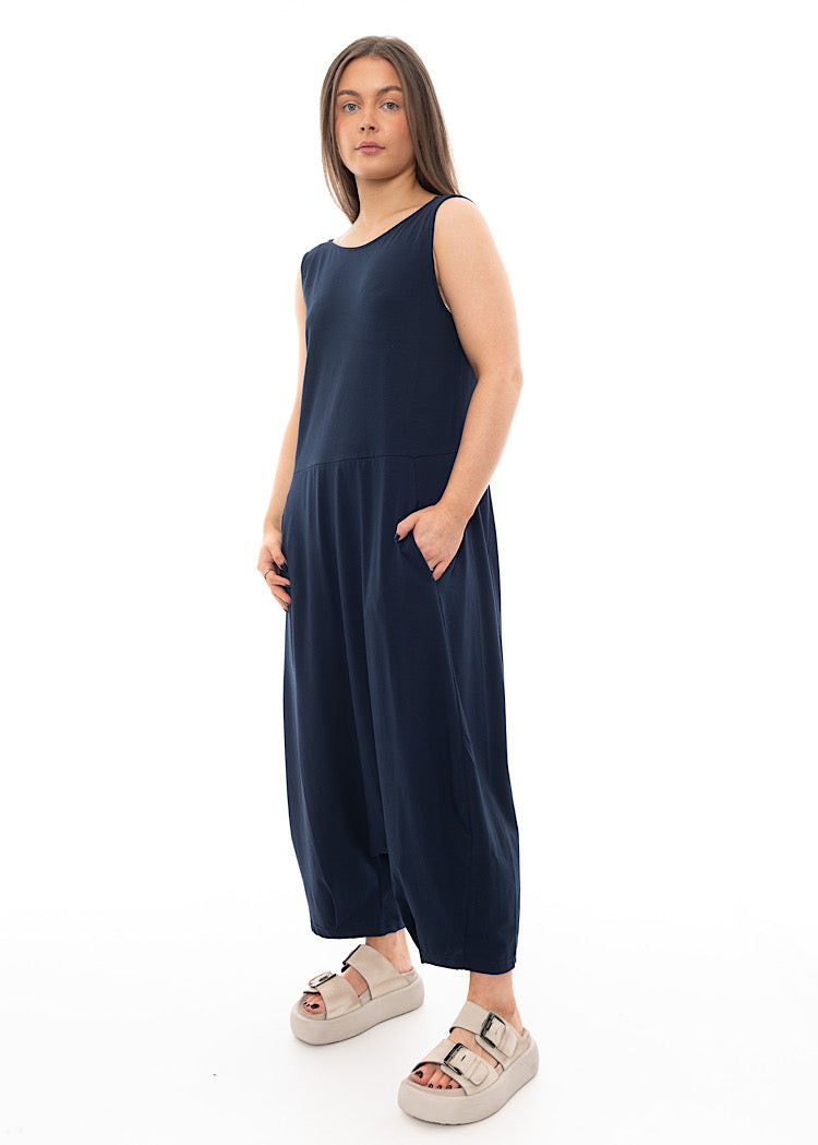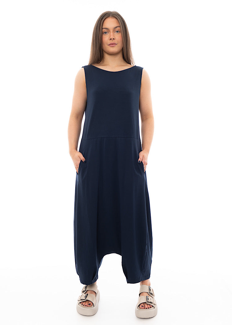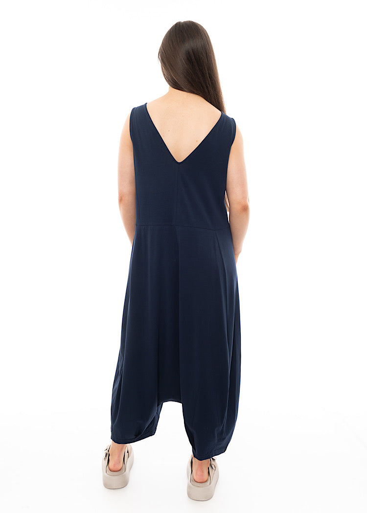 A cotton stretch jersey Jumpsuit in a drop-crotch design. Featuring two side pockets and a v-neckline to be worn either to the front or back. This is the classic fit IOS style which MAMA B repeat every season as a staple favourite.