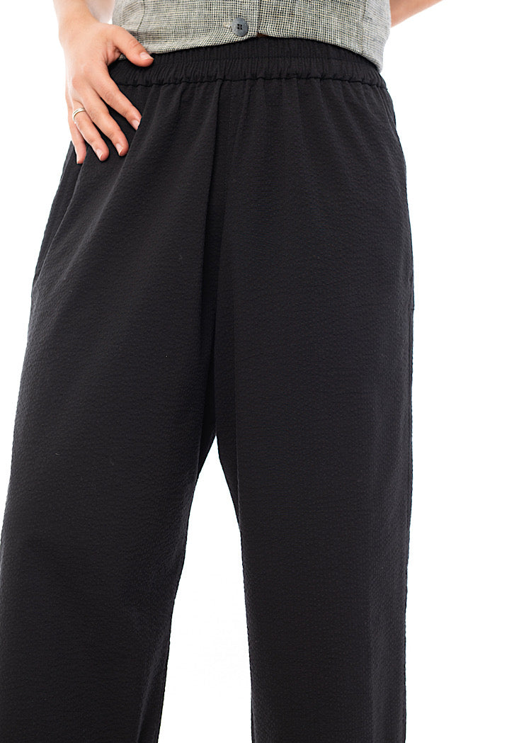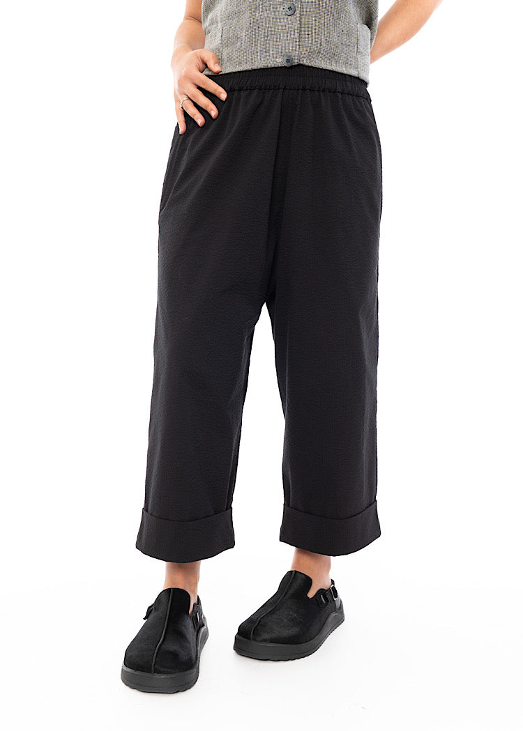 A lightweight wide leg trouser from MUKU Spring/Summer '25. Featuring an elasticated waistband with front and rear pockets. Finished in a textured Cotton fabric with a turnup at the hem.
