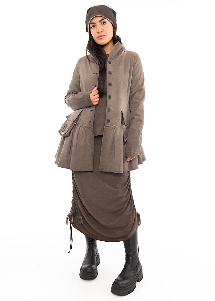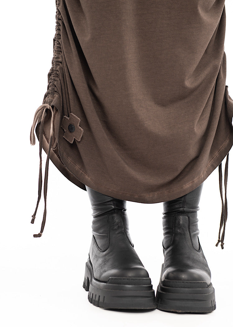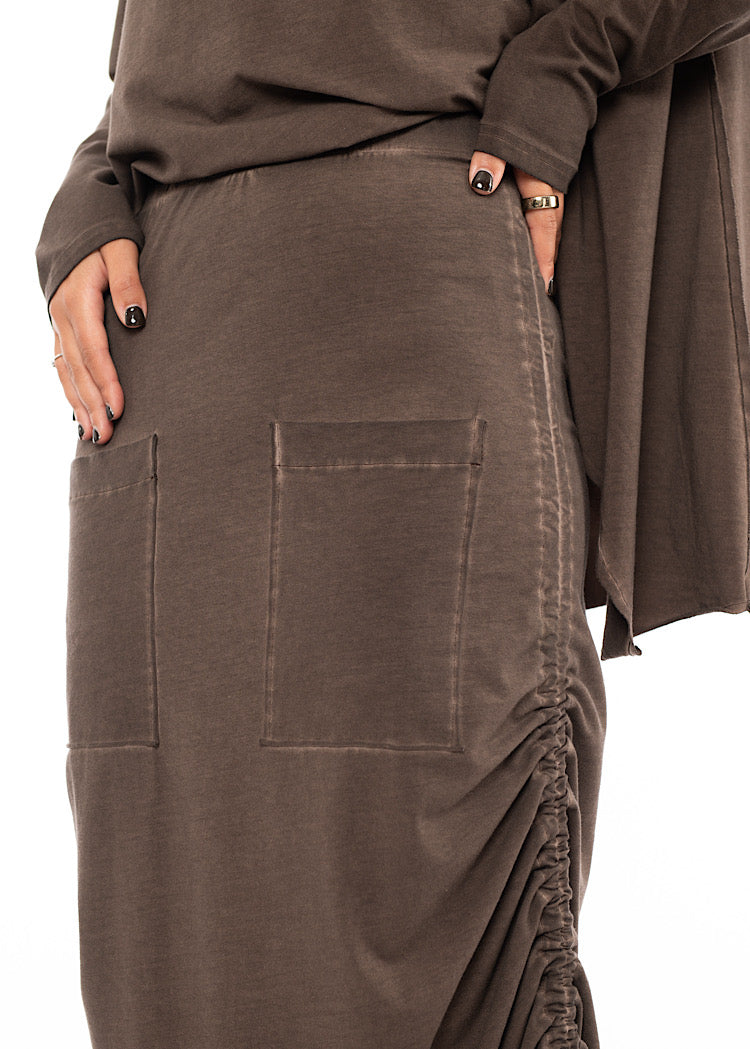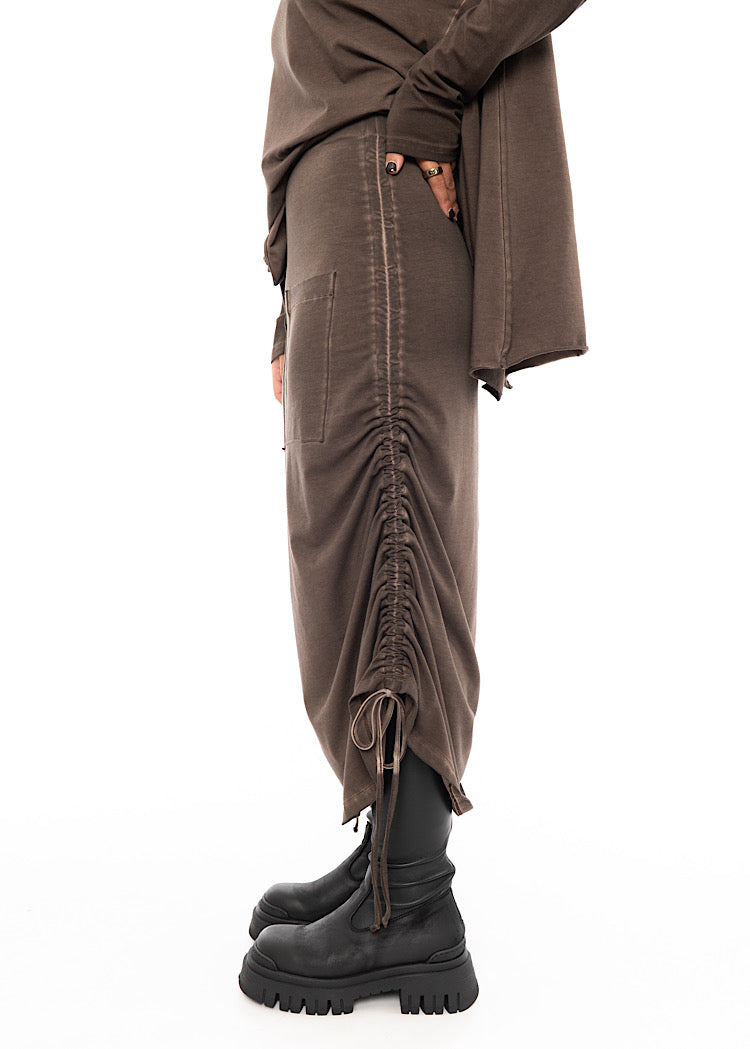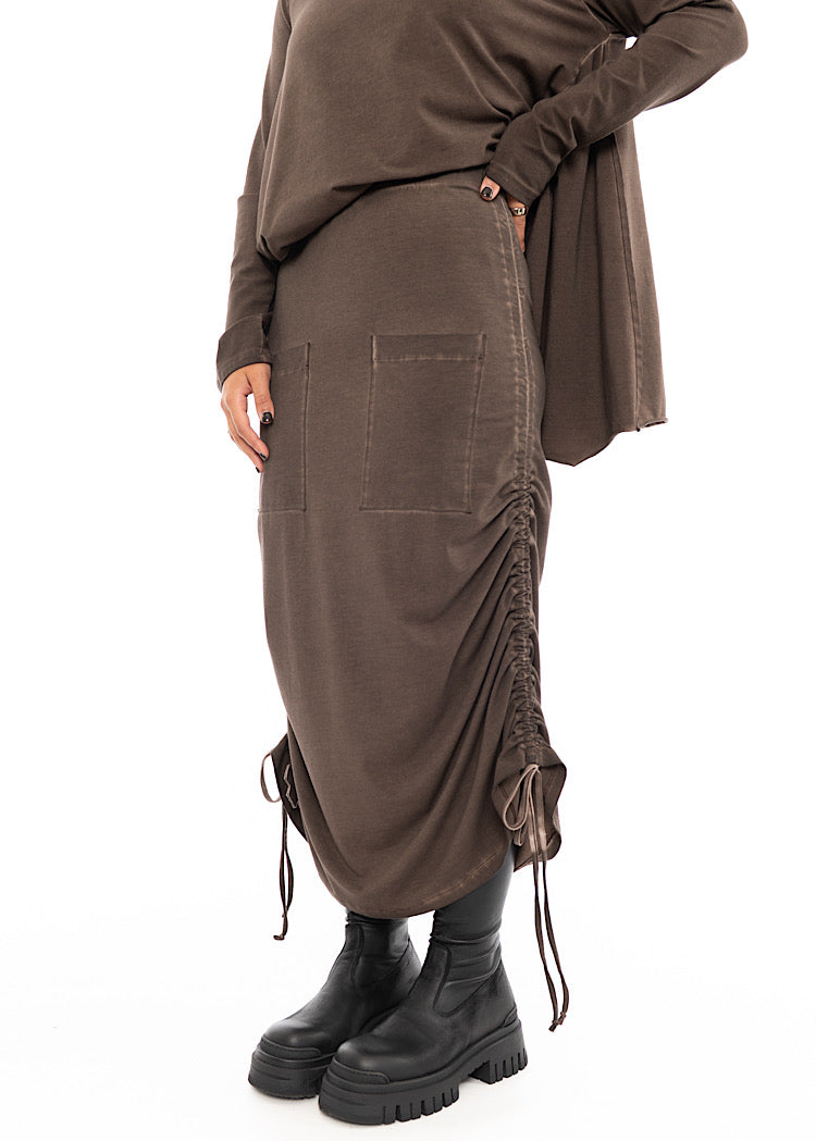 A medium-weight Cotton Jersey fabric Skirt from PLU. Features include a fully elasticated waistband for comfort, two front facing pockets and drawstrings either side to create a ruching detail if desired. Finished with the classic removable PLU Patch.