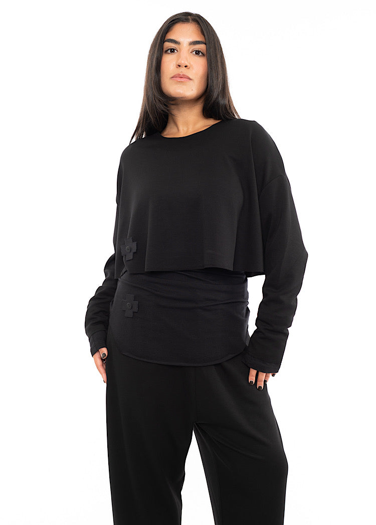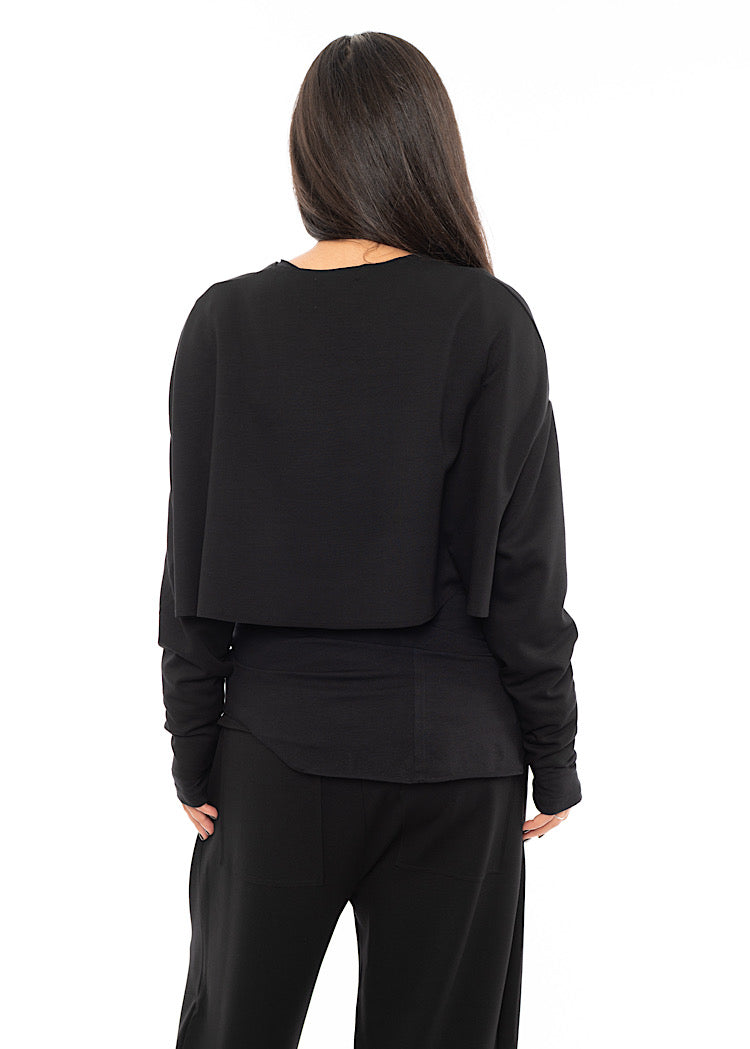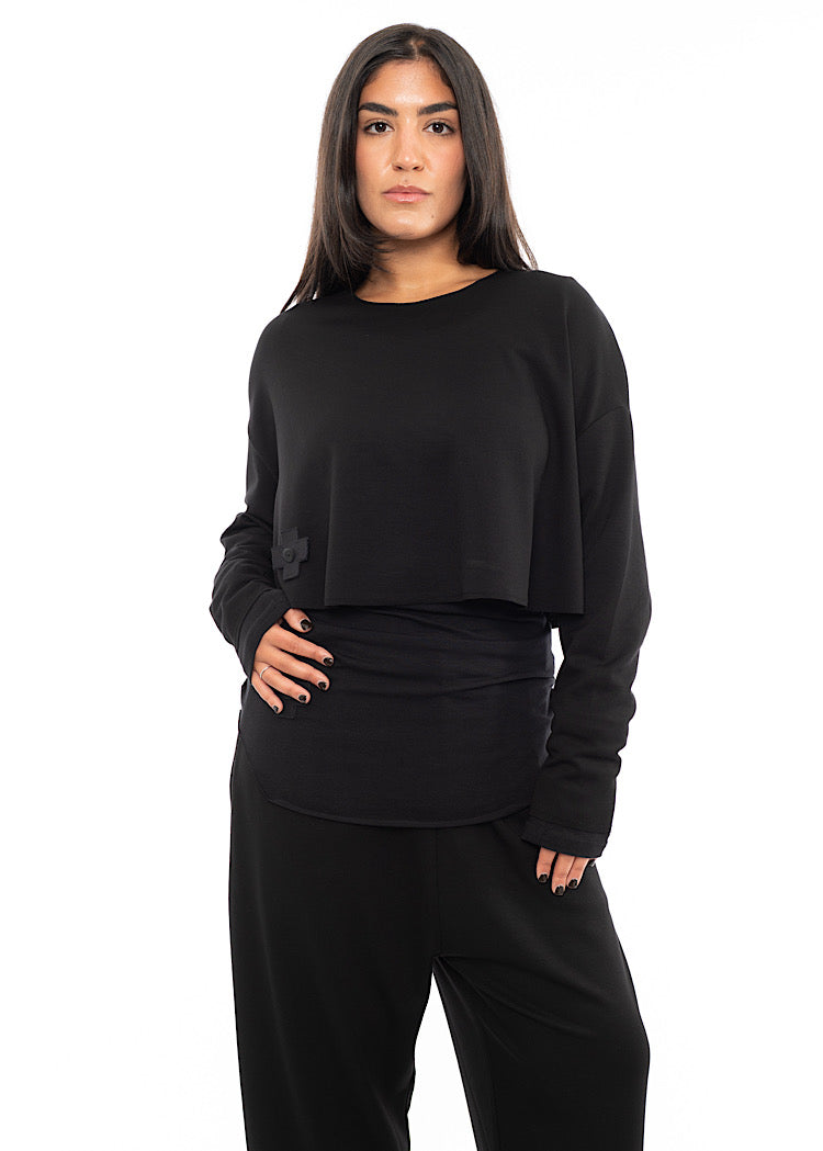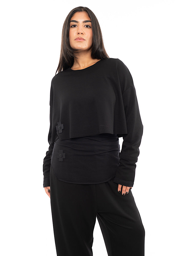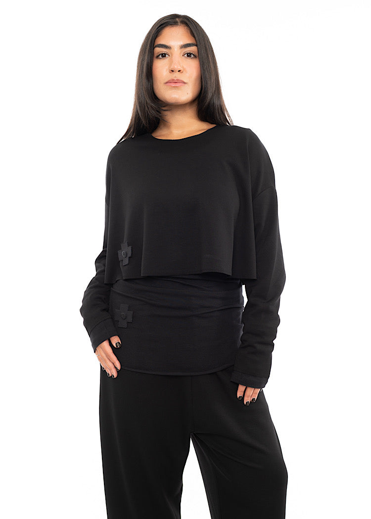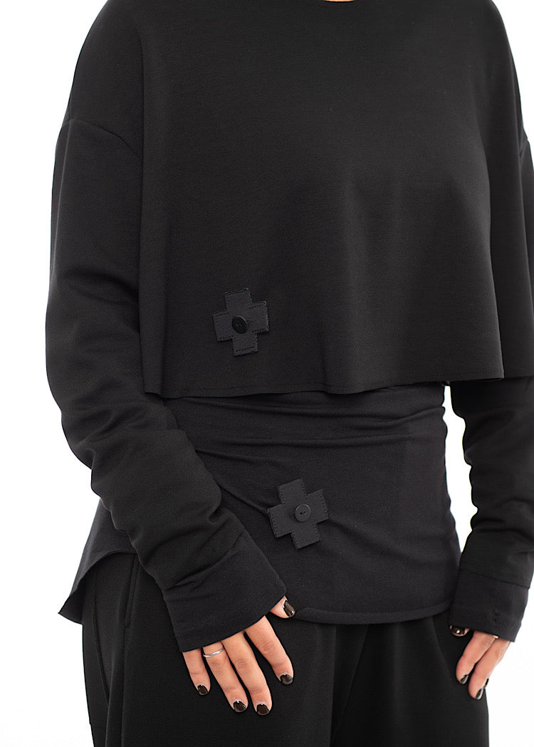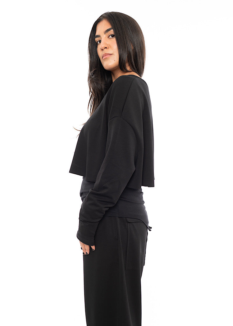 A cropped medium-weight pullover from PLU AW25. Featuring a scoop neckline, long sleeves and the detachable PLU patch.