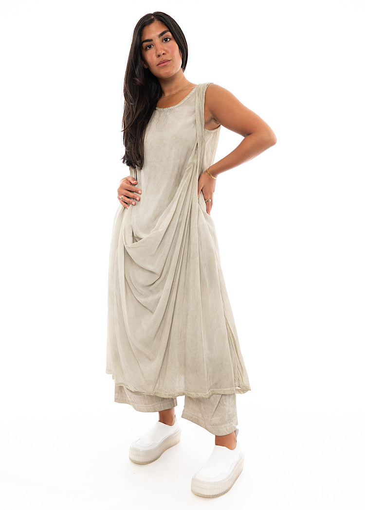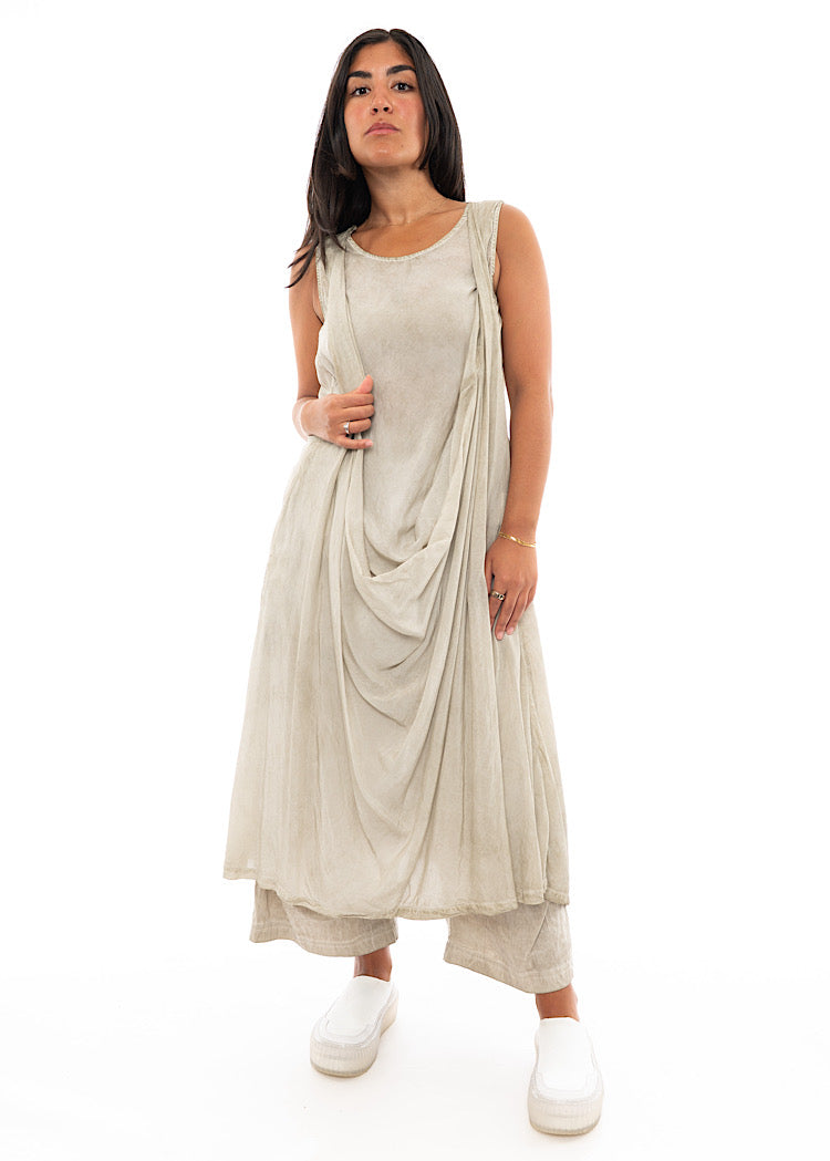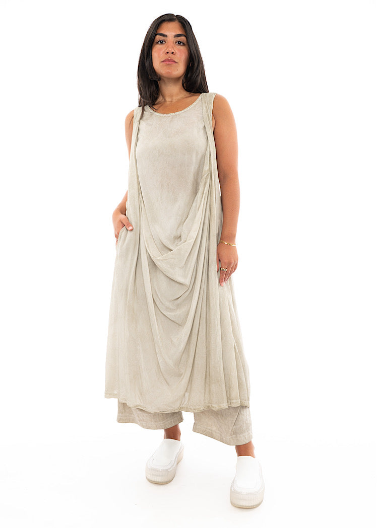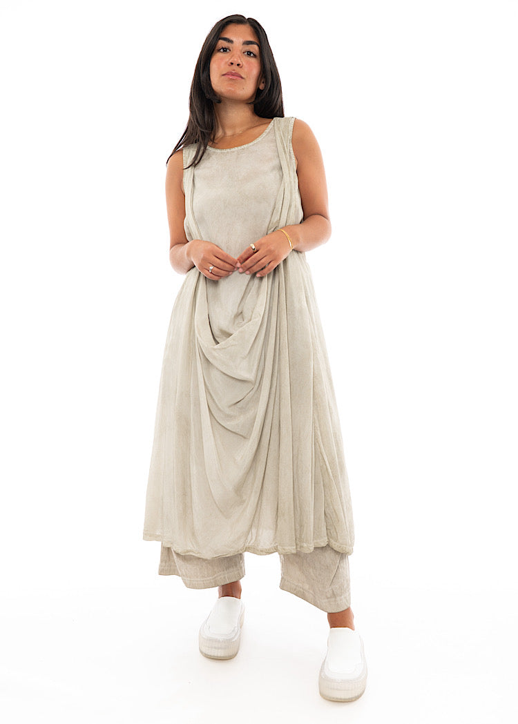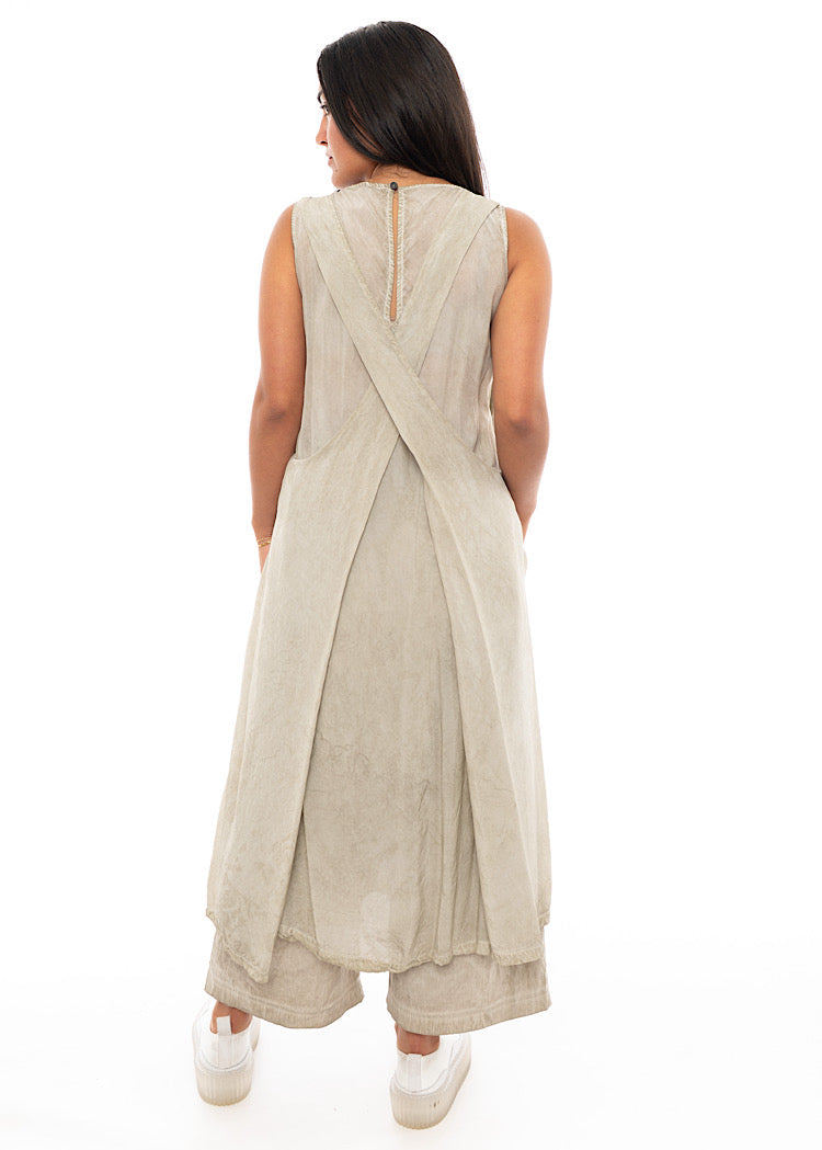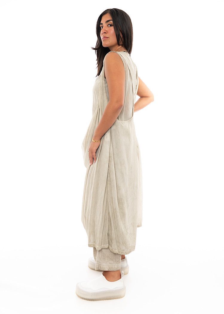 A lightweight dress from RUNDHOLZ MAINLINE Spring/Summer '24. This apron-style design brings a grecian-feel to your wardrobe. Features include a rounded neckline and a button at the neck to fasten, finished in a sleeveless design.