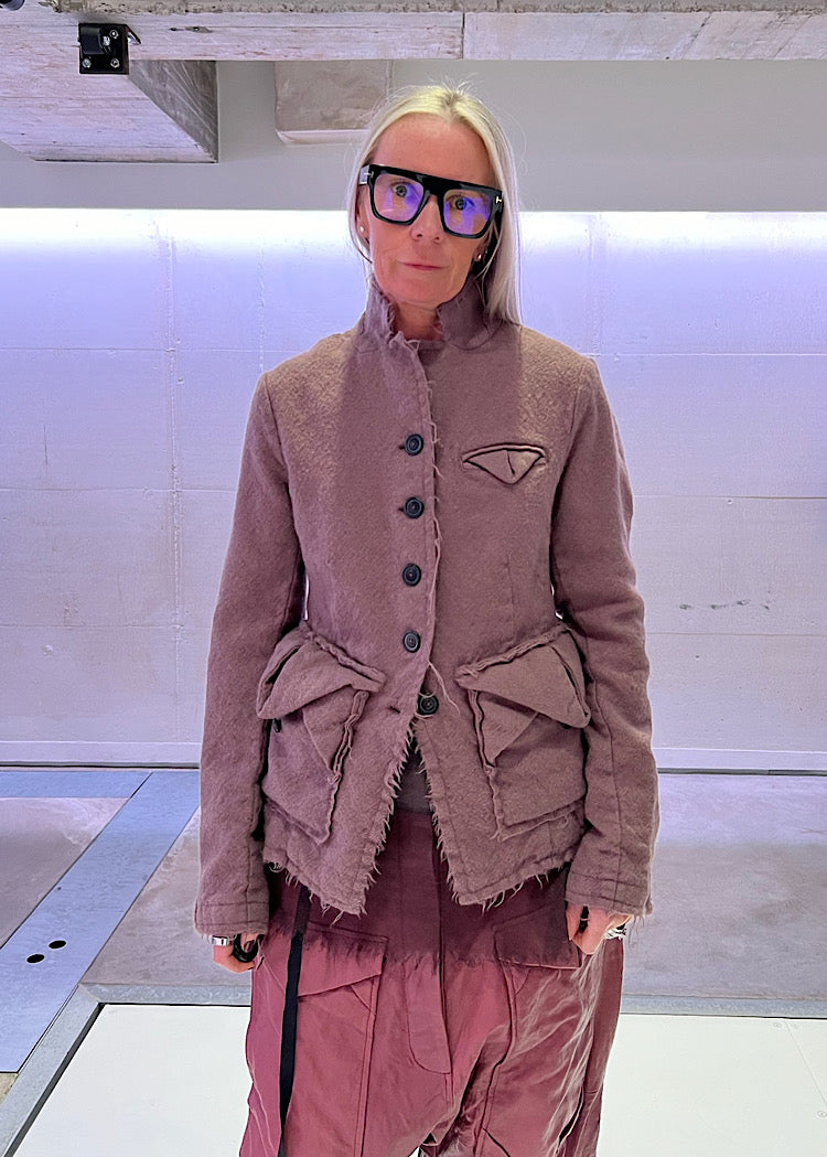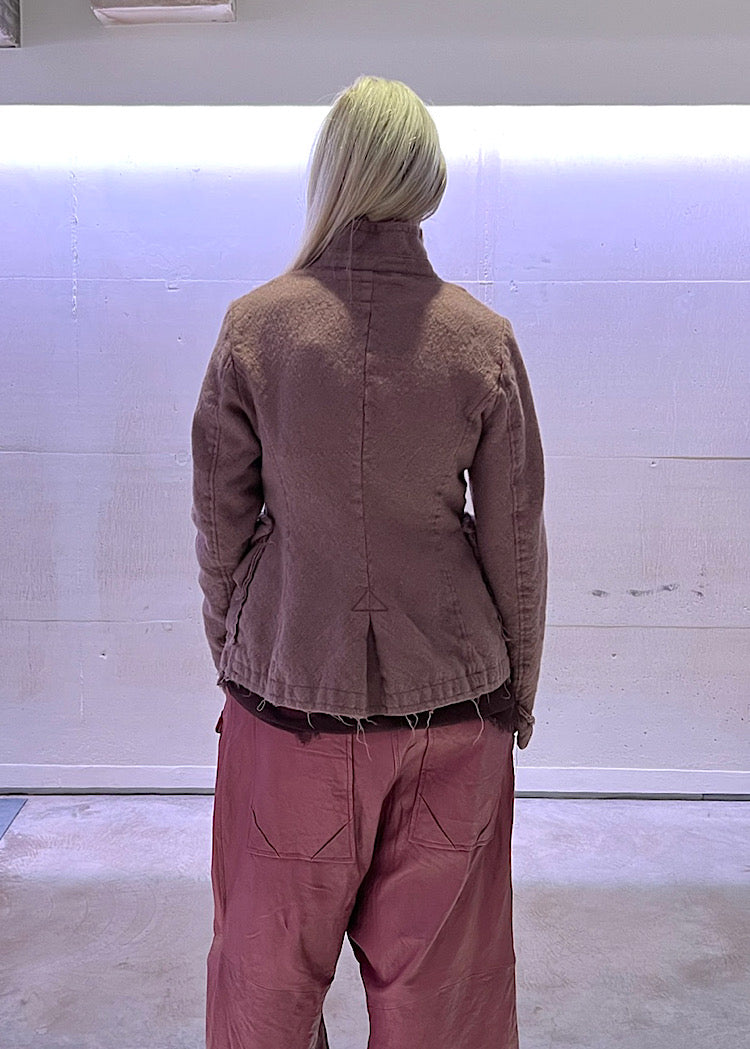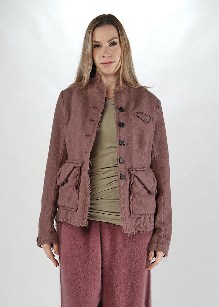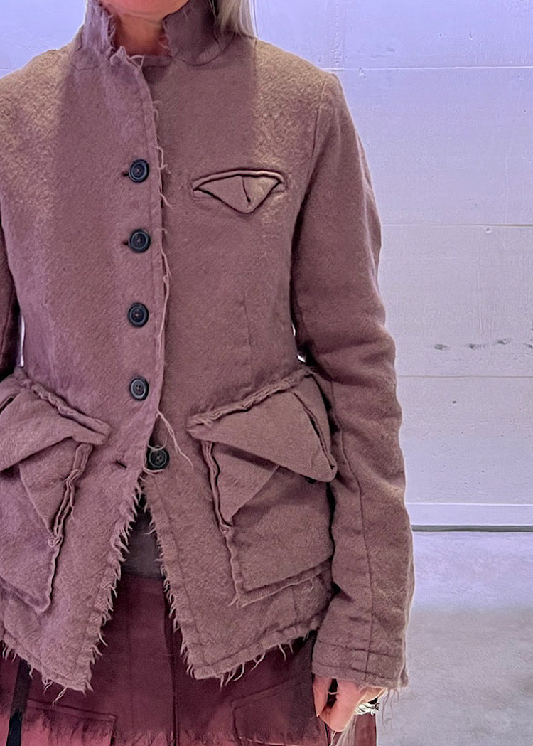 A fitted jacket from RUNDHOLZ DIP, crafted from richly pigmented Wool, giving each colour option a beautifully saturated finish. Designed with a structured silhouette, it features a high collar, angled pockets finished with sculptural folds and buttons to fasten. Finished with distressed frayed edges.