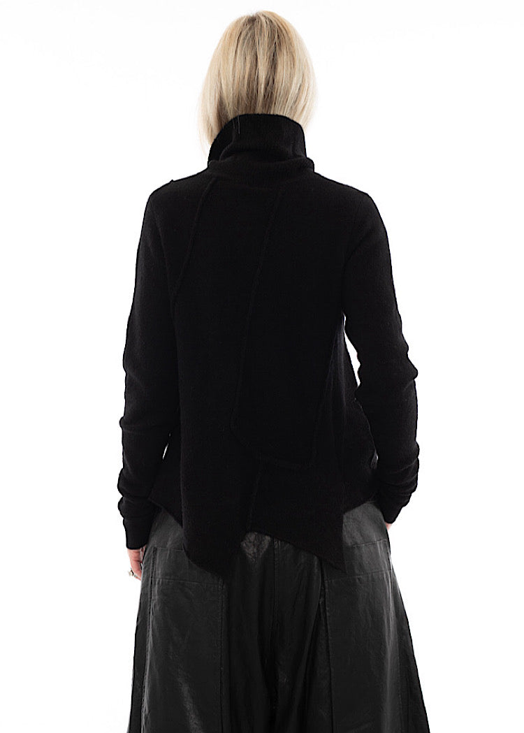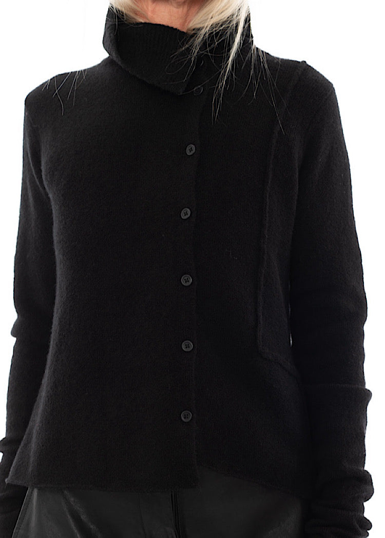 A striking update on a classic knit, this RUNDHOLZ BLACK LABEL cardigan is crafted from a soft Wool-Blend knit. The fitted silhouette is defined by an off-centre button placket and an exaggerated asymmetrical collar that extends into a draped back panel for a sculptural, directional finish. Raw-edge seams and subtle tailoring details give it a distinctive, deconstructed look.