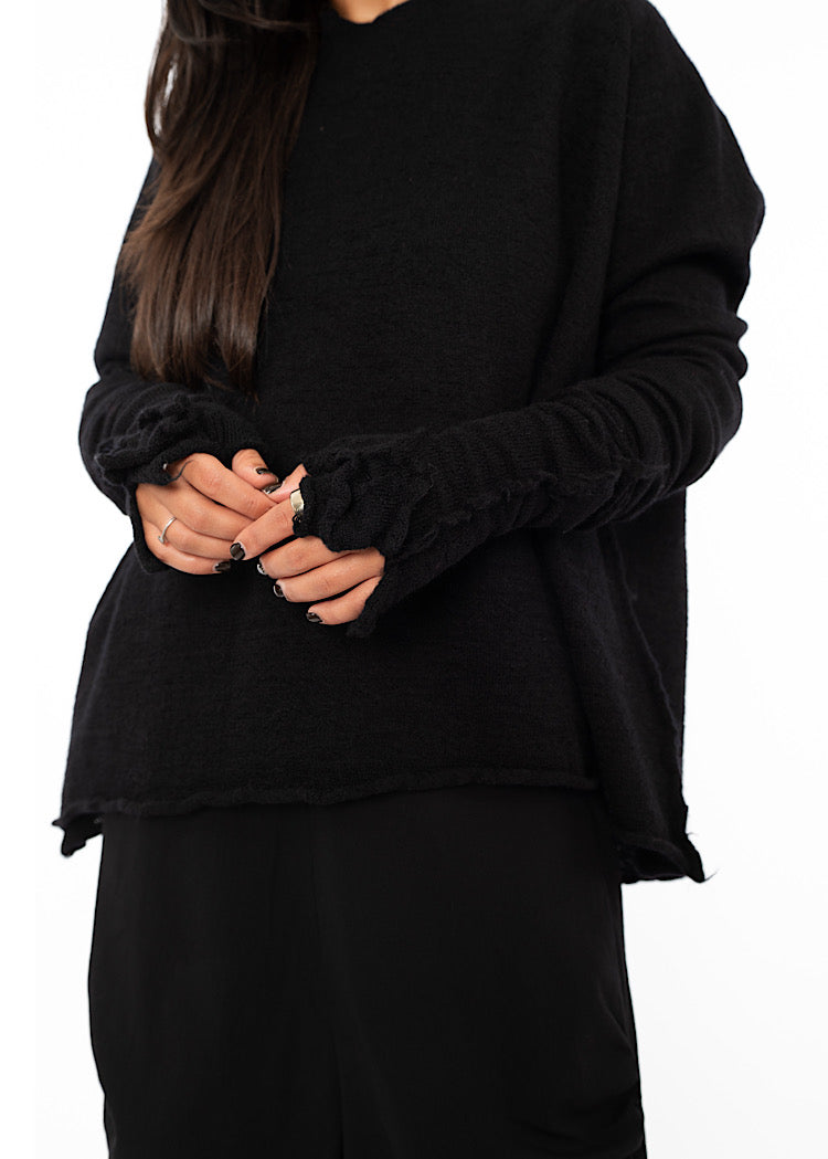 A knitted cuff from RUNDHOLZ BLACK LABEL in boiled Virgin Wool, a fabric that has become synonymous with RUNDHOLZ. The fingerless gloves feature a ruffle detail which reflect the Autumn/Winter '25 motif, inspired in part by Andy Warhol's flowers.