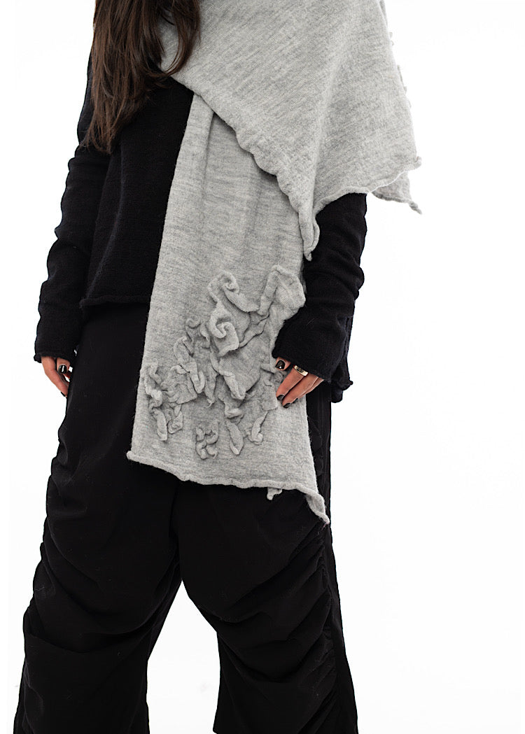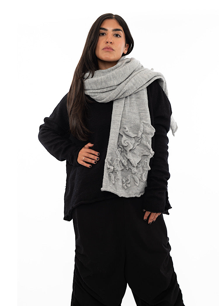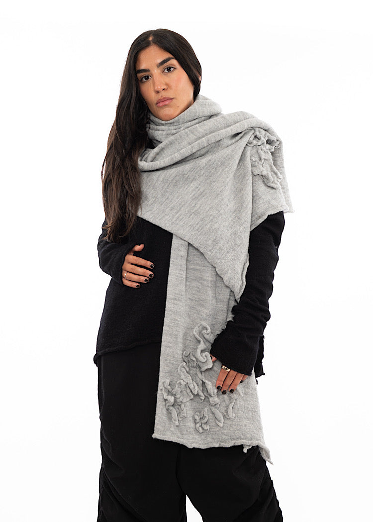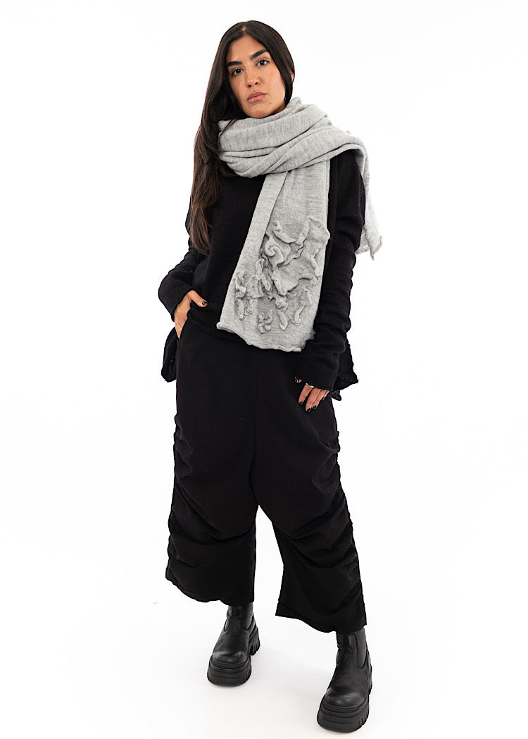 A knitted scarf from RUNDHOLZ BLACK LABEL in boiled Virgin Wool, a fabric that has become synonymous with RUNDHOLZ. The statement scarf features a ruffle detail which reflects the Autumn/Winter '25 motif, inspired in part by Andy Warhol's flowers.