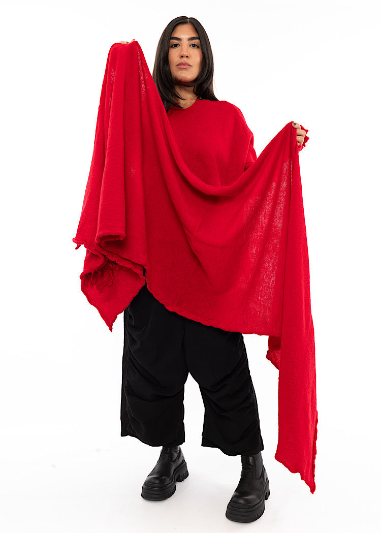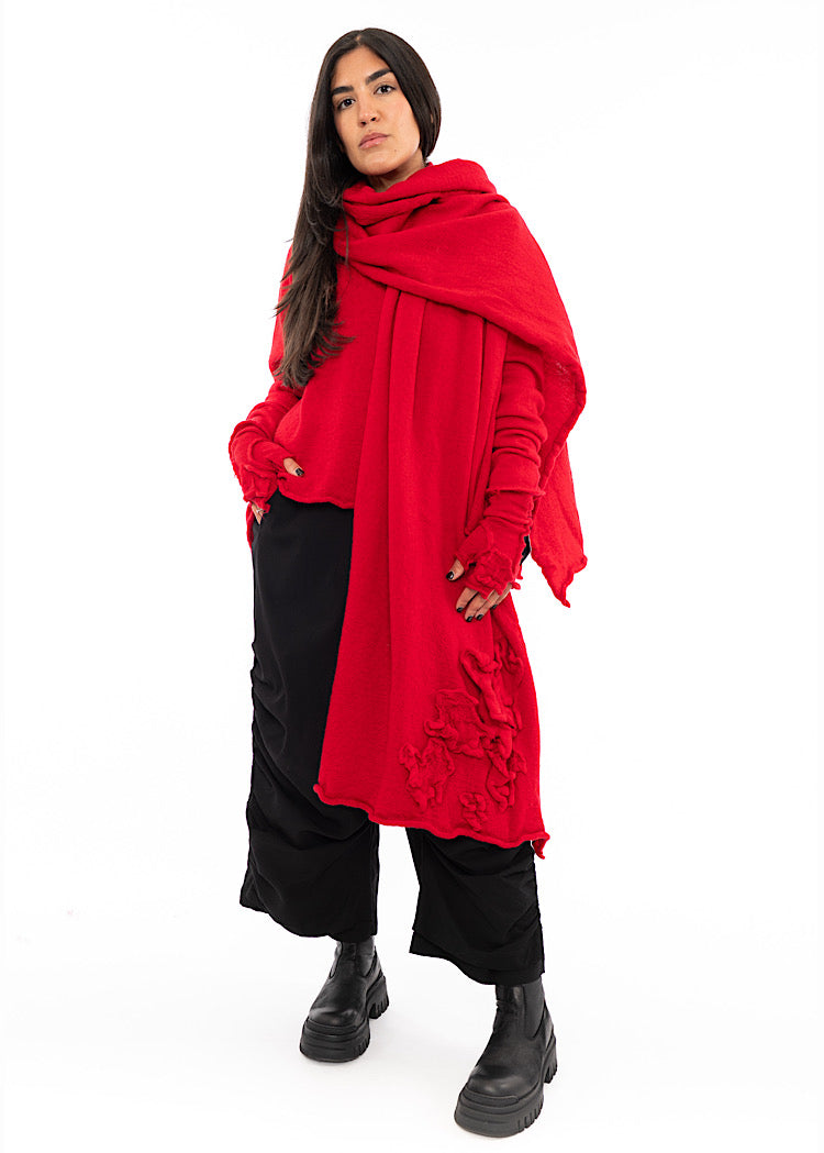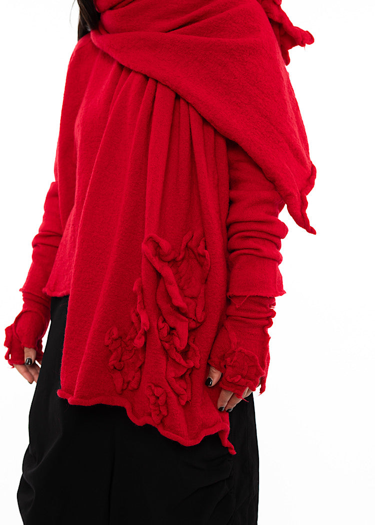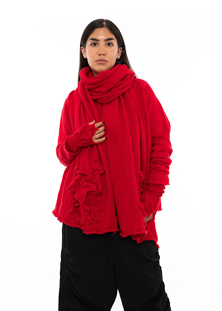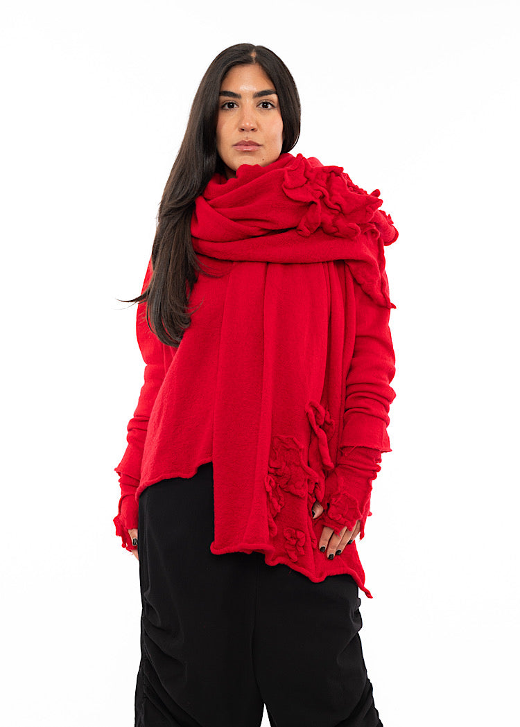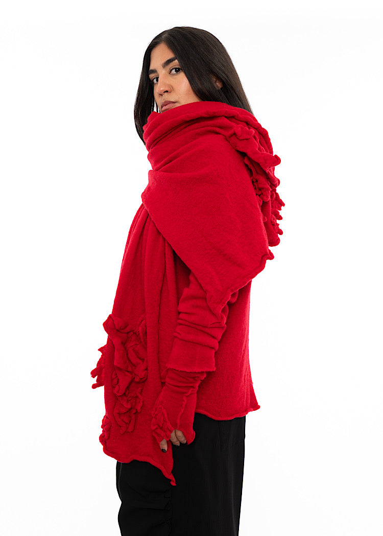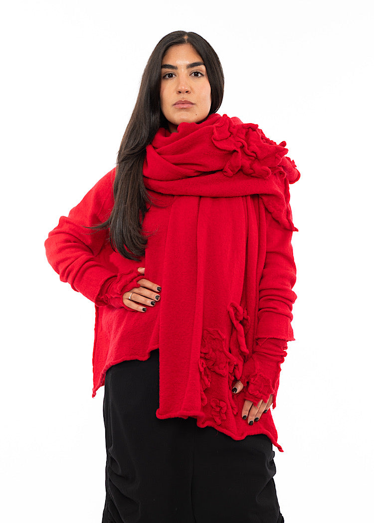 A knitted scarf from RUNDHOLZ BLACK LABEL in boiled Virgin Wool, a fabric that has become synonymous with RUNDHOLZ. The statement scarf features a ruffle detail which reflects the Autumn/Winter '25 motif, inspired in part by Andy Warhol's flowers.