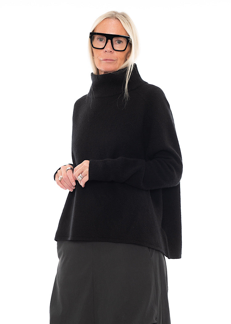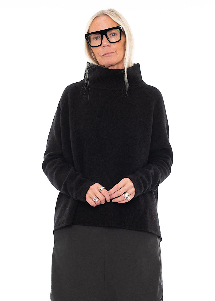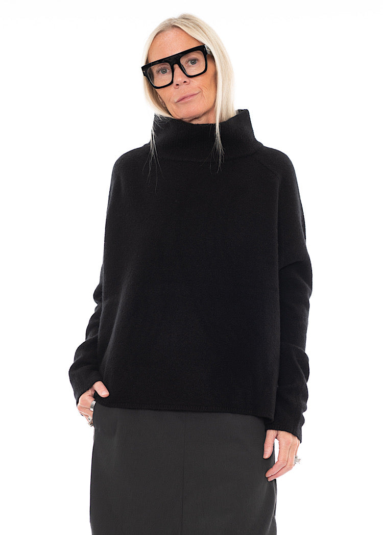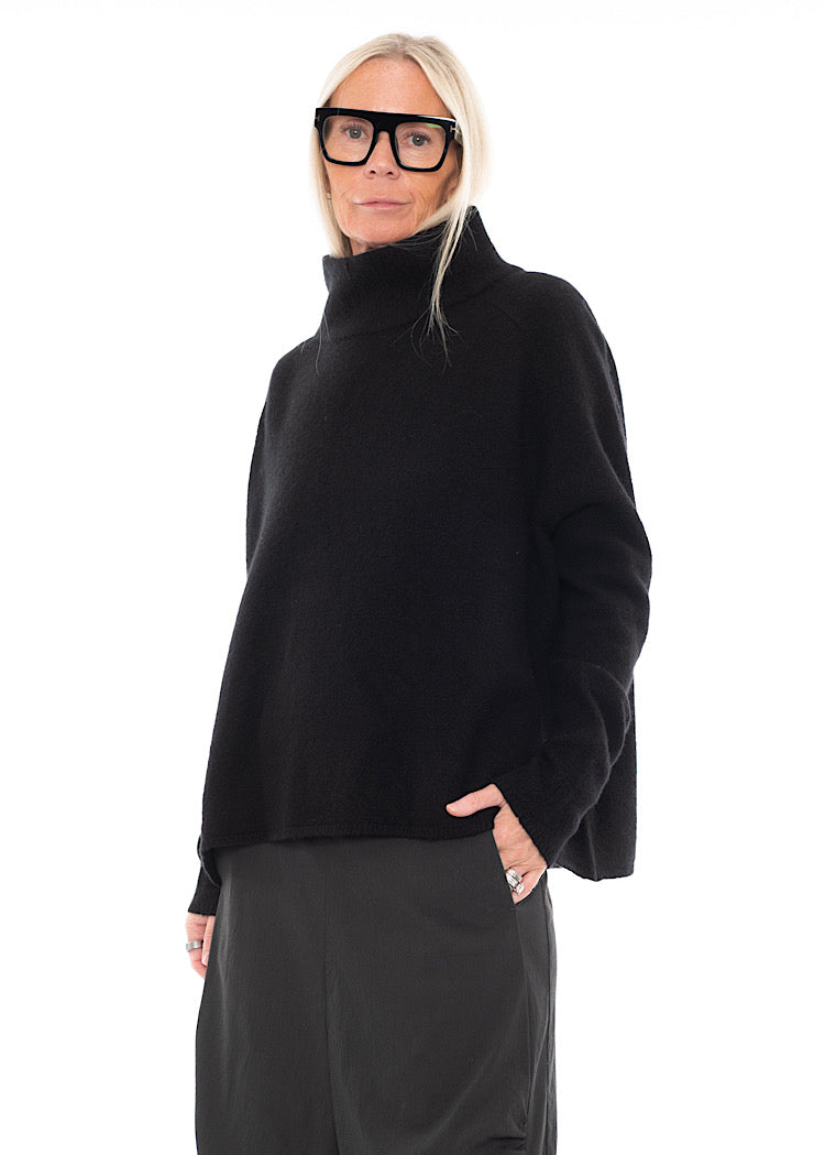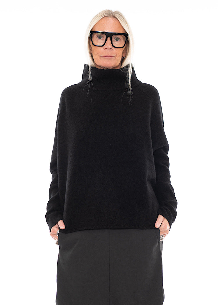 A versatile knitted Pullover from RUNDHOLZ BLACK LABEL in a textured Wool-Mix fabric. The oversized silhouette features a high neckline, dropped shoulders and elongated sleeves, creating a relaxed, sculptural drape. Finished with a subtly asymmetric hemline for a modern twist on a timeless staple.
