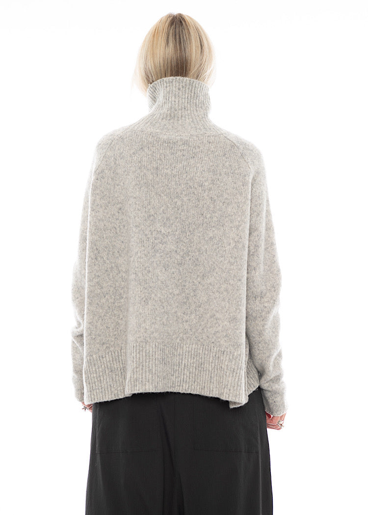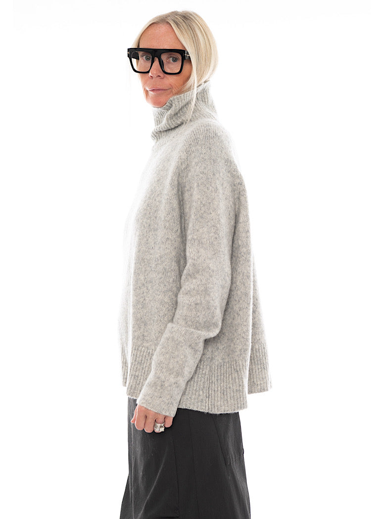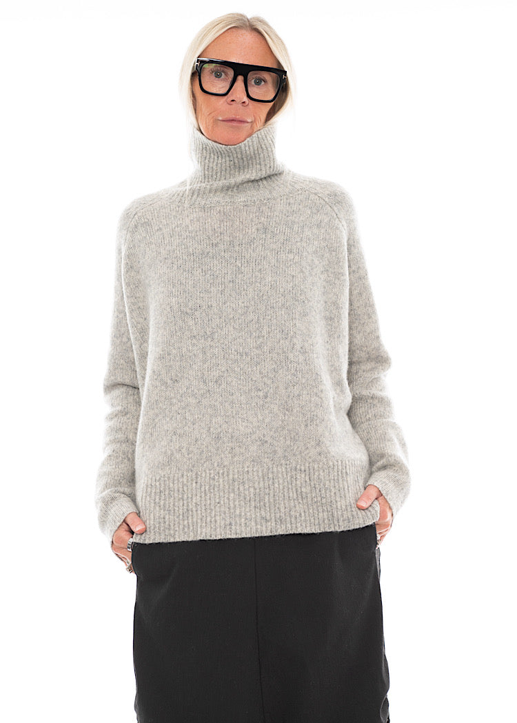 A Wool-Cotton Mix knitted Pullover from RUNDHOLZ BLACK LABEL. This staple oversized Pullover features a slouchy high neckline, scooped hemline with a longer length at the back and finished with long length sleeves. The soft Wool-Mix fabric incorporates a marled effect and textured finish that combine to create a cosy AW25 pullover. Details include ribbed detailing and rolled edges and for a signature RUNDHOLZ look.