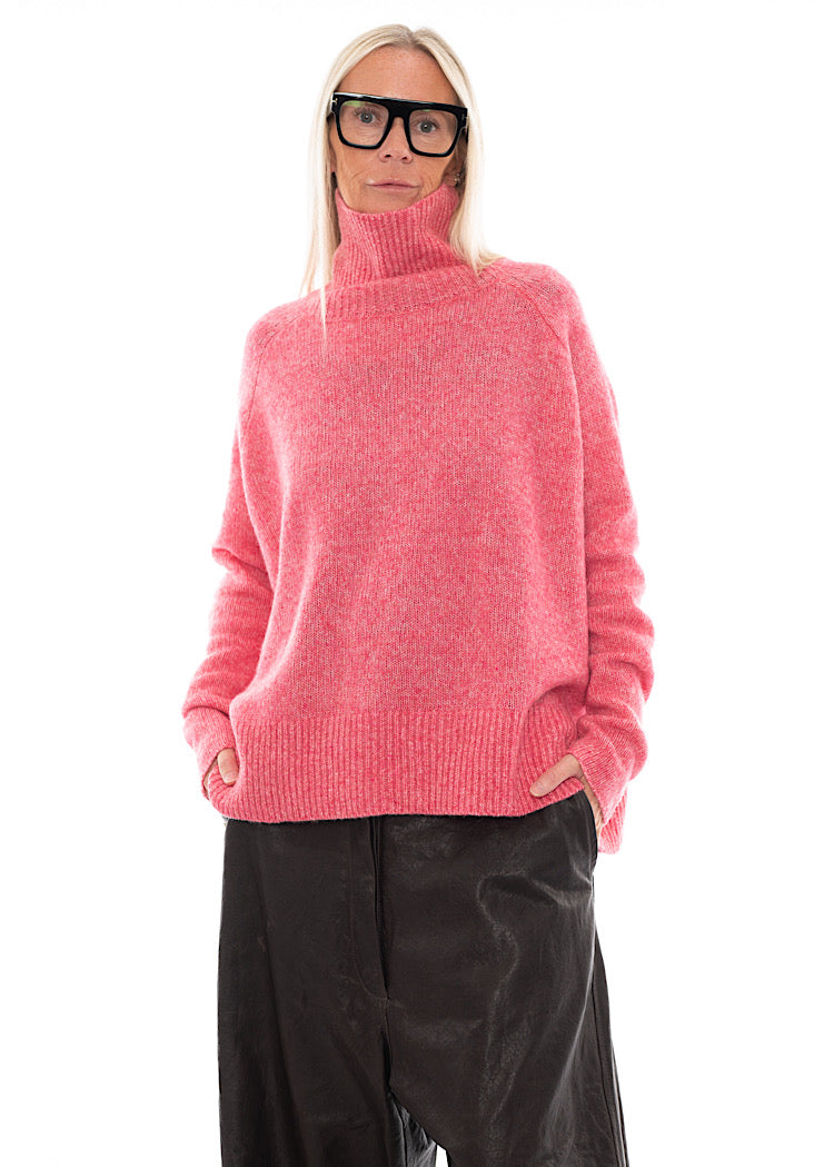 A Wool-Cotton Mix knitted Pullover from RUNDHOLZ BLACK LABEL. This staple oversized Pullover features a slouchy high neckline, scooped hemline with a longer length at the back and finished with long length sleeves. The soft Wool-Mix fabric incorporates a marled effect and textured finish that combine to create a cosy AW25 Pullover. Details include ribbed detailing and rolled edges and for a signature RUNDHOLZ look.