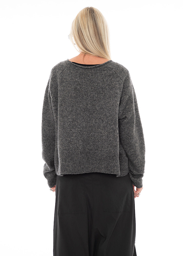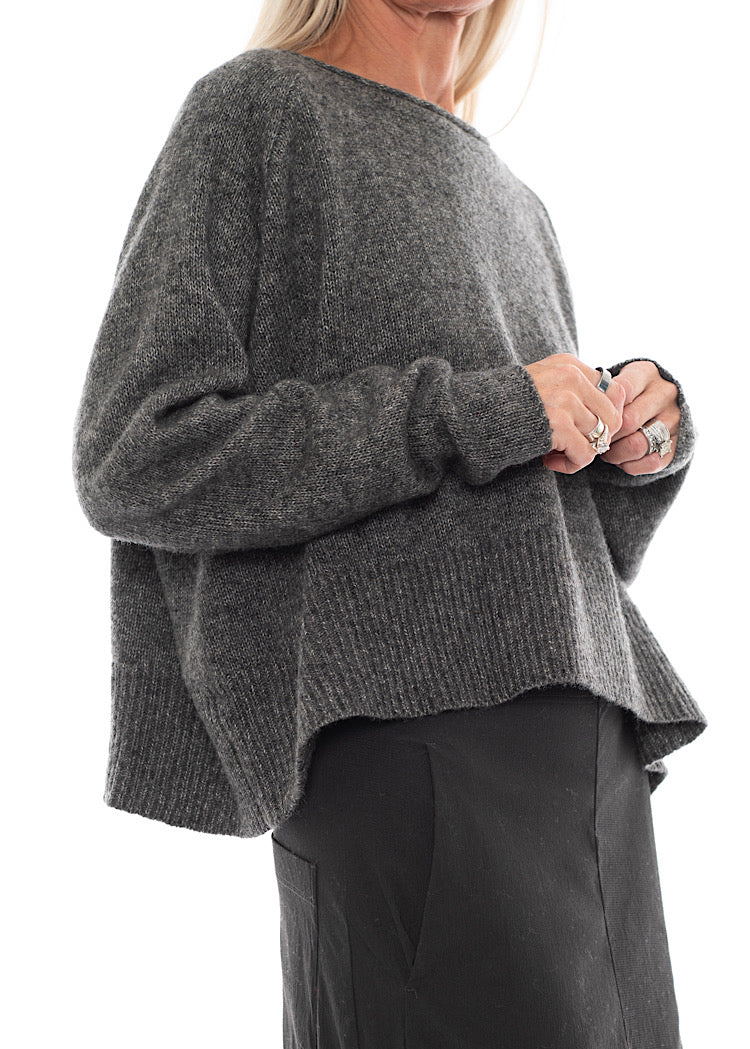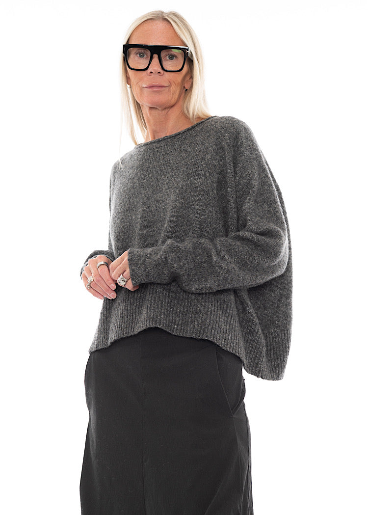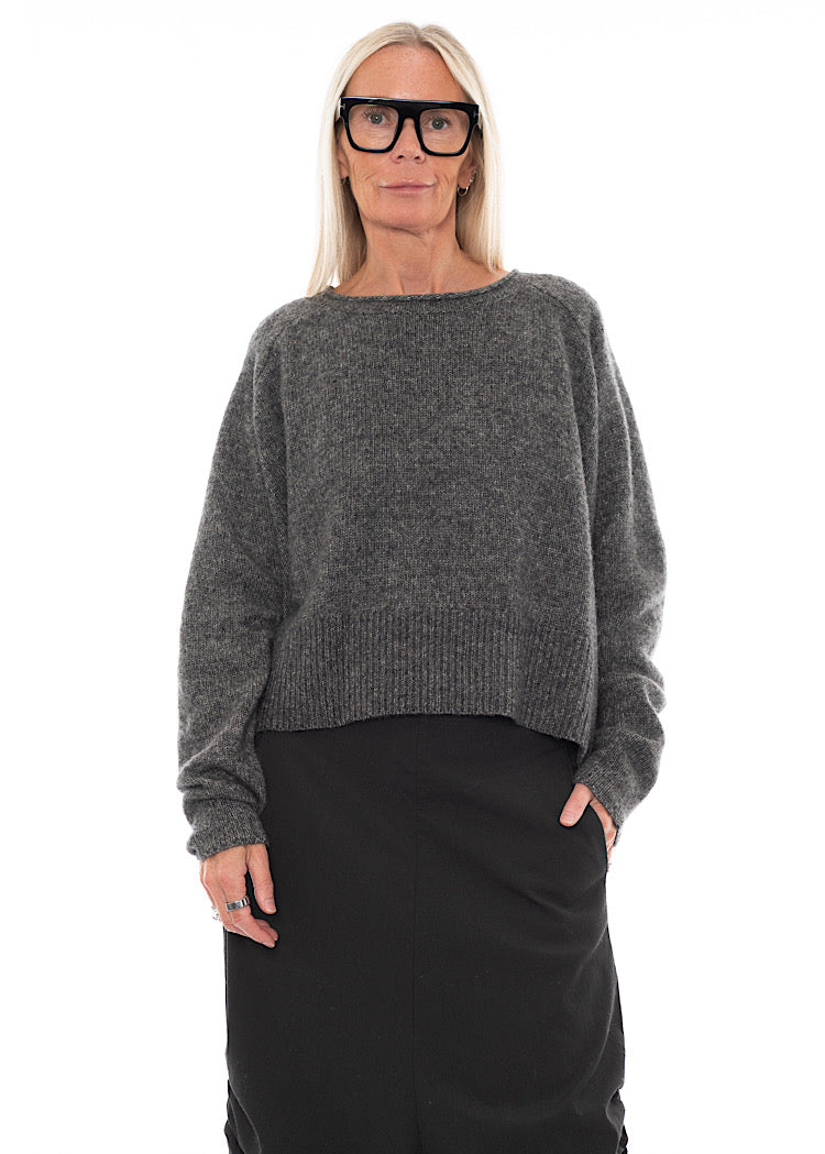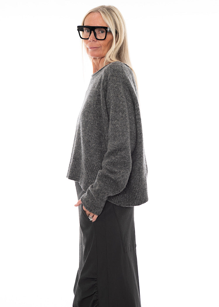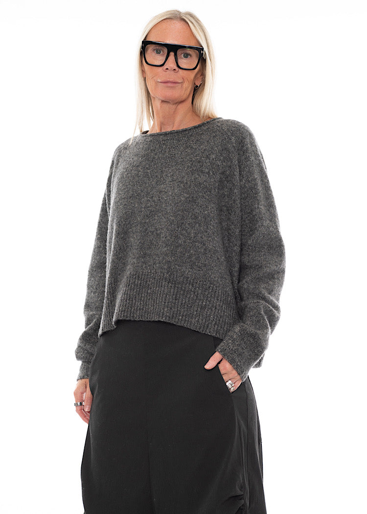A Wool-Cotton Mix knitted Pullover from RUNDHOLZ BLACK LABEL. This cropped, oversized Pullover features a wide round neckline, scooped hemline with a longer length at the back and finished with long length sleeves. The soft Wool-Mix fabric incorporates a marled effect and textured finish that combine to create a cosy AW25 Pullover. Details include ribbed detailing and rolled edges and for a signature RUNDHOLZ look.