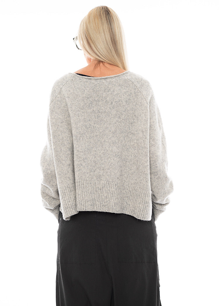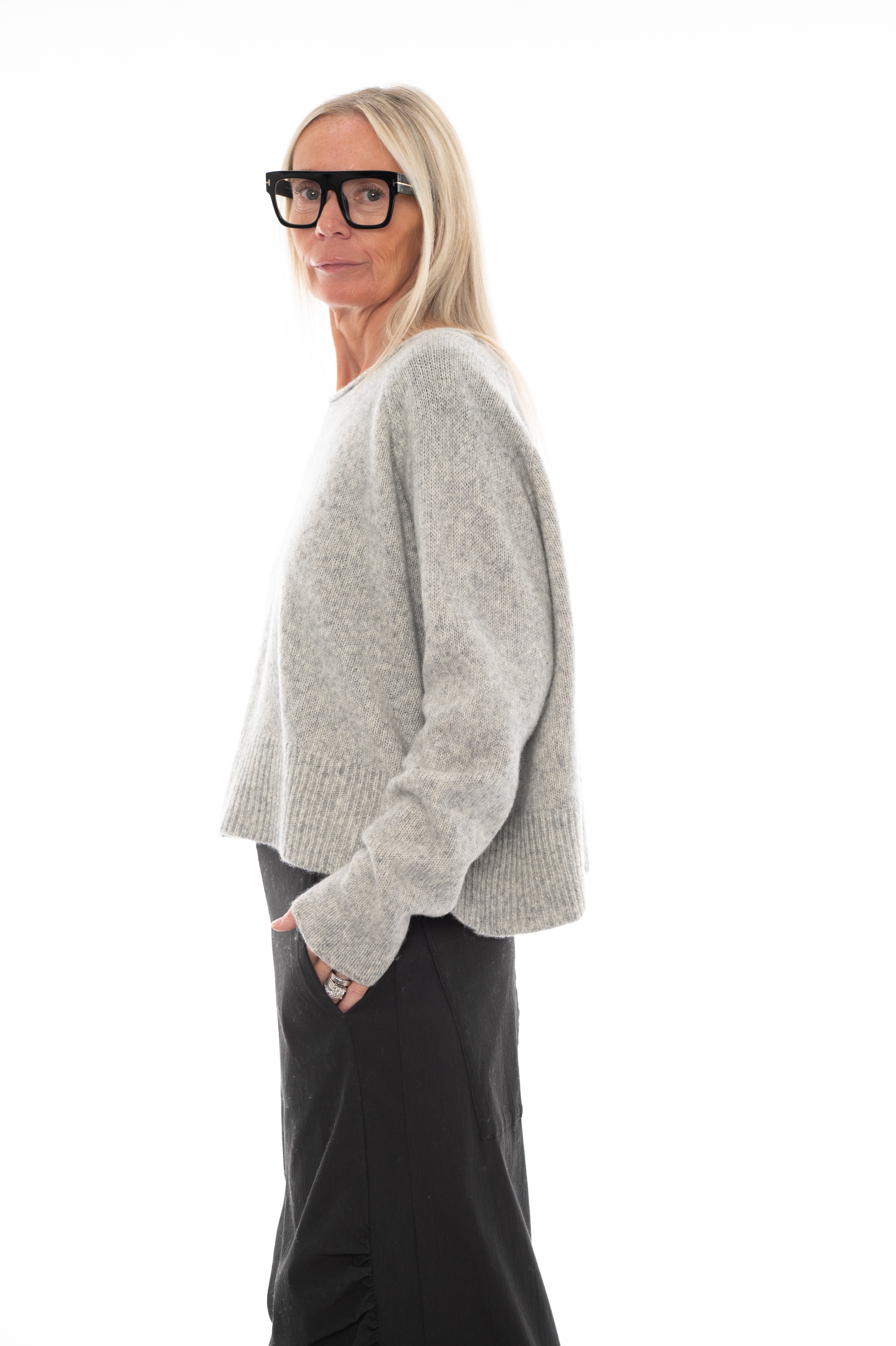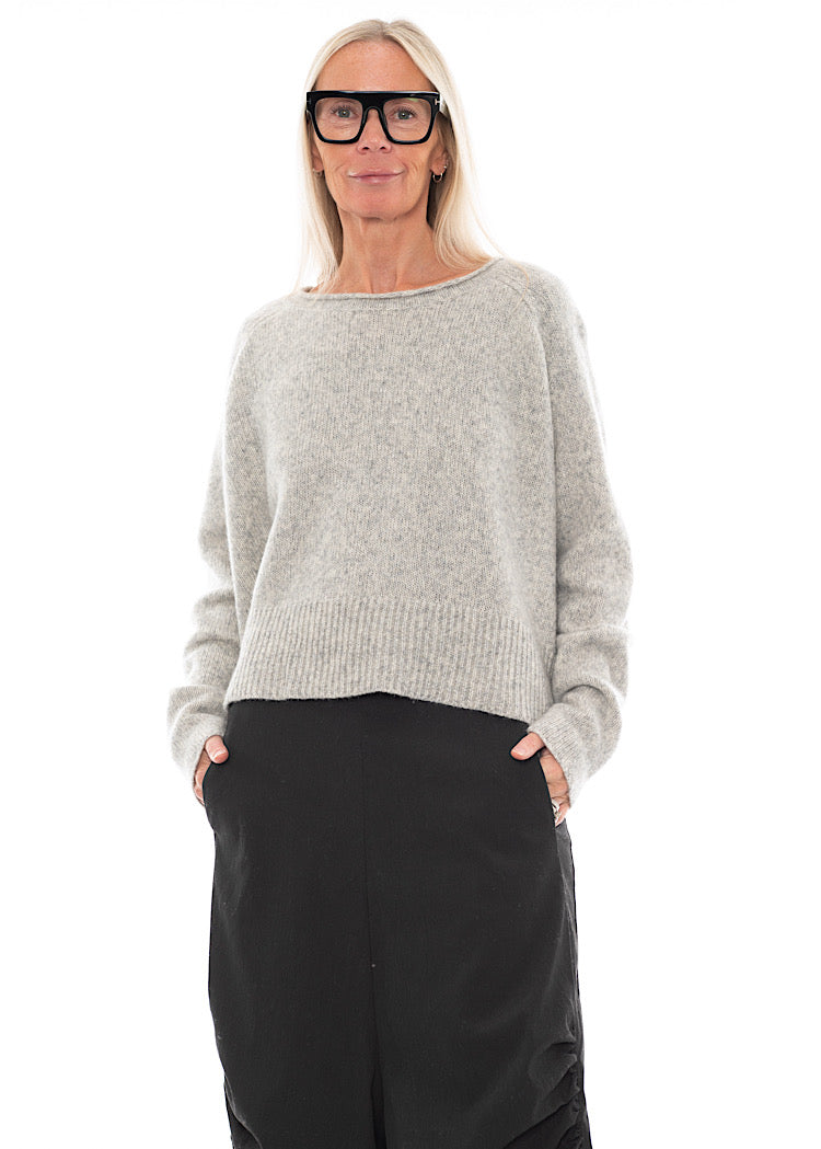 A Wool-Cotton Mix knitted Pullover from RUNDHOLZ BLACK LABEL. This cropped, oversized Pullover features a wide round neckline, scooped hemline with a longer length at the back and finished with long length sleeves. The soft Wool-Mix fabric incorporates a marled effect and textured finish that combine to create a cosy AW25 Pullover. Details include ribbed detailing and rolled edges and for a signature RUNDHOLZ look.