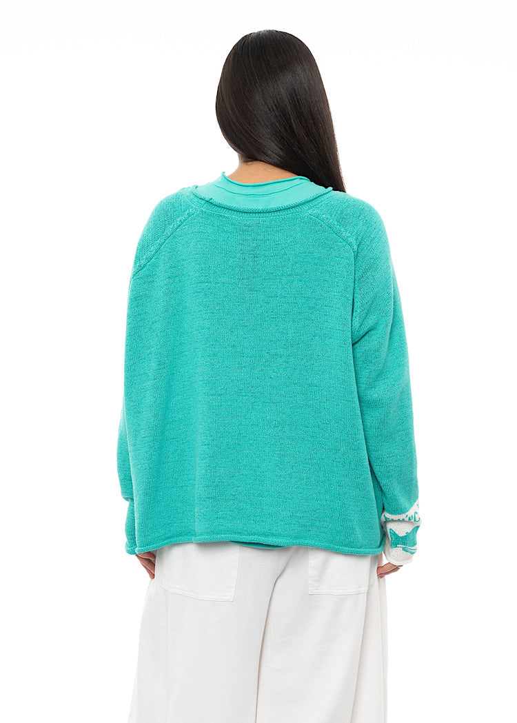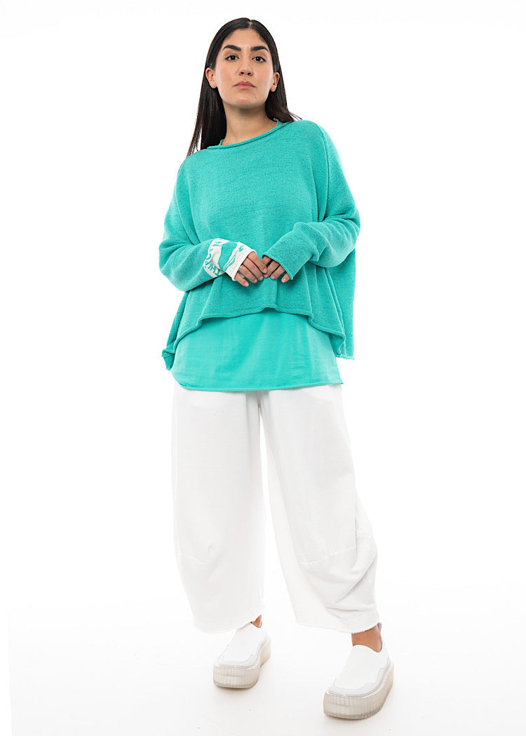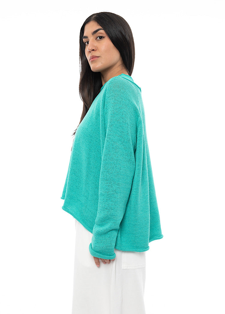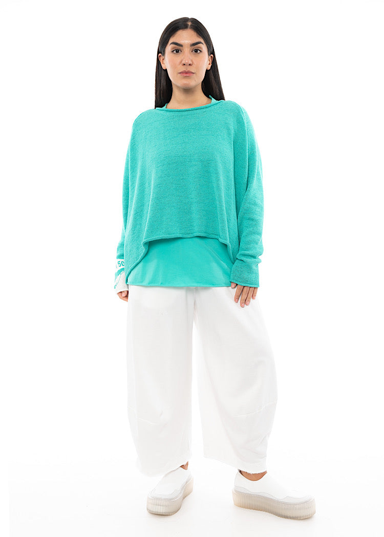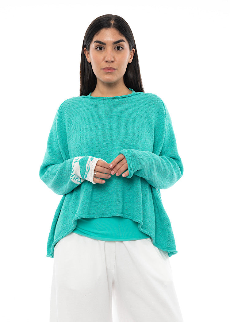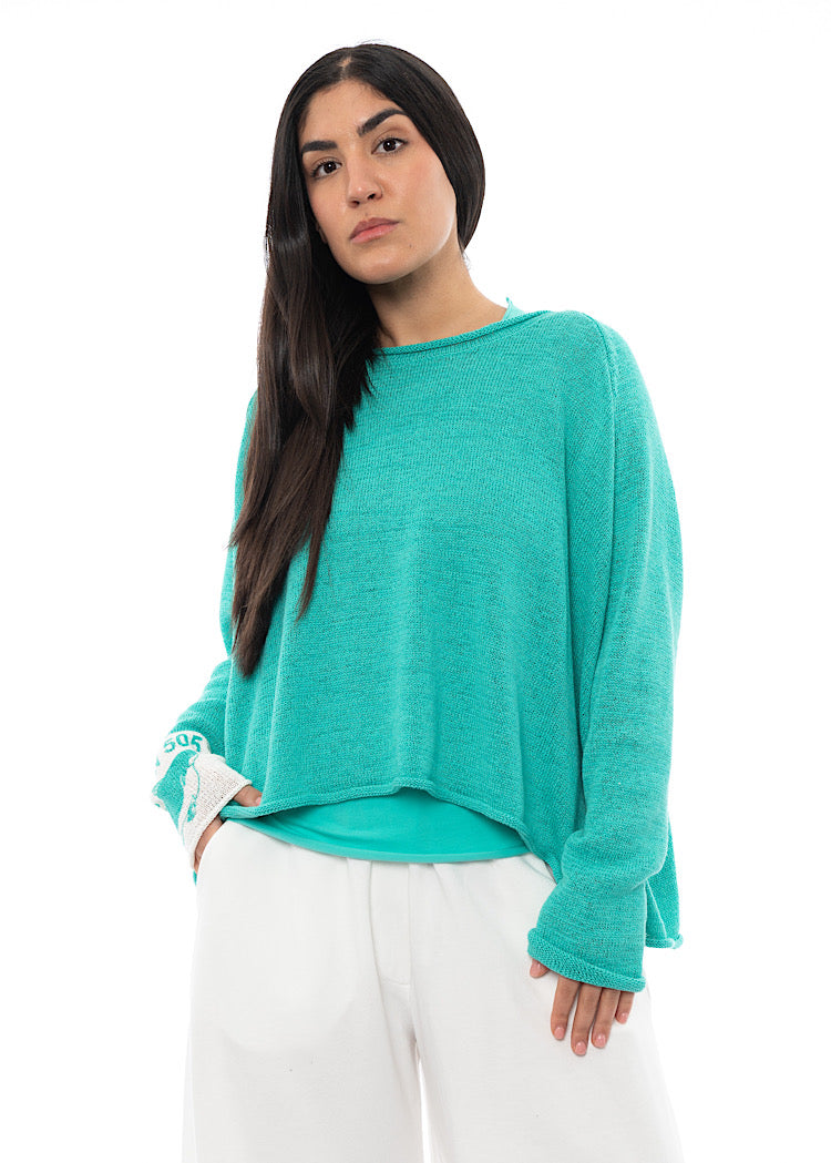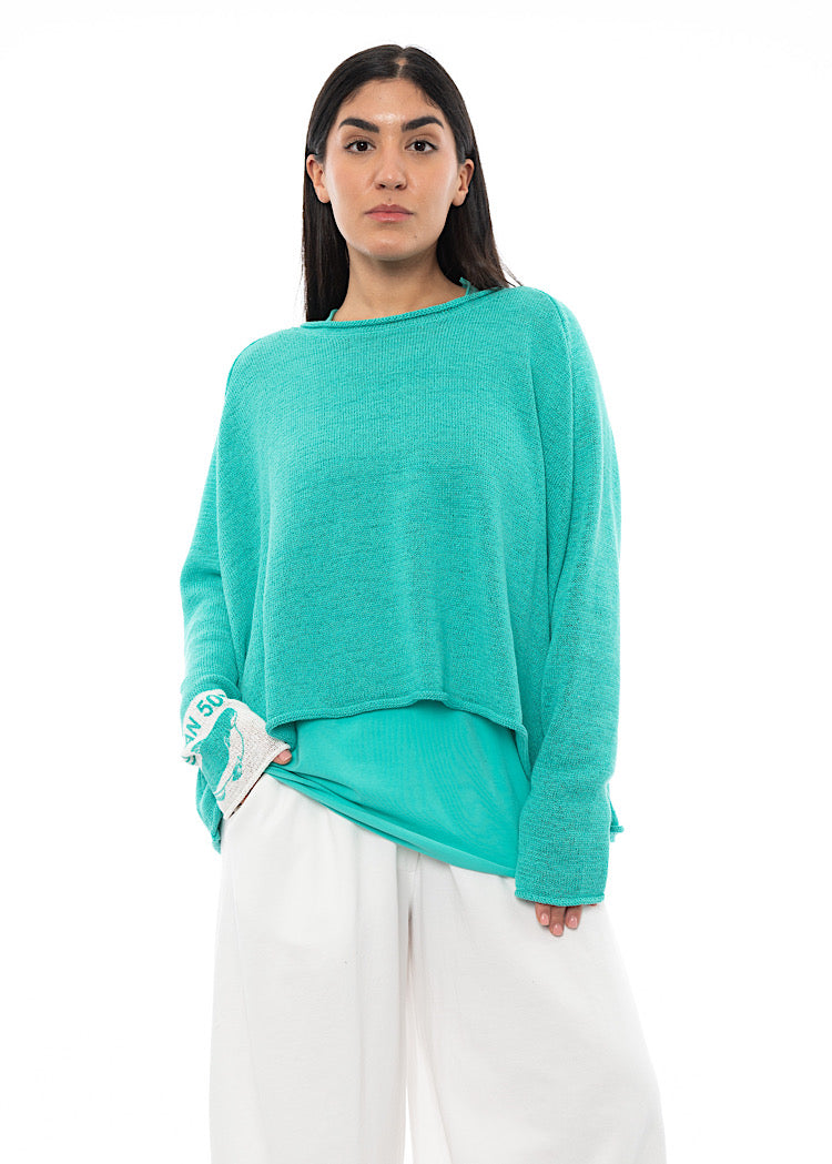 A summer knit in the classic Linen-Cotton mix by RUNDHOLZ BLACK LABEL. This knit has a scooped hemline and a rounded neckline. Also with dropped shoulders giving it a slouchy look and rolled edges. As well as the SS25 motif on the sleeve to finish off.