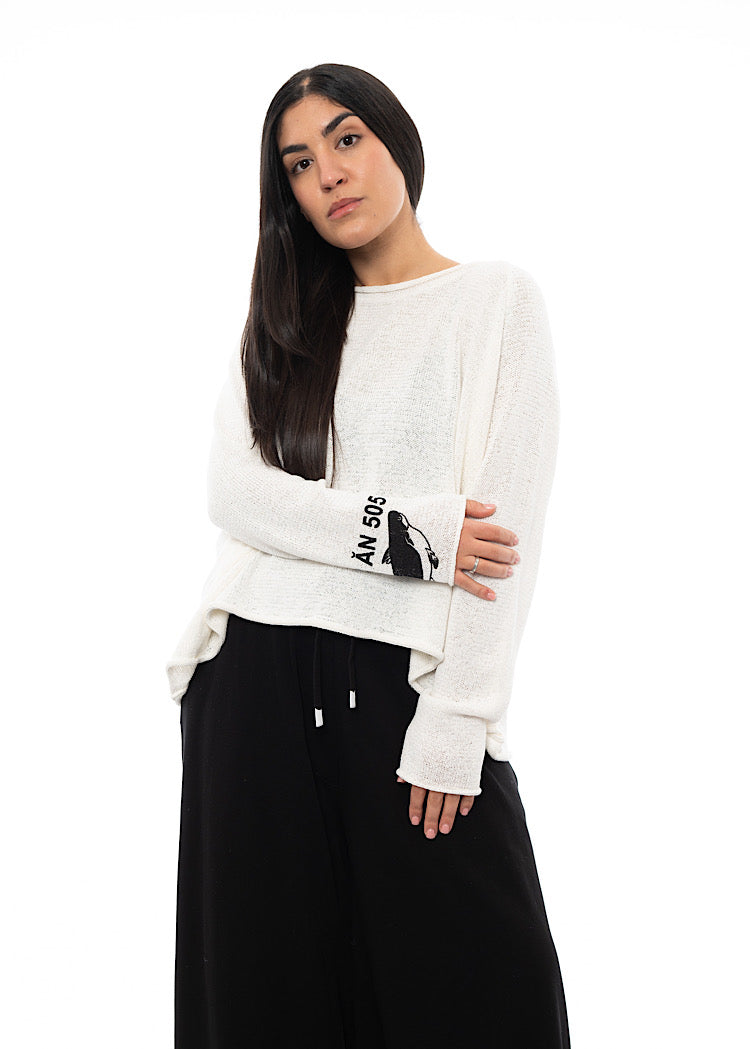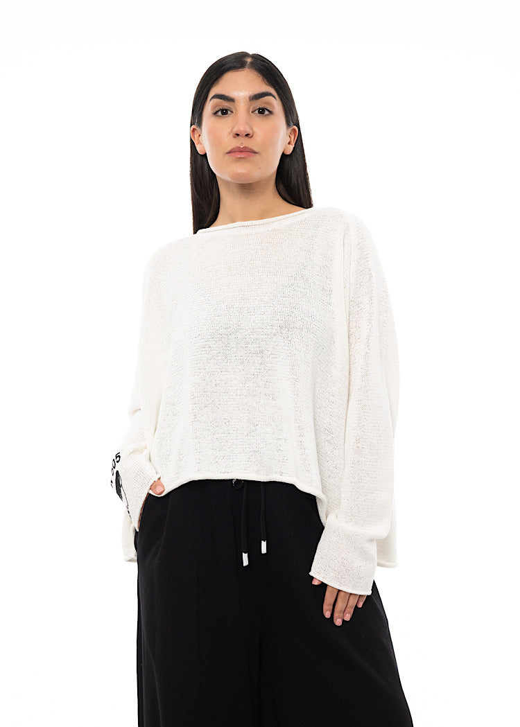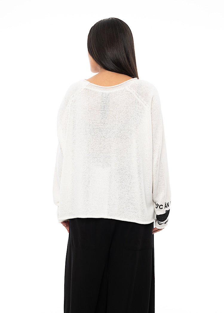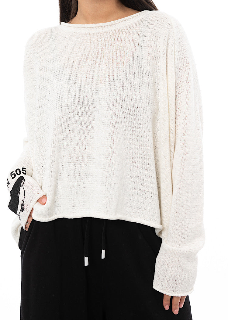 A summer knit in the classic Linen-Cotton mix by RUNDHOLZ BLACK LABEL. This knit has a scooped hemline and a rounded neckline. Also with dropped shoulders giving it a slouchy look and rolled edges. As well as the SS25 motif on the sleeve to finish off.
