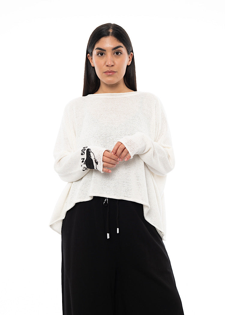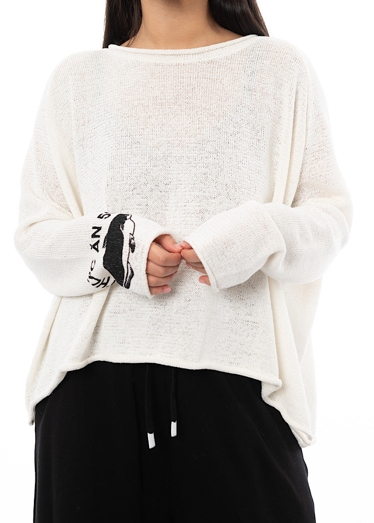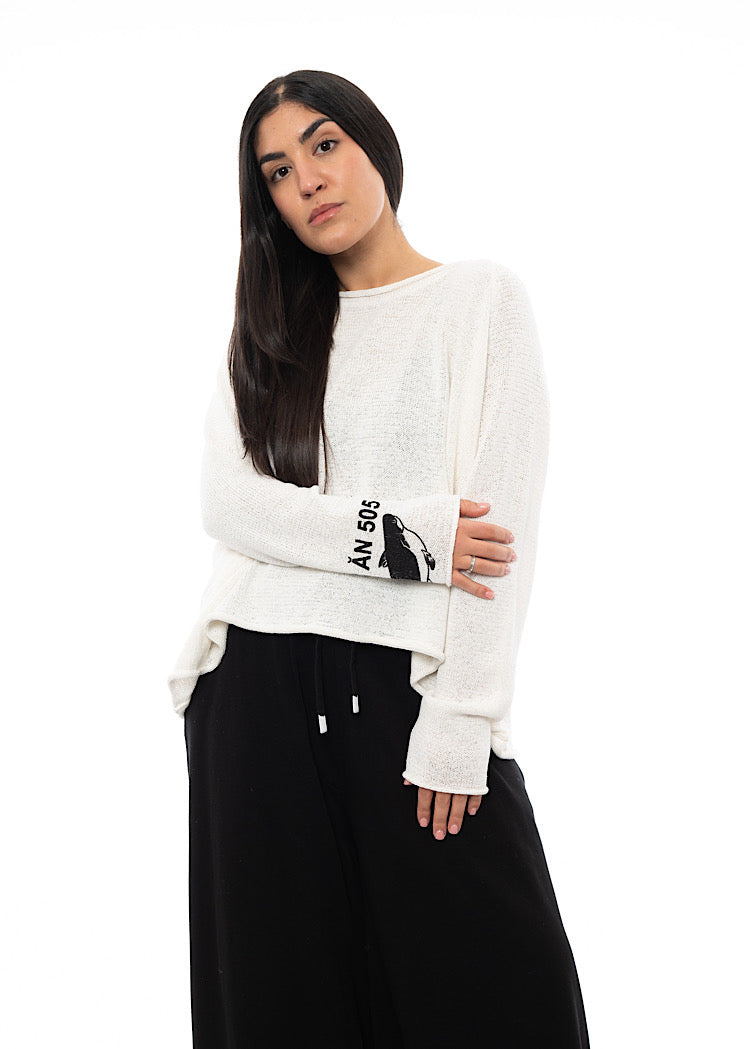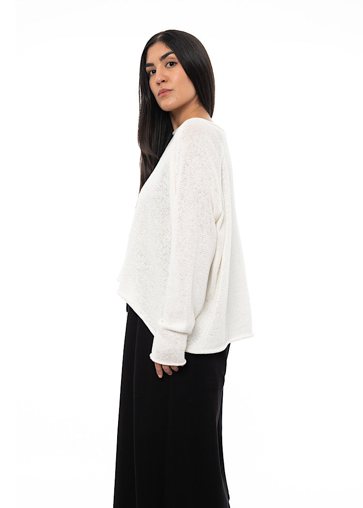 A summer knit in the classic Linen-Cotton mix by RUNDHOLZ BLACK LABEL. This knit has a scooped hemline and a rounded neckline. Also with dropped shoulders giving it a slouchy look and rolled edges. As well as the SS25 motif on the sleeve to finish off.