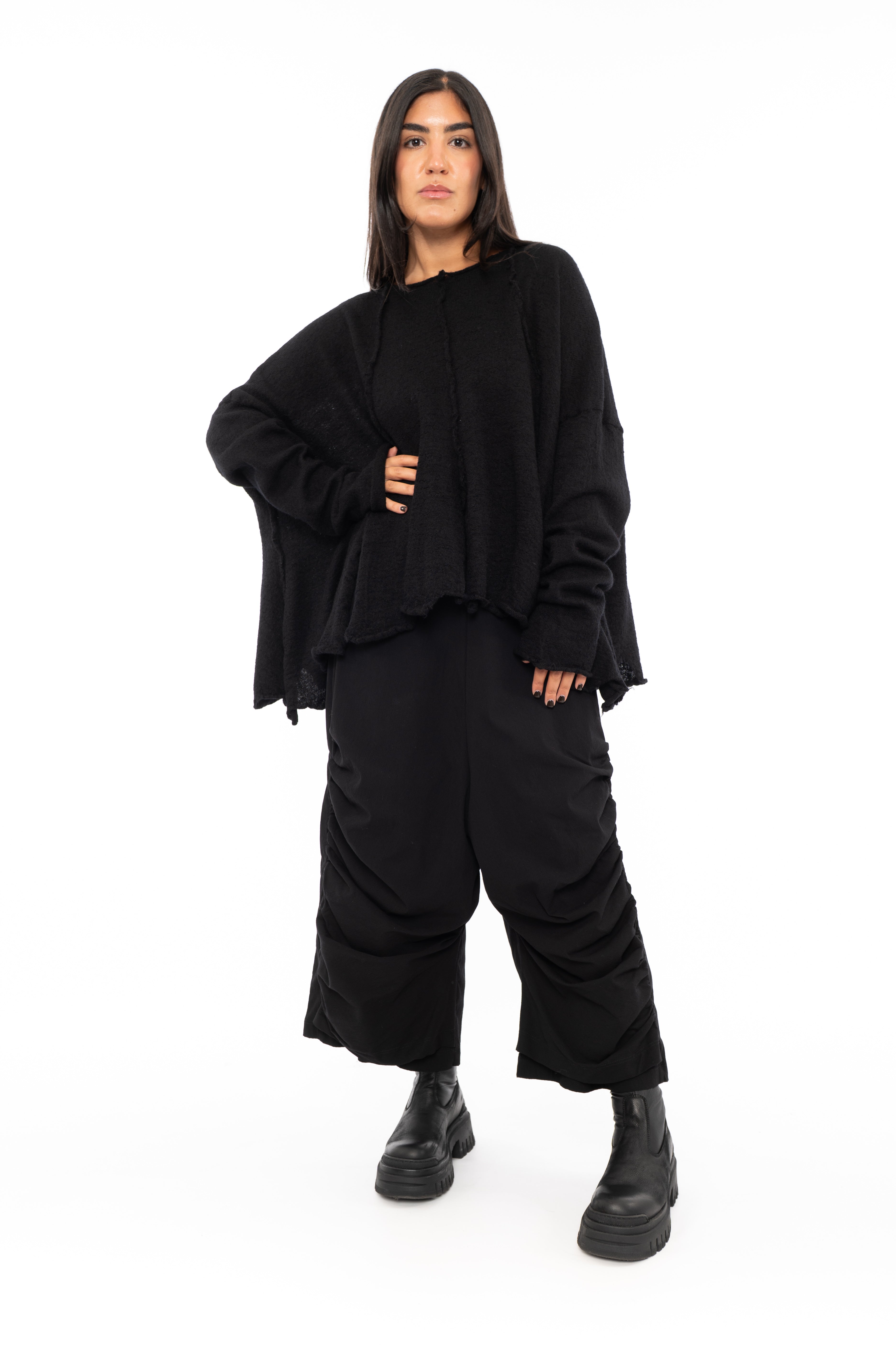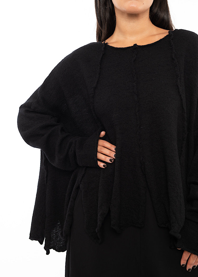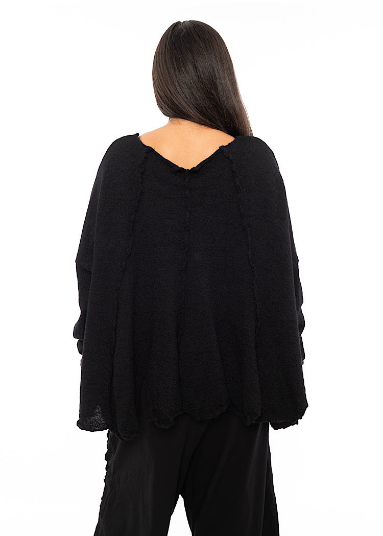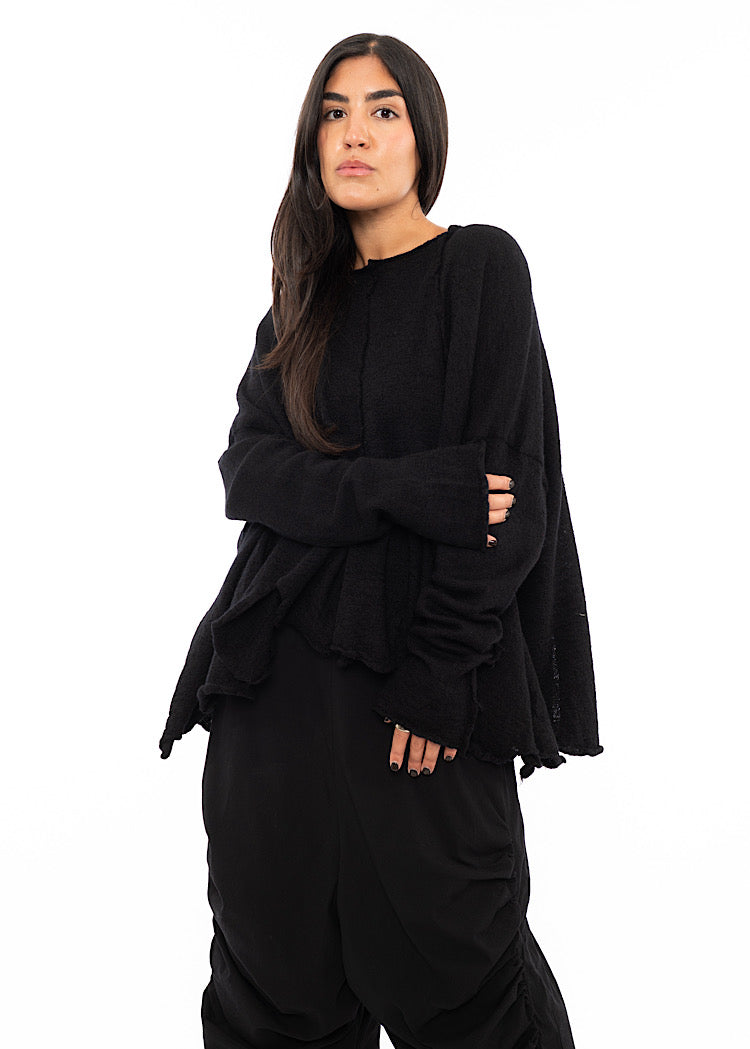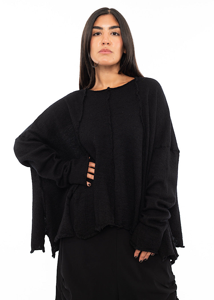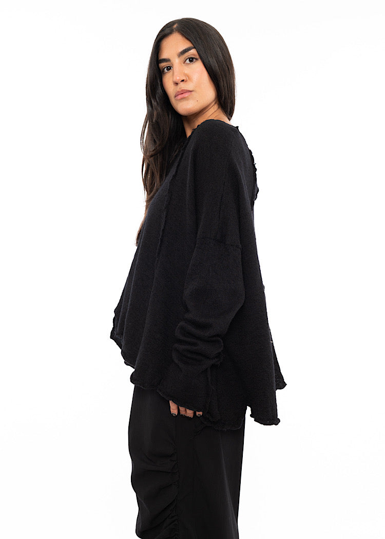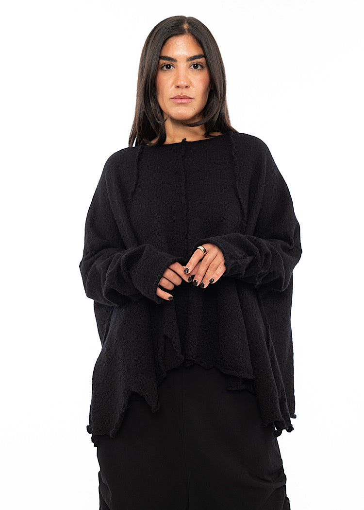 A statement boiled Wool pullover from RUNDHOLZ BLACK LABEL AW25. Designed with a generous oversized fit, it features raw-edge seams that run vertically down the front for a deconstructed look, and a softly rolled hem that creates fluid movement. The bright hues - Rose, Lotus and Lily - add a playful edge, perfect for layering over tonal skirts or trousers to echo the collection’s bold, art-inspired aesthetic. And who could resist Black?