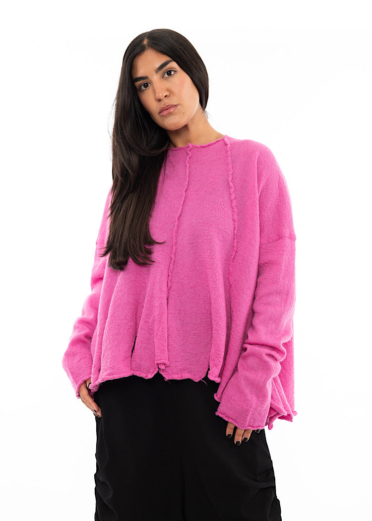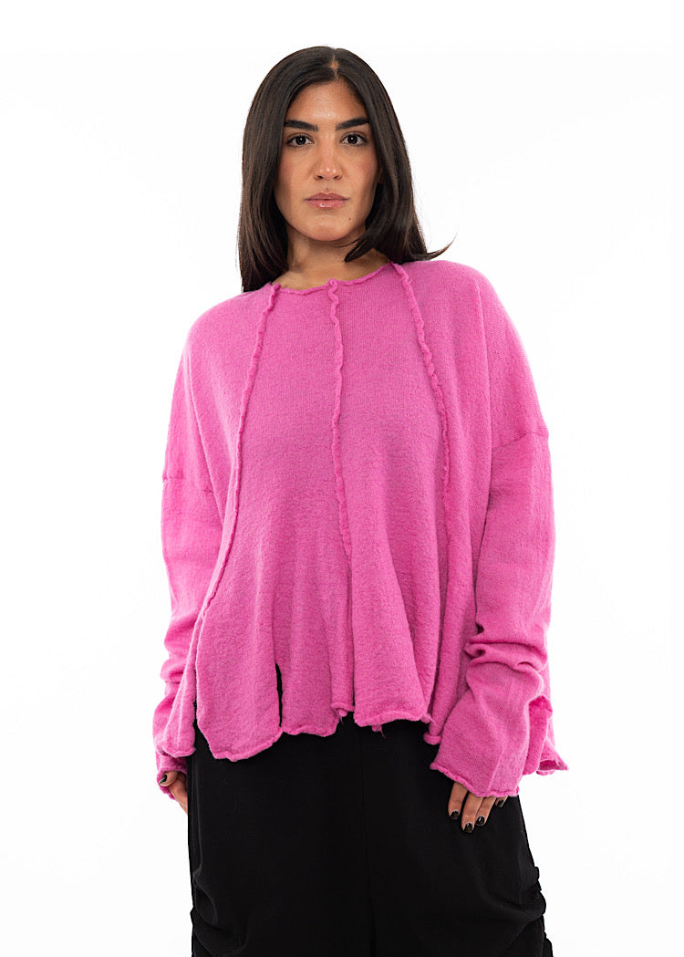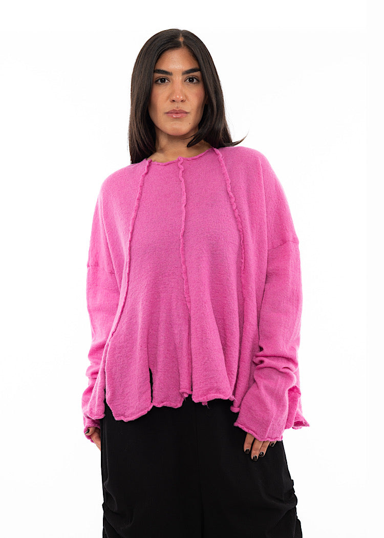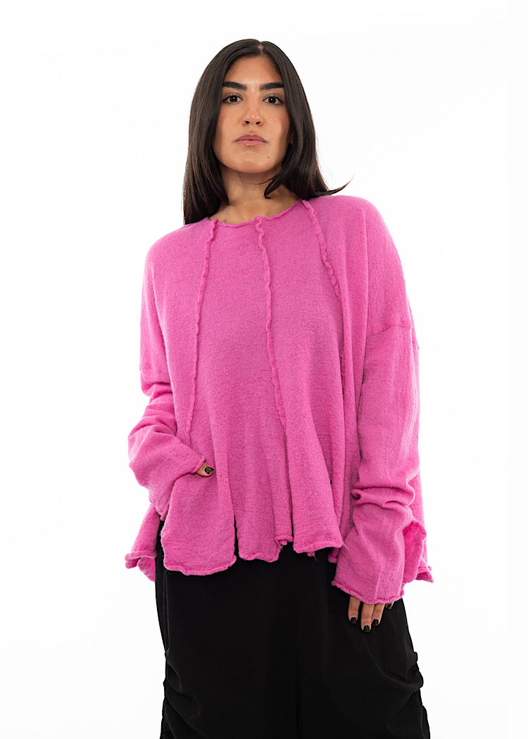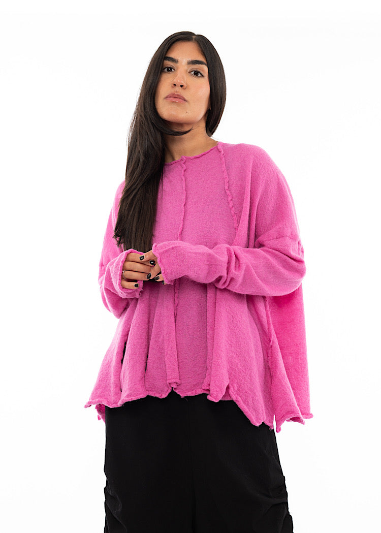 A statement boiled Wool pullover from RUNDHOLZ BLACK LABEL AW25. Designed with a generous oversized fit, it features raw-edge seams that run vertically down the front for a deconstructed look, and a softly rolled hem that creates fluid movement. The bright hues - Rose, Lotus and Lily - add a playful edge, perfect for layering over tonal skirts or trousers to echo the collection’s bold, art-inspired aesthetic. And who could resist Black?