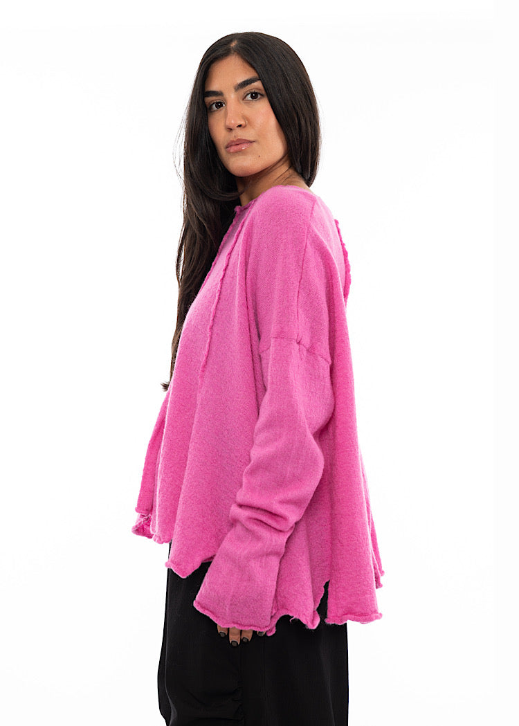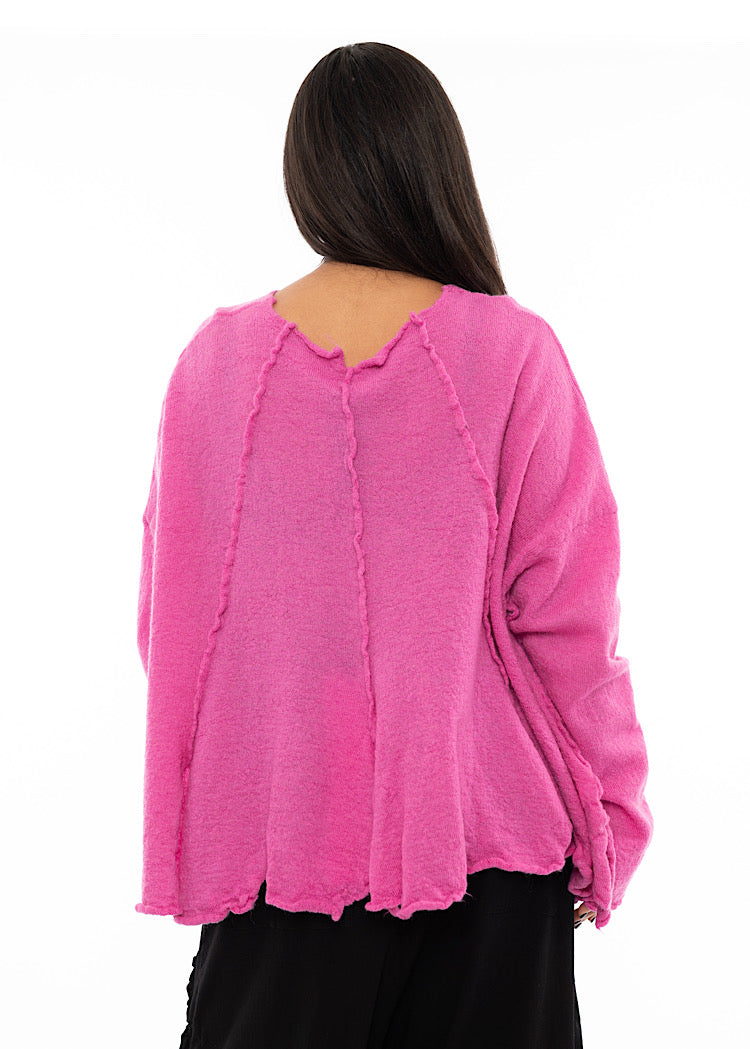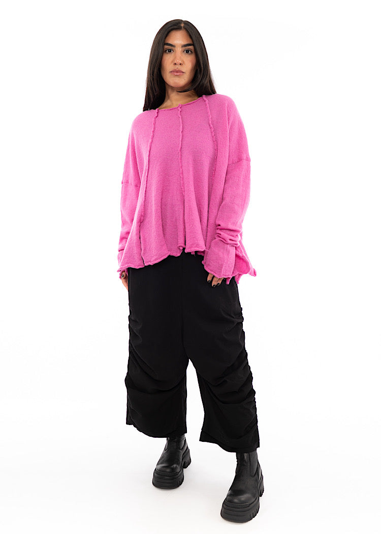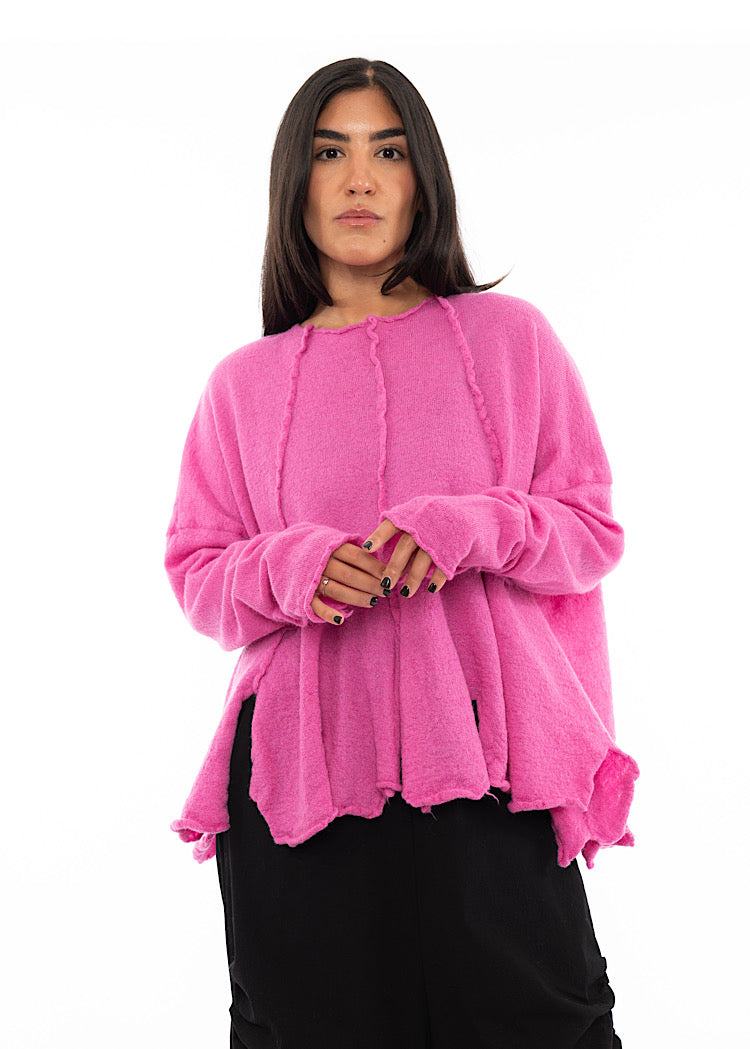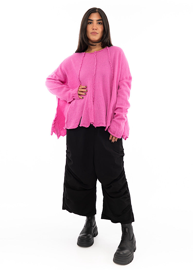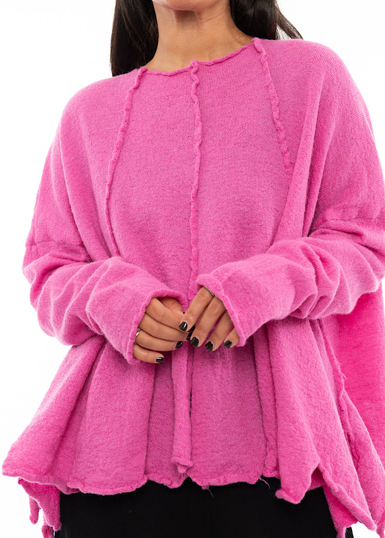 A statement boiled Wool pullover from RUNDHOLZ BLACK LABEL AW25. Designed with a generous oversized fit, it features raw-edge seams that run vertically down the front for a deconstructed look, and a softly rolled hem that creates fluid movement. The bright hues - Rose, Lotus and Lily - add a playful edge, perfect for layering over tonal skirts or trousers to echo the collection’s bold, art-inspired aesthetic. And who could resist Black?