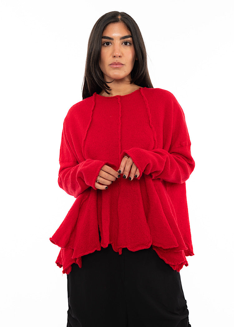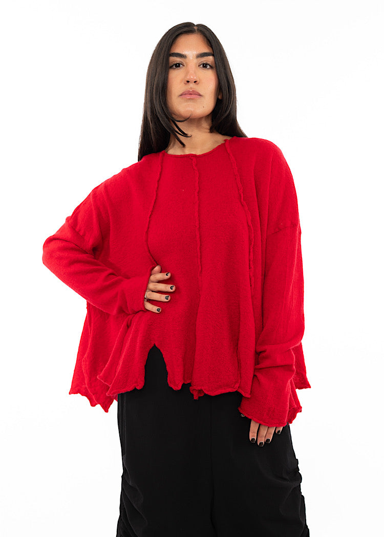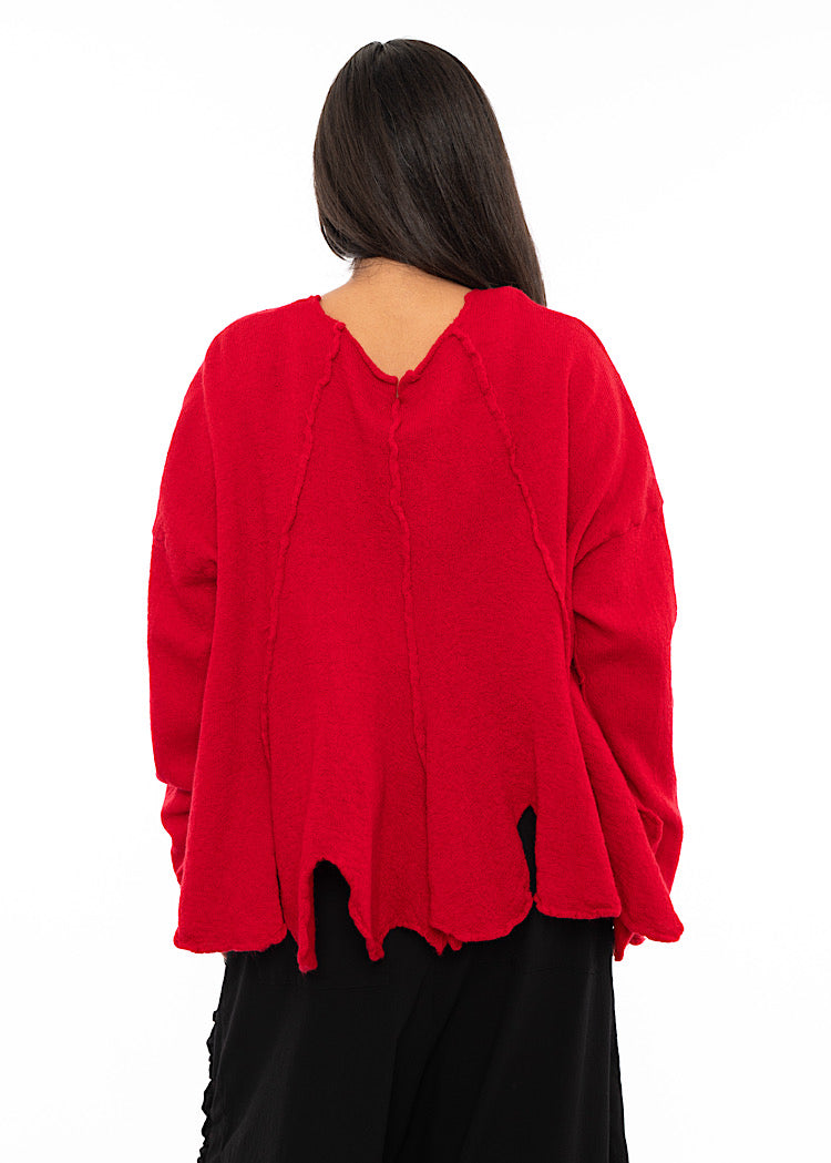 A statement boiled Wool pullover from RUNDHOLZ BLACK LABEL AW25. Designed with a generous oversized fit, it features raw-edge seams that run vertically down the front for a deconstructed look, and a softly rolled hem that creates fluid movement.