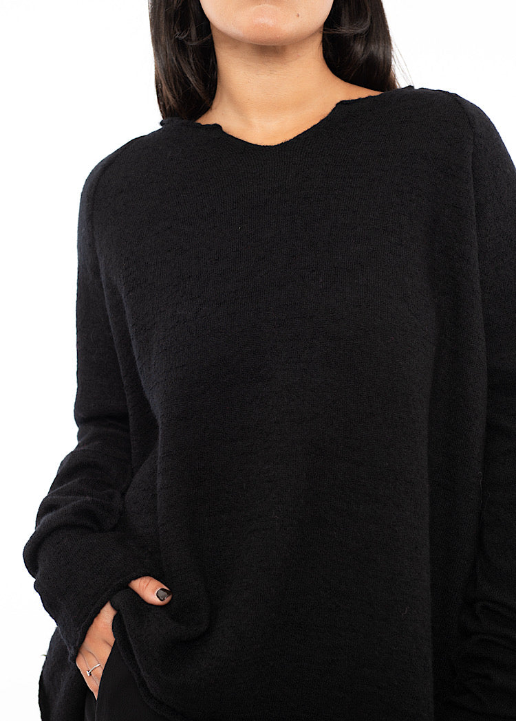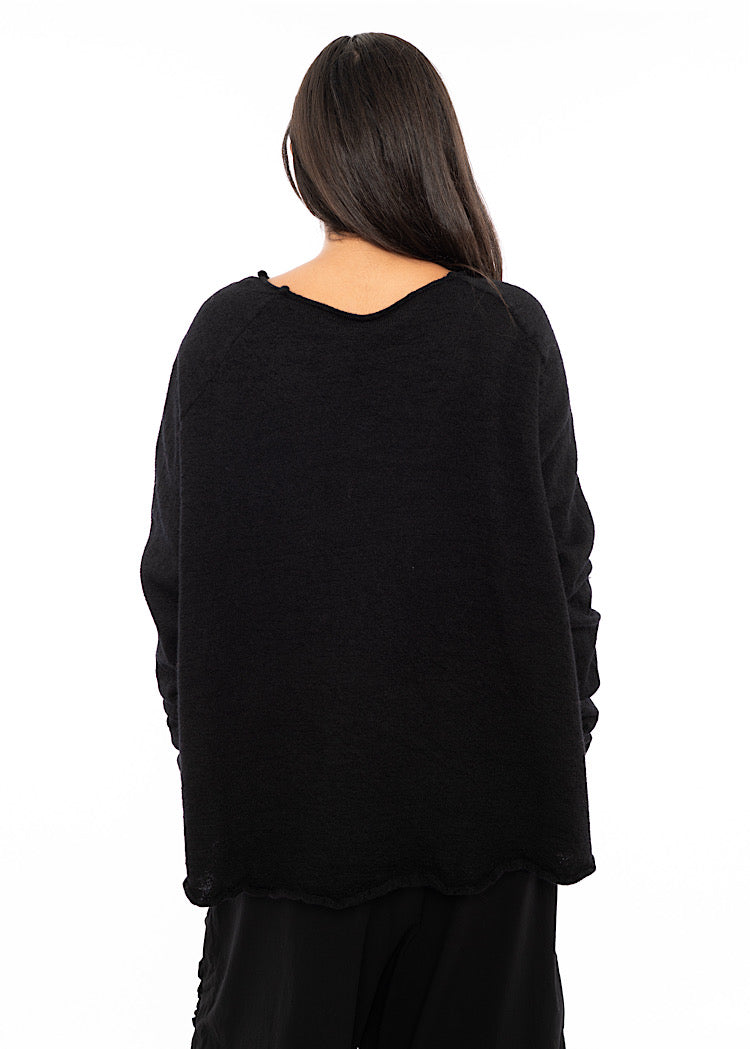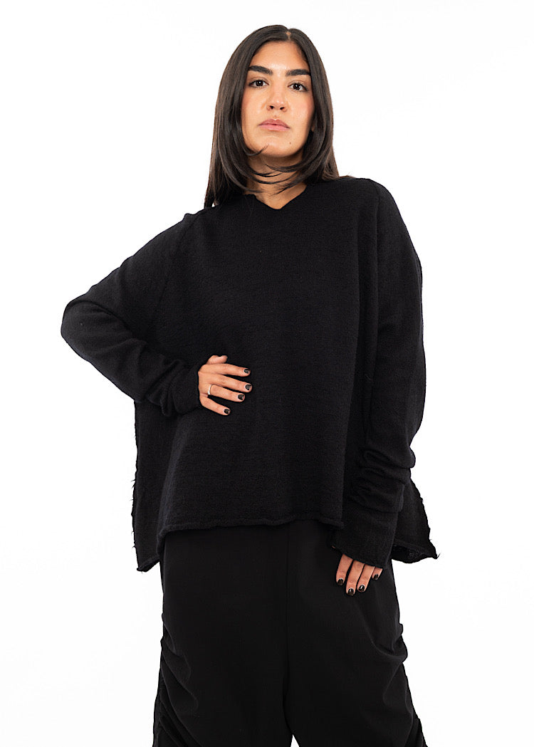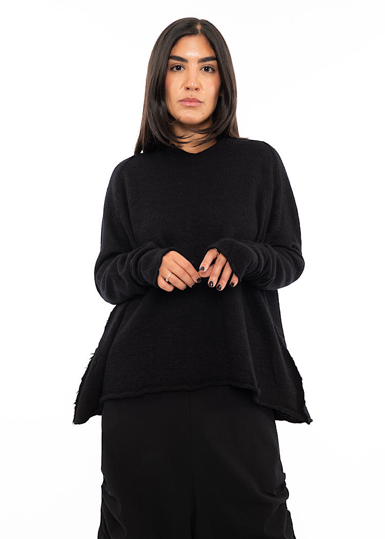 A staple boiled Wool pullover from RUNDHOLZ BLACK LABEL Autumn/Winter '25. Designed with a generous oversized fit, it features a subtle slit neckline, dropped shoulders, scooped hemline and a softly rolled hem that creates fluid movement. The bright hues - Rose, Lotus and Lily - add a playful edge, perfect for layering over tonal skirts or trousers to echo the collection’s bold, art-inspired aesthetic. And who could resist Black?
