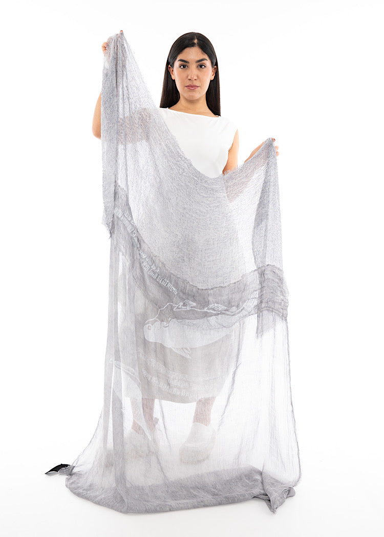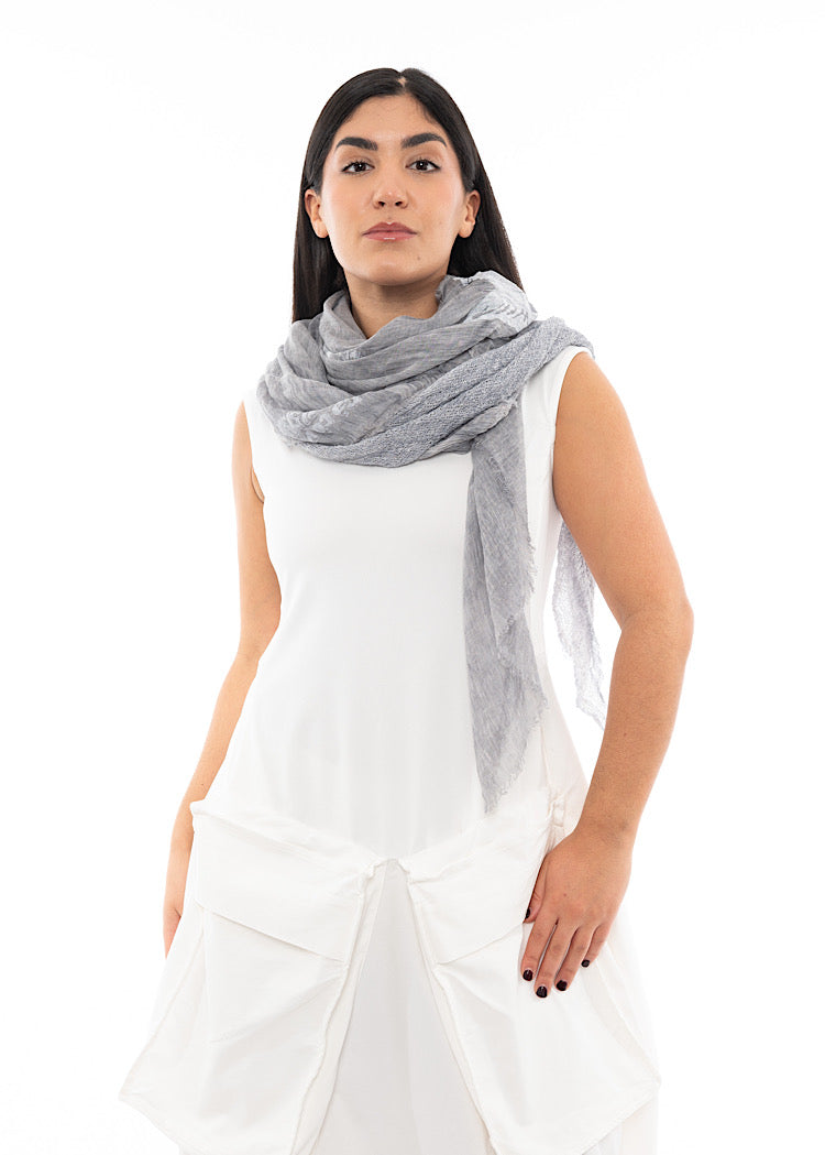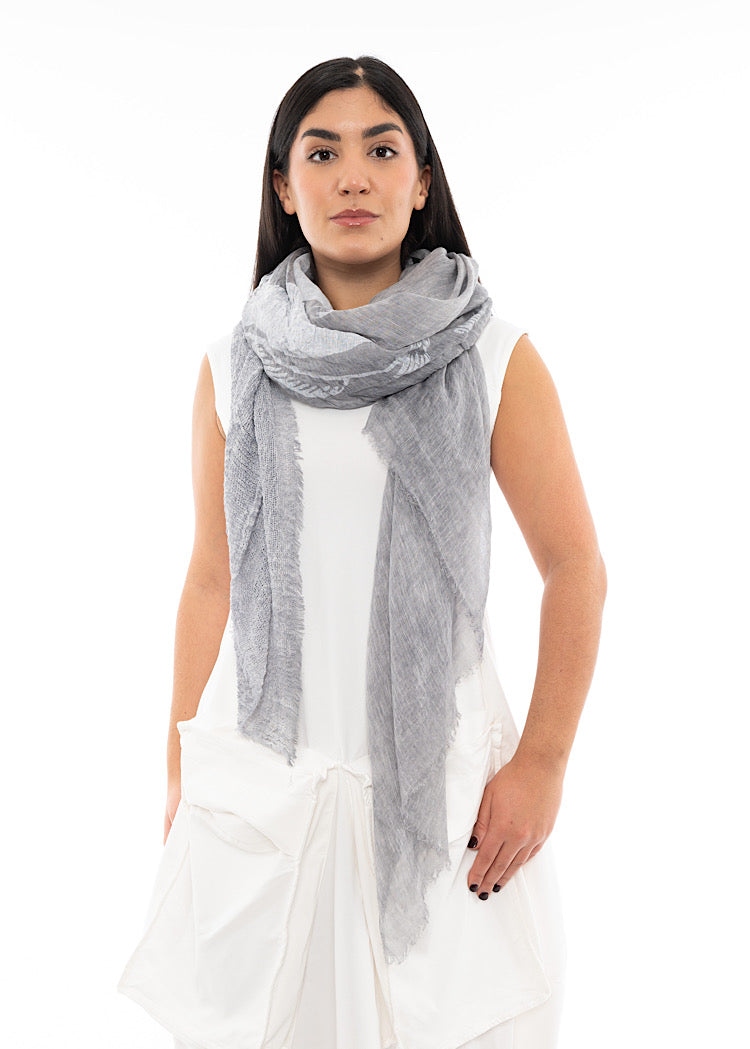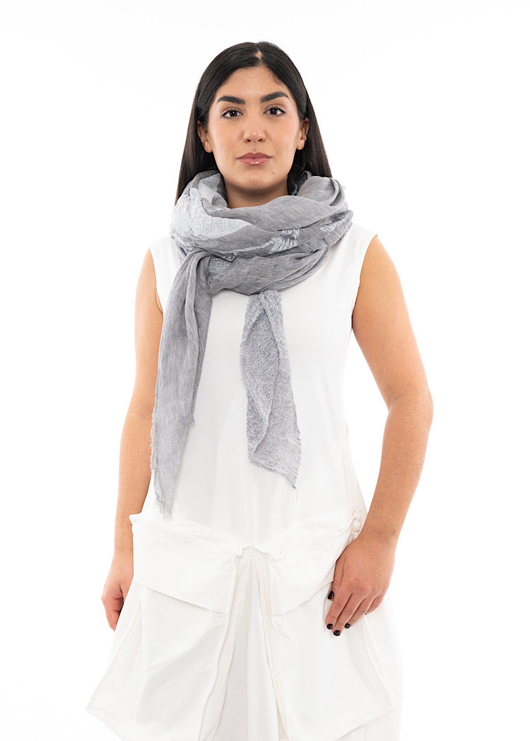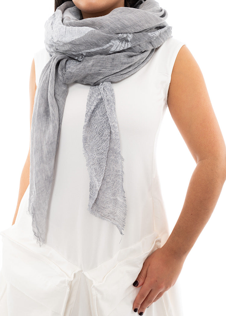 A long rectangular shaped Scarf from RUNDHOLZ BLACK LABEL. Features include a layered fabric, raw edges and finished in a subtle printed design.