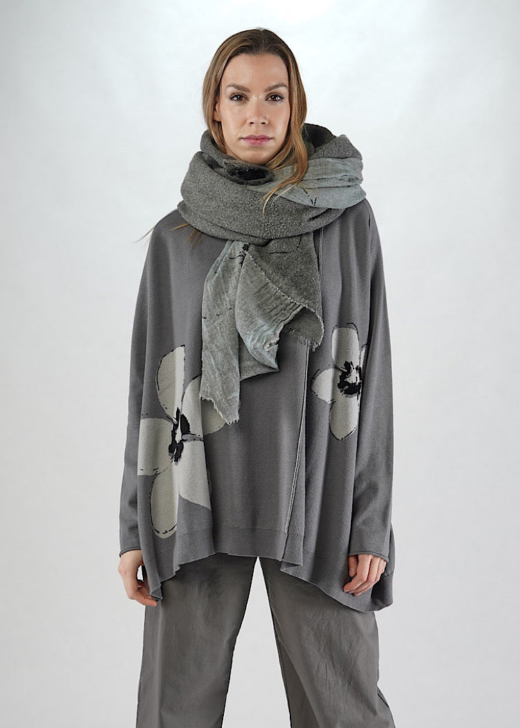 A Wool scarf from RUNDHOLZ BLACK LABEL featuring the Autumn/Winter '25 motif, inspired in part by the vivid iconography of Andy Warhol’s flower prints. This scarf combines a light-weight Wool-Mix fabric with a knitted Wool panel. Details include frayed edges and a distressed dye finish for a signature RUNDHOLZ look.