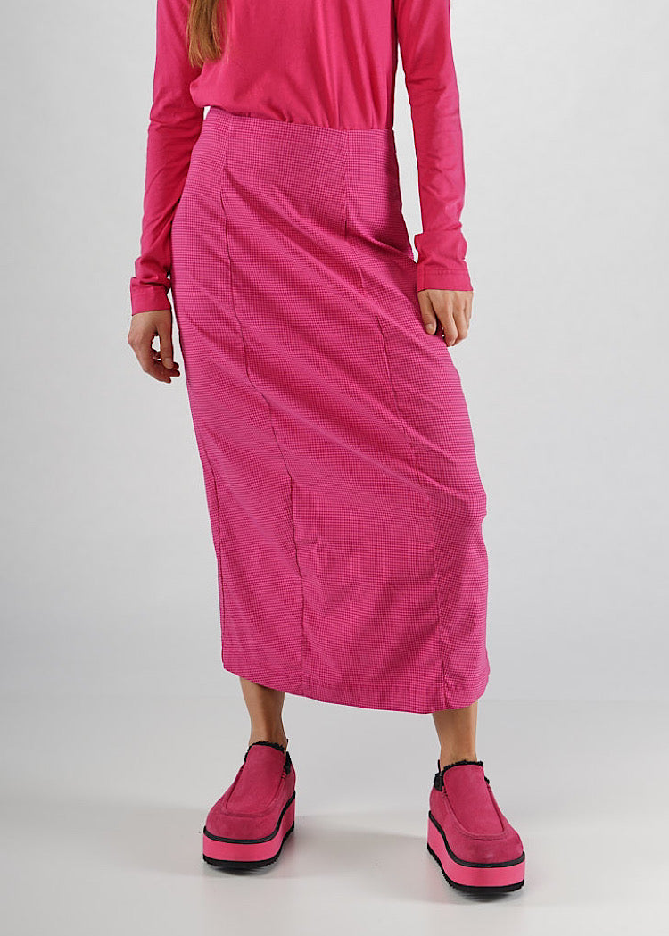 A staple techno skirt with signature RUNDHOLZ BLACK LABEL shaping, in a comfortable stretch Viscose-Mix material and printed with a micro-check pattern. The skirt is a pull on style with stretch to enable a comfortable fit.