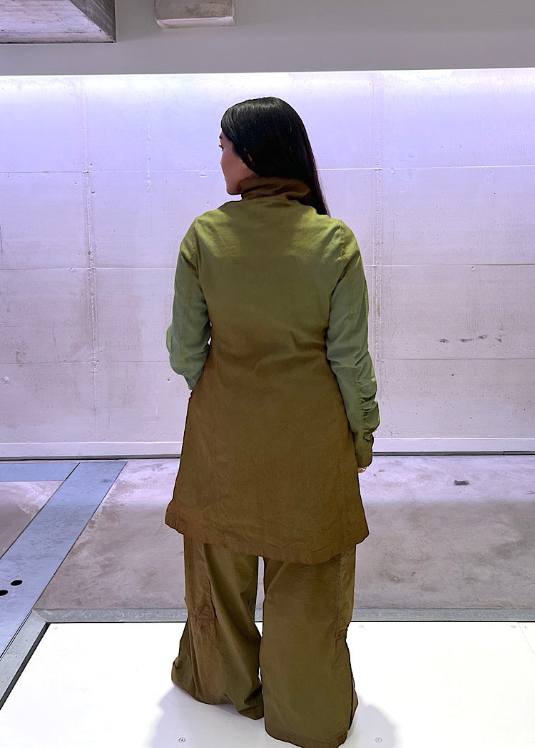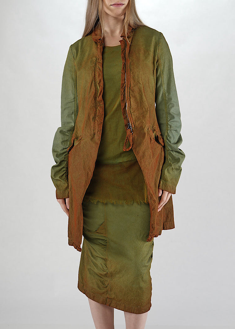 A stretch-fit tailcoat from RUNDHOLZ DIP, crafted from a distressed-dyed Cotton canvas with an experimental two-tone vintage wash. The fitted jacket features a stand collar, sculpted seams and angled front facing pockets for a contemporary look. Fastened at the front with a two-way zip. Detailed with ruched sleeves.