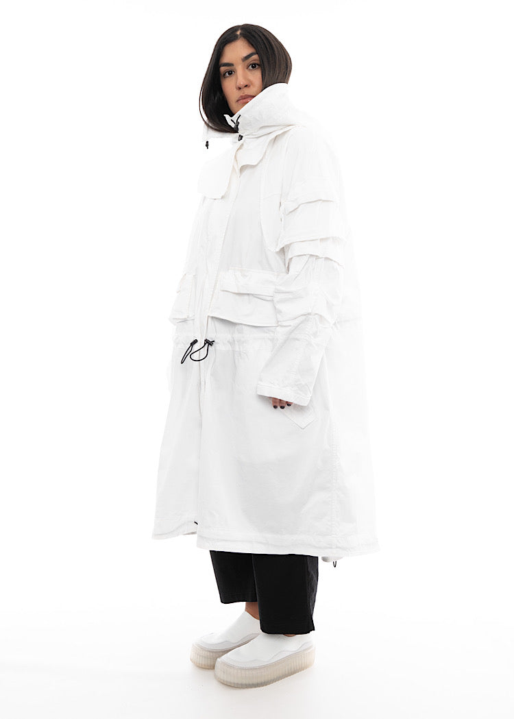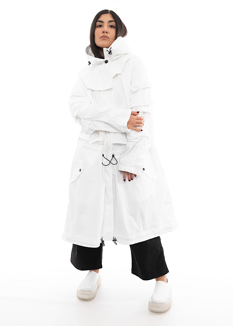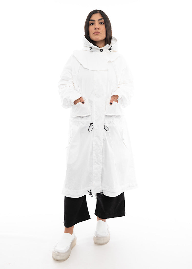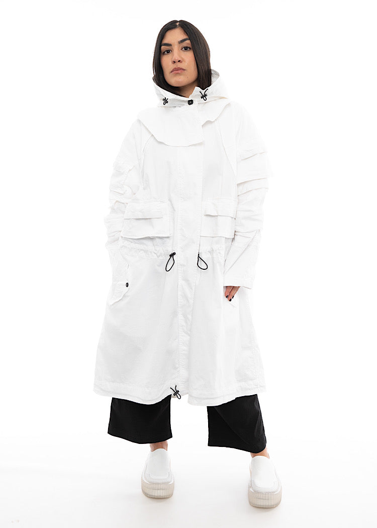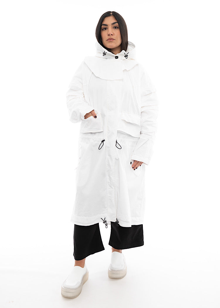 A medium weight, longline style Coat from RUNDHOLZ DIP for the Spring/Summer ‘25 season. Features include a collared neckline, long sleeves with exaggerated pocket details, drawstring ties to the waist and a hooded detail.