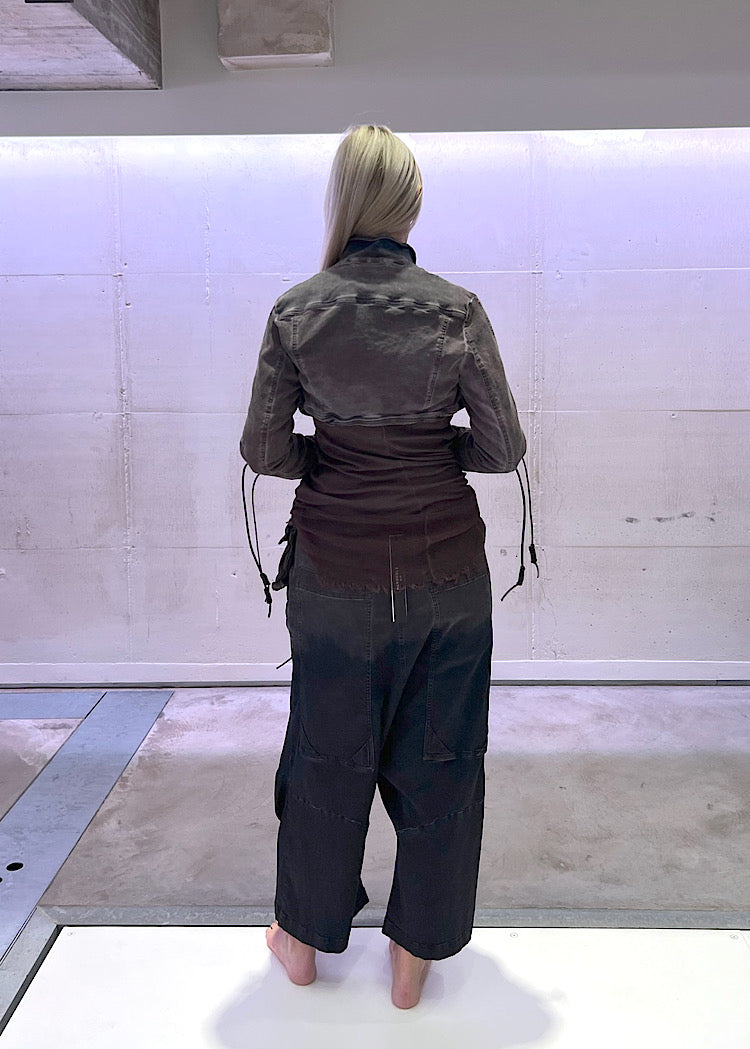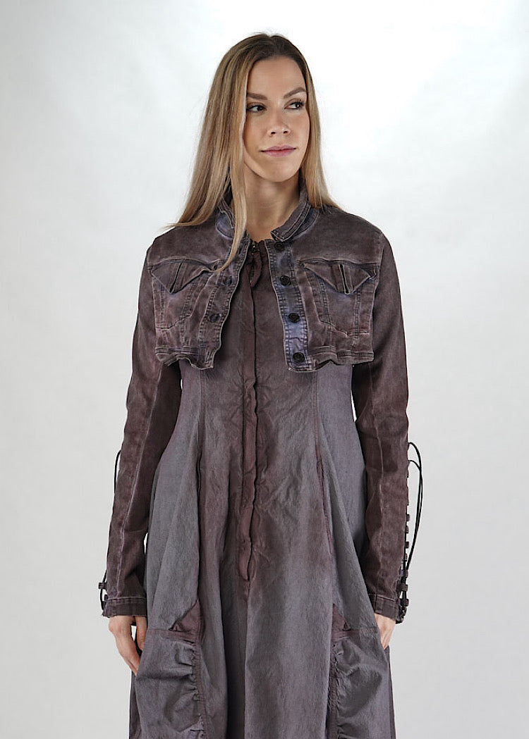 A cropped denim Jacket from RUNDHOLZ DIP AW25, crafted from soft distressed-dyed Cotton with a washed vintage finish. Features two front facing pockets, detailed with sculptural folds, a neat collar and buttons to fasten. Leather lace-up ties along the sleeves add a distinctive edge, channeling the brand’s signature artistic aesthetic.