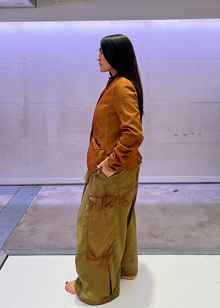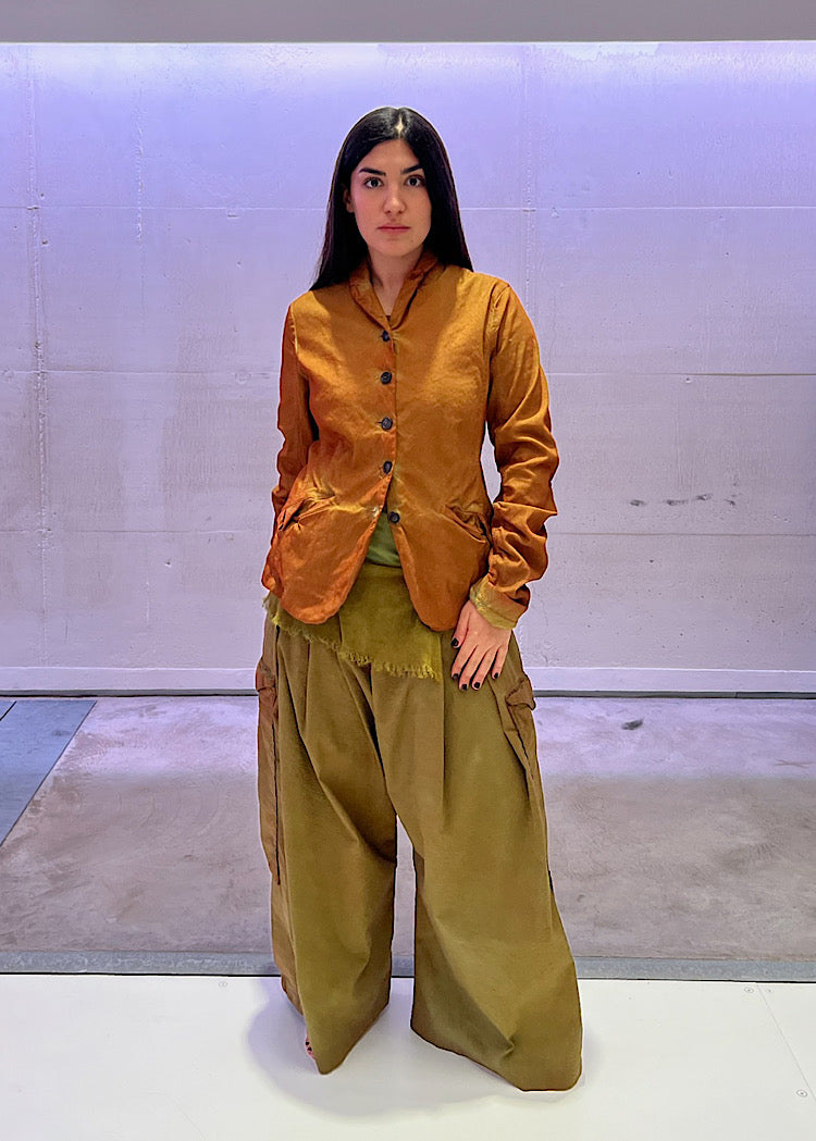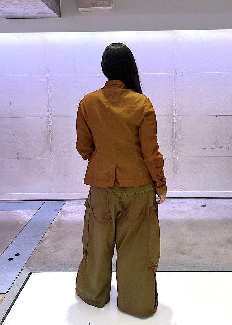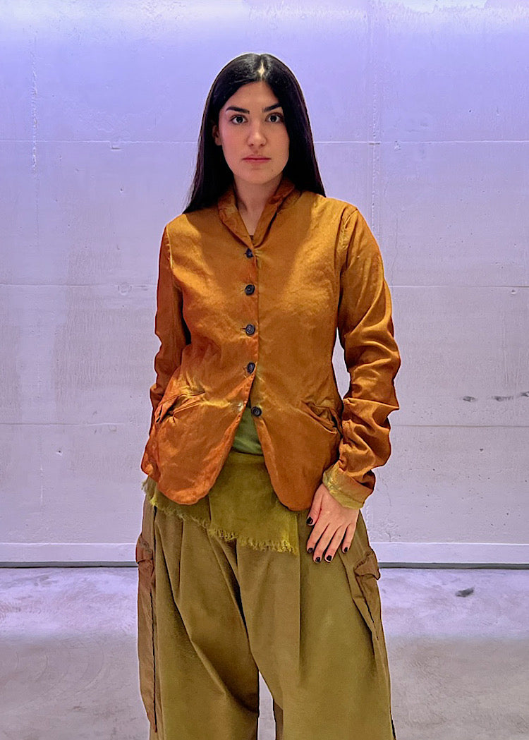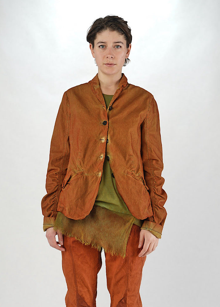 A stretch-fit jacket from RUNDHOLZ DIP, crafted from a distressed-dyed Cotton canvas with an experimental two-tone vintage wash. The fitted jacket features a stand collar, sculpted seams and angled front facing pockets for a contemporary look. Fastened at the front with buttons to close. Detailed with ruched sleeves.