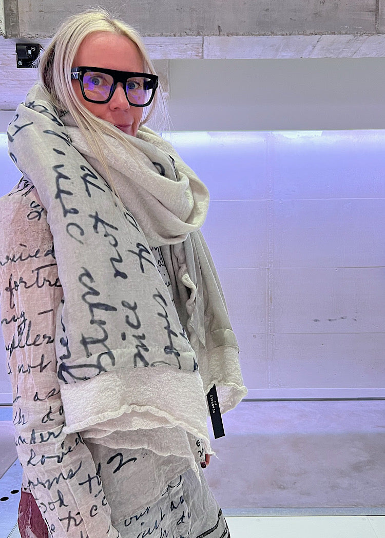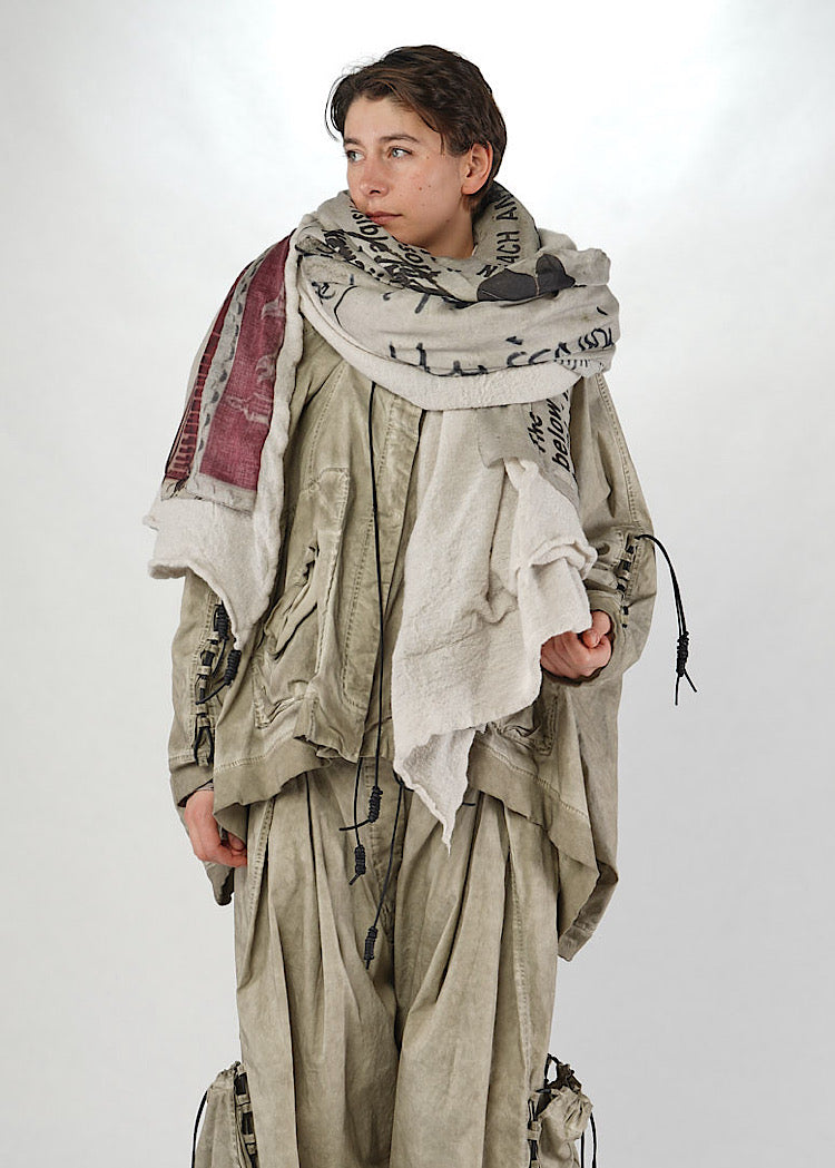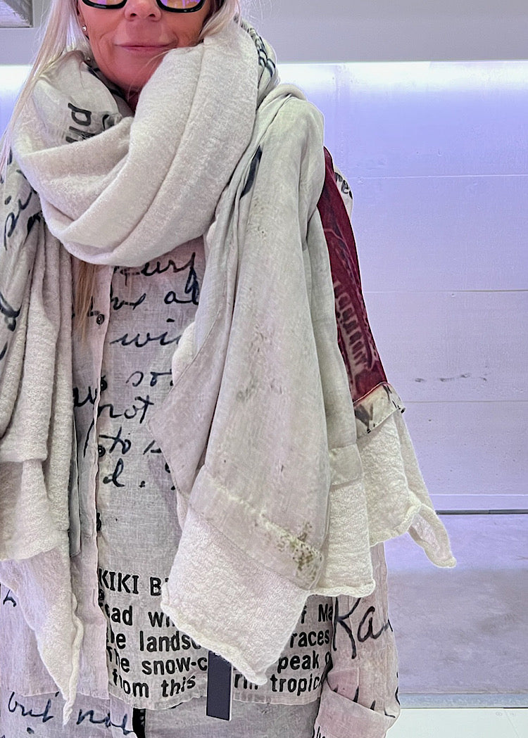 A knitted scarf from RUNDHOLZ DIP, crafted in a Wool-Mix fabric printed with nostalgic handwritten stamps and postmarks. Attached to an oversized Wool panel in a tonal, Sand Melange.