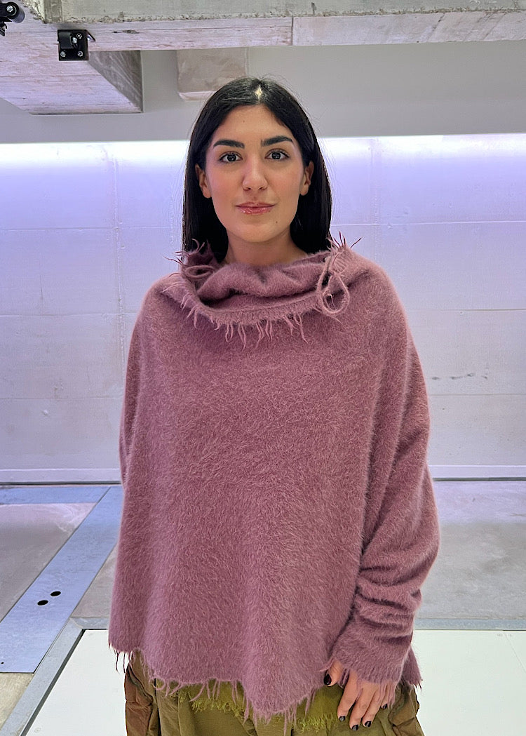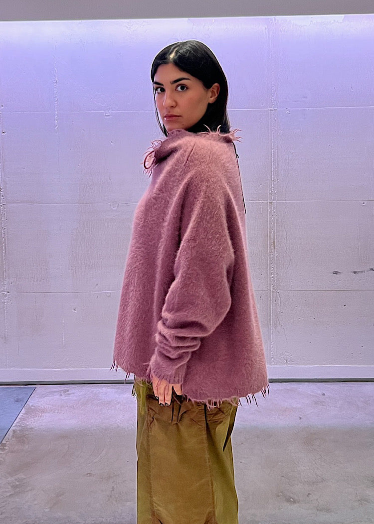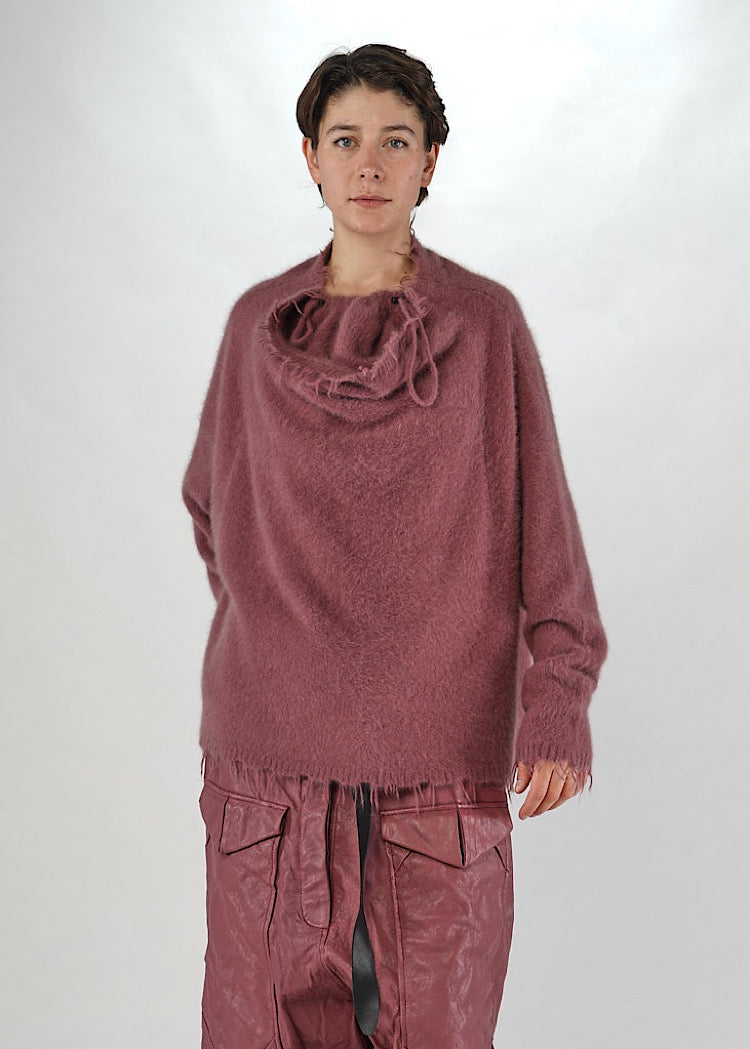 An oversized Pullover from RUNDHOLZ DIP in a luxurious Fox-Silk Mix blend. Designed with a relaxed silhouette, dropped shoulders and a slouchy neckline for an effortless drape. Finished with a drawstring feature at the neckline. Raw, frayed edges add a subtle deconstructed touch.