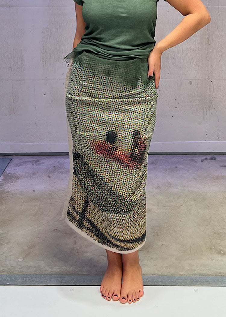 EDITOR'S NOTE : This statement skirt is a key piece in the AW25 collection - it channels the nostalgic postcard inspiration with bold, oversized graphics and handwritten details. The fitted silhouette and unique washed finish make them a standout piece—pair with a luxurious DIP pullover in a tonal colour block to let the print take centre stage or style with the co-ordinating fitted jacket for a statement look.