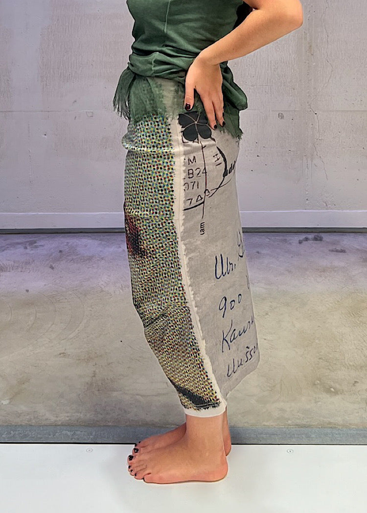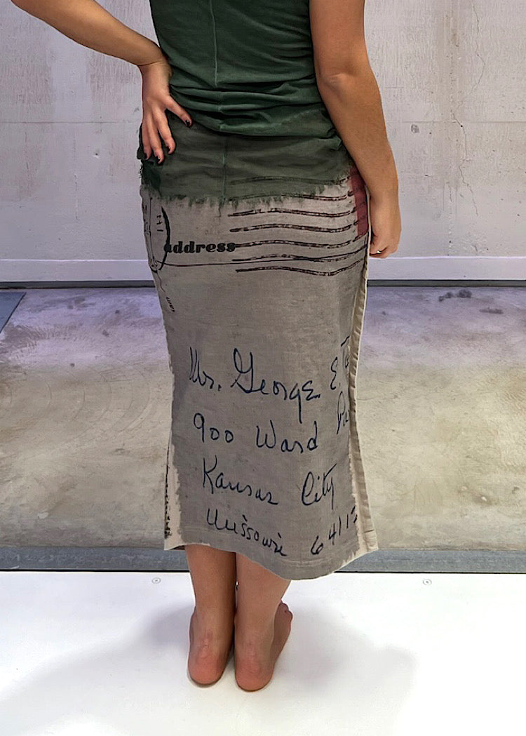 A classic shaped Skirt from RUNDHOLZ DIP, crafted from a stretch-fit canvas Cotton. This pull-on style is printed with pixelated graphics at the front and nostalgic handwritten stamps and postmarks to the back.