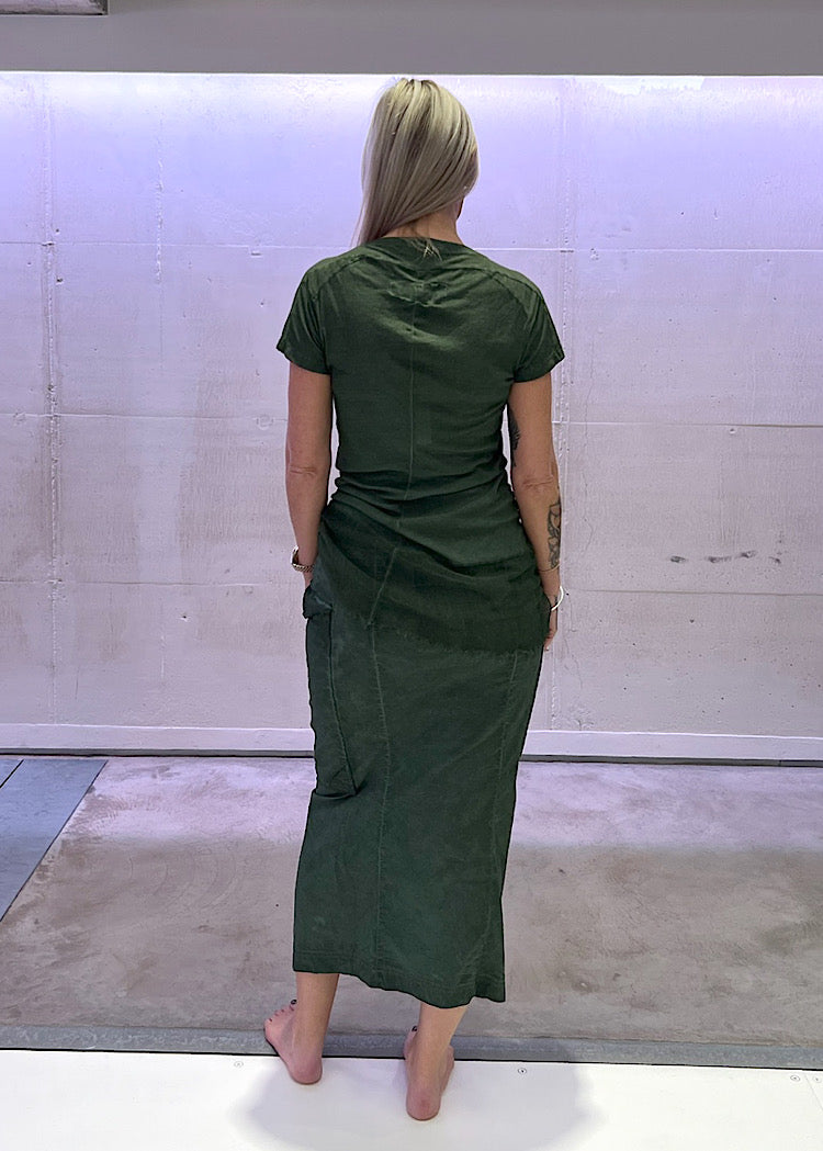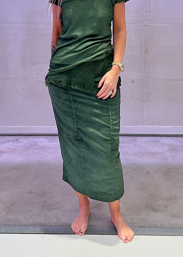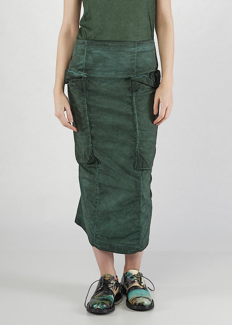 A fitted skirt from RUNDHOLZ DIP AW25, crafted from an elasticated Cotton-Mix fabric for a comfortable pull-on fit. Finished with a distressed-dyed for a washed finish. Features a signature RUNDHOLZ silhouette with sculptural patch pockets and vertical seam details.