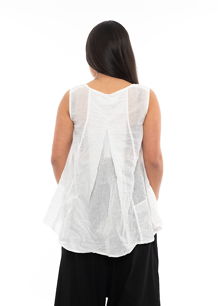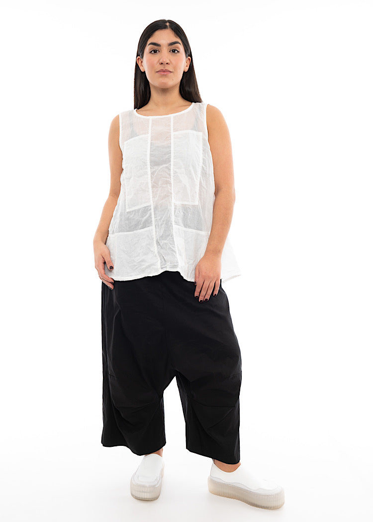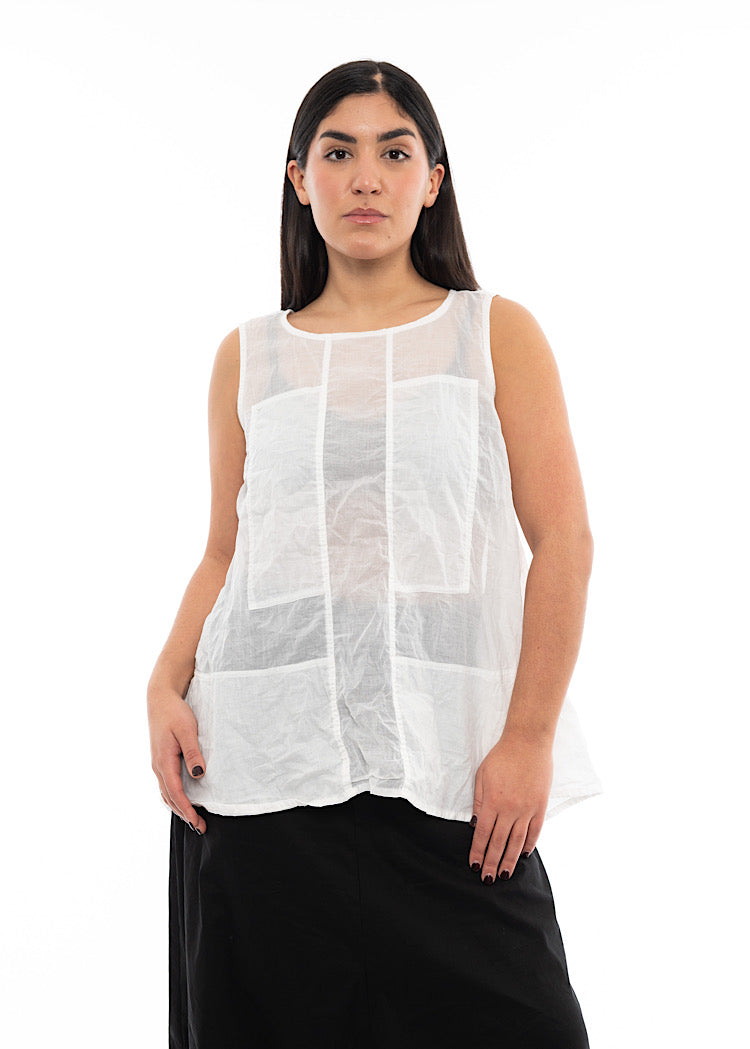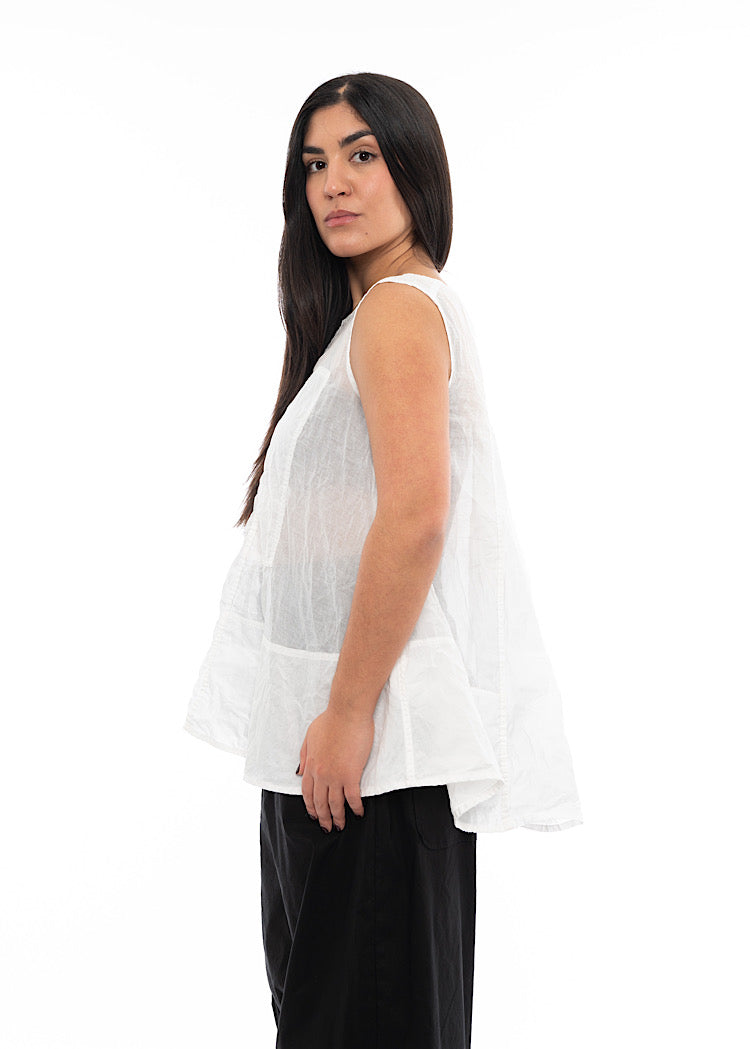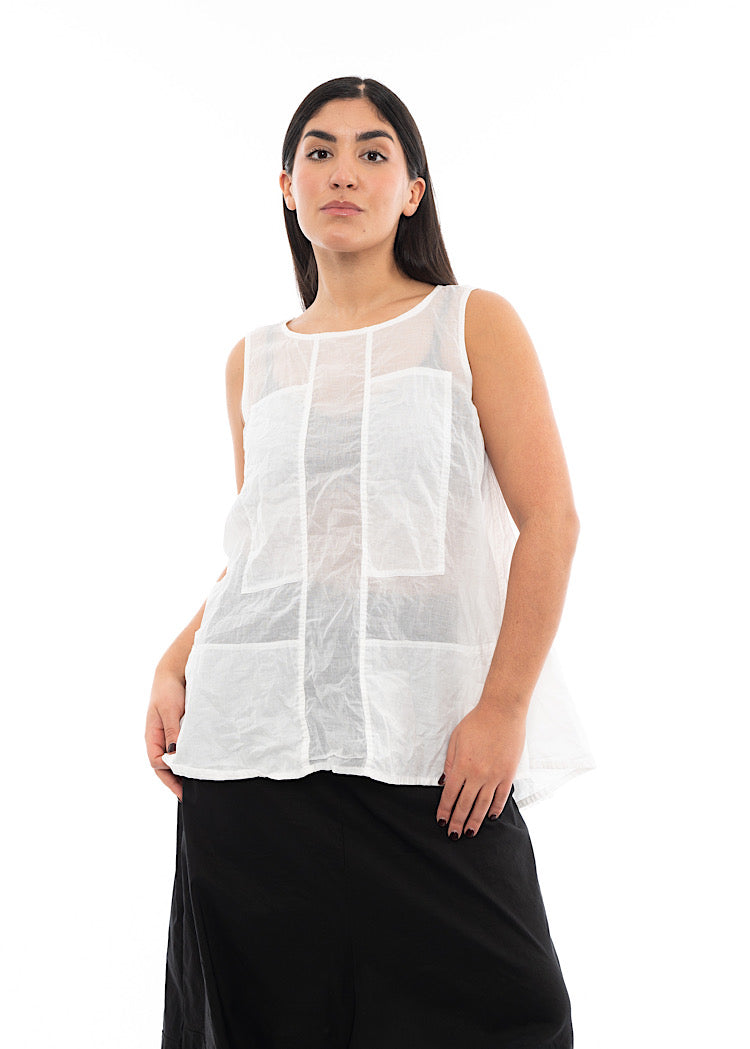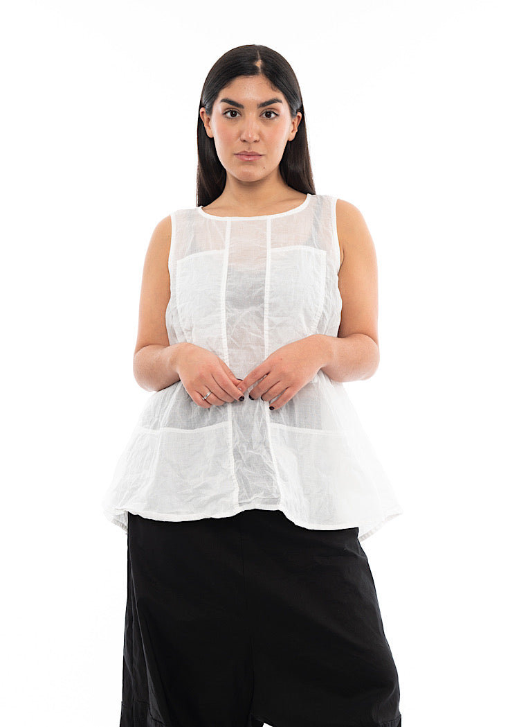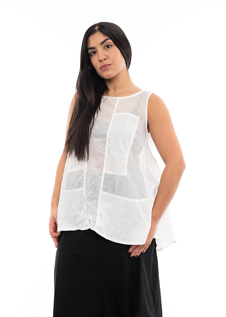 A sleeveless, lightweight t-shirt by RUNDHOLZ DIP for the Spring/Summer Collection. This top is in a semi-sheer cotton fabric with panel details to the front with a rounded neckline and finished with a vent detail on the back.