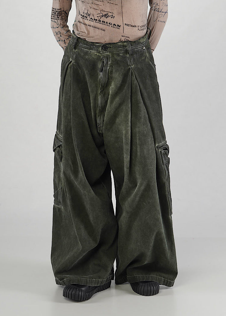 A denim wide-leg trouser from RUNDHOLZ DIP AW25, crafted from soft distressed-dyed Cotton with a washed vintage finish. Featuring oversized pockets, detailed with sculptural folds. Finished with classic Denim Jeans styling, including a fixed waistband, belt loops, inset side pockets and a zip fastening placket.