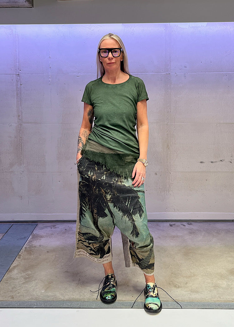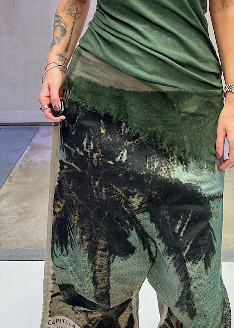 Inspired by the faded charm of vintage postcards, the RUNDHOLZ DIP AW25 collection transforms nostalgic memories into bold, textured statements. This season experiments with scale: archival postcard images are magnified into pixelated, abstract prints. The resulting mash-up of colours, from pine greens, sunlit oranges to muted sands and deep lagoon blues reflects the unique palette of old travel postcards, reimagined with DIP’s signature artistic edge.