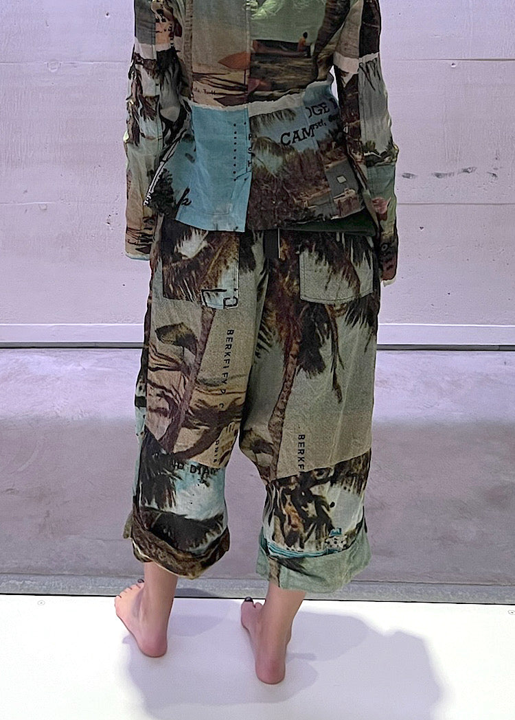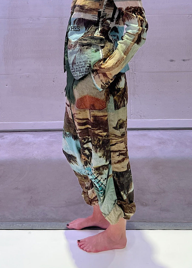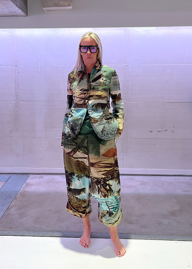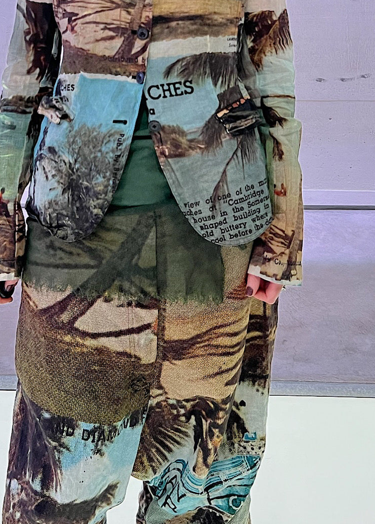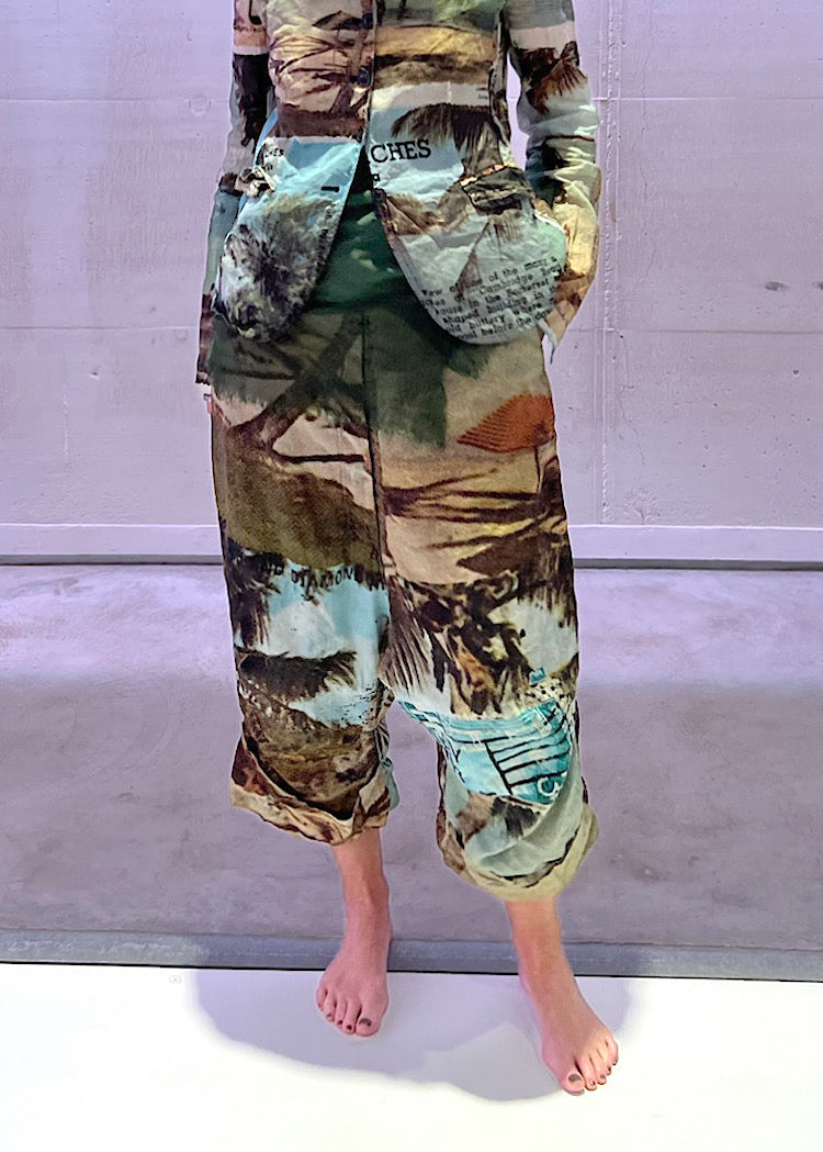 EDITOR'S NOTE : These statement RUNDHOLZ DIP printed drop-crotch trousers capture the spirit of vintage postcards with oversized handwritten script and typewriter text in the Backside Print. The lightweight, crinkled Cotton adds an effortless feel, while the neutral tones make it easy to style with everything from the co-ordinating fitted jacket to an oversized knitted pullover in a tonal colourway. It’s a playful yet sophisticated piece that brings a sense of nostalgic storytelling to your Autumn/Winter wardrobe. We recommend styling Backside Print with the Crab colourway to pull through the rusted red postal stamp print.
