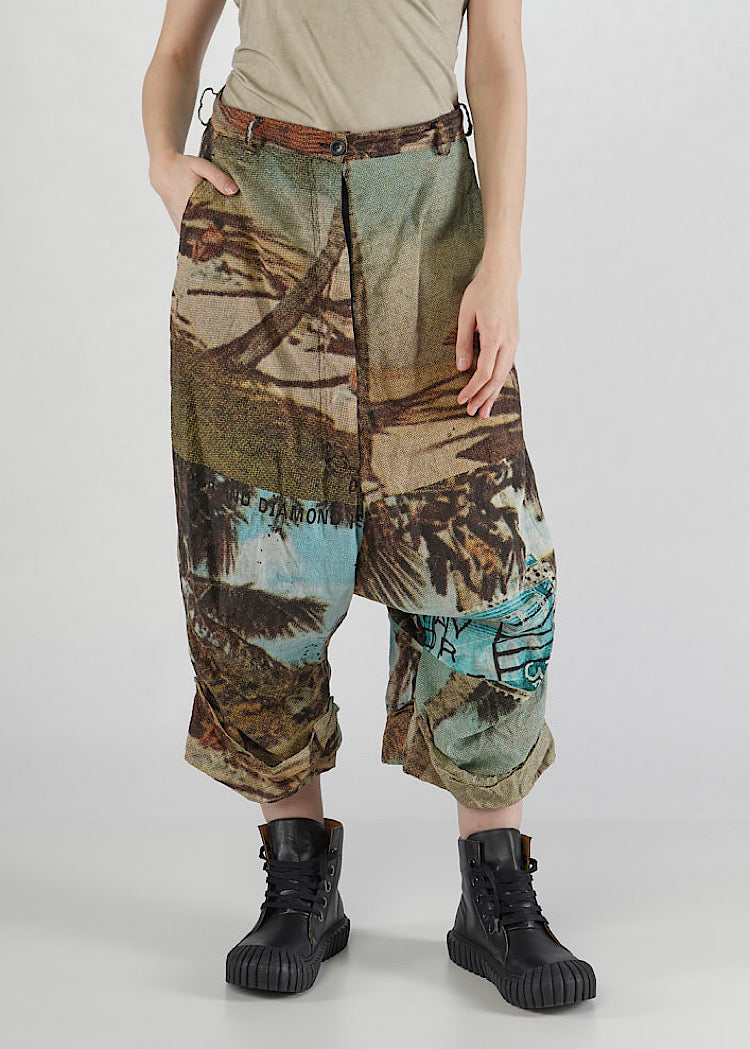 A relaxed drop-crotch trouser from RUNDHOLZ DIP, crafted from a lightweight Cotton printed with nostalgic handwritten stamps and postmarks (Not as photographed). This cropped, wide-leg side features a fixed waistband, button placket, cuff detail and pockets to the side and back.